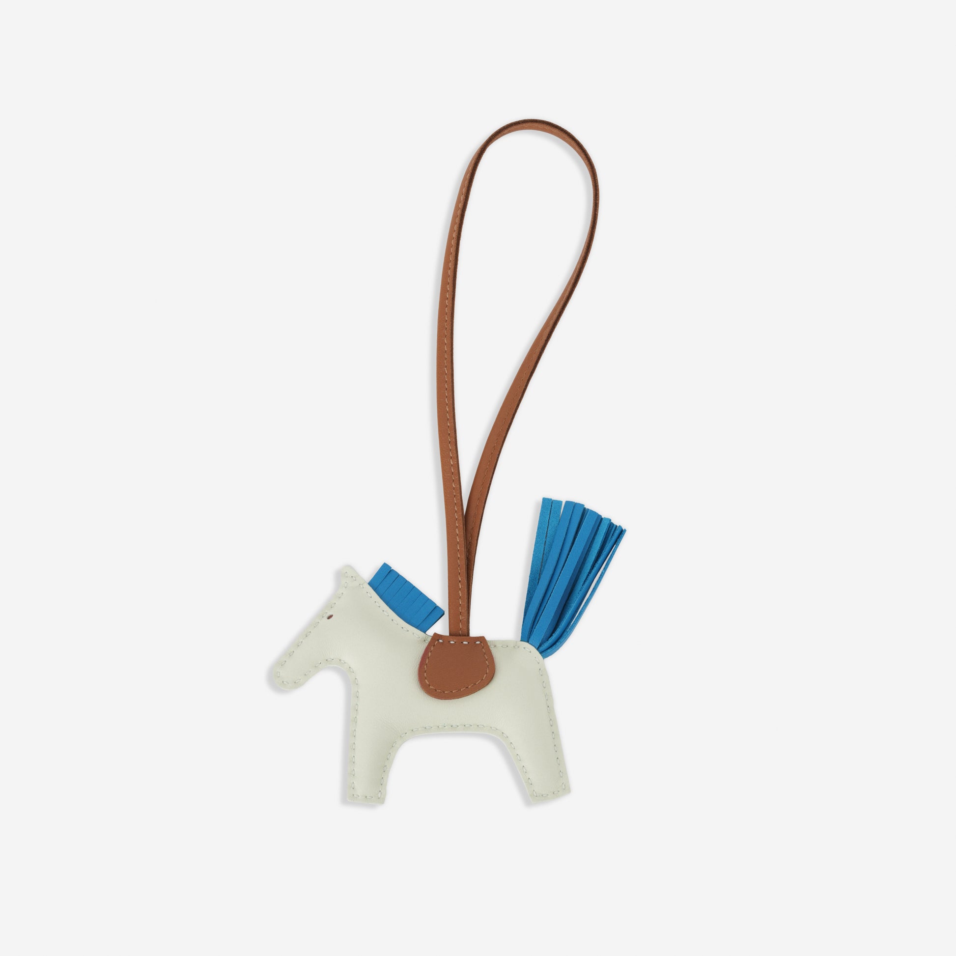 The Hermès Rodeo PM bag charm is a joyful accent piece, handcrafted in supple Agneau Milo leather. This version features a vibrant trio of Vert Fizz (body), Bleu Zanzibar (mane and tail), and Gold (saddle) - a colourful and rare combination that pops beautifully against both neutral and bold Hermès bags.