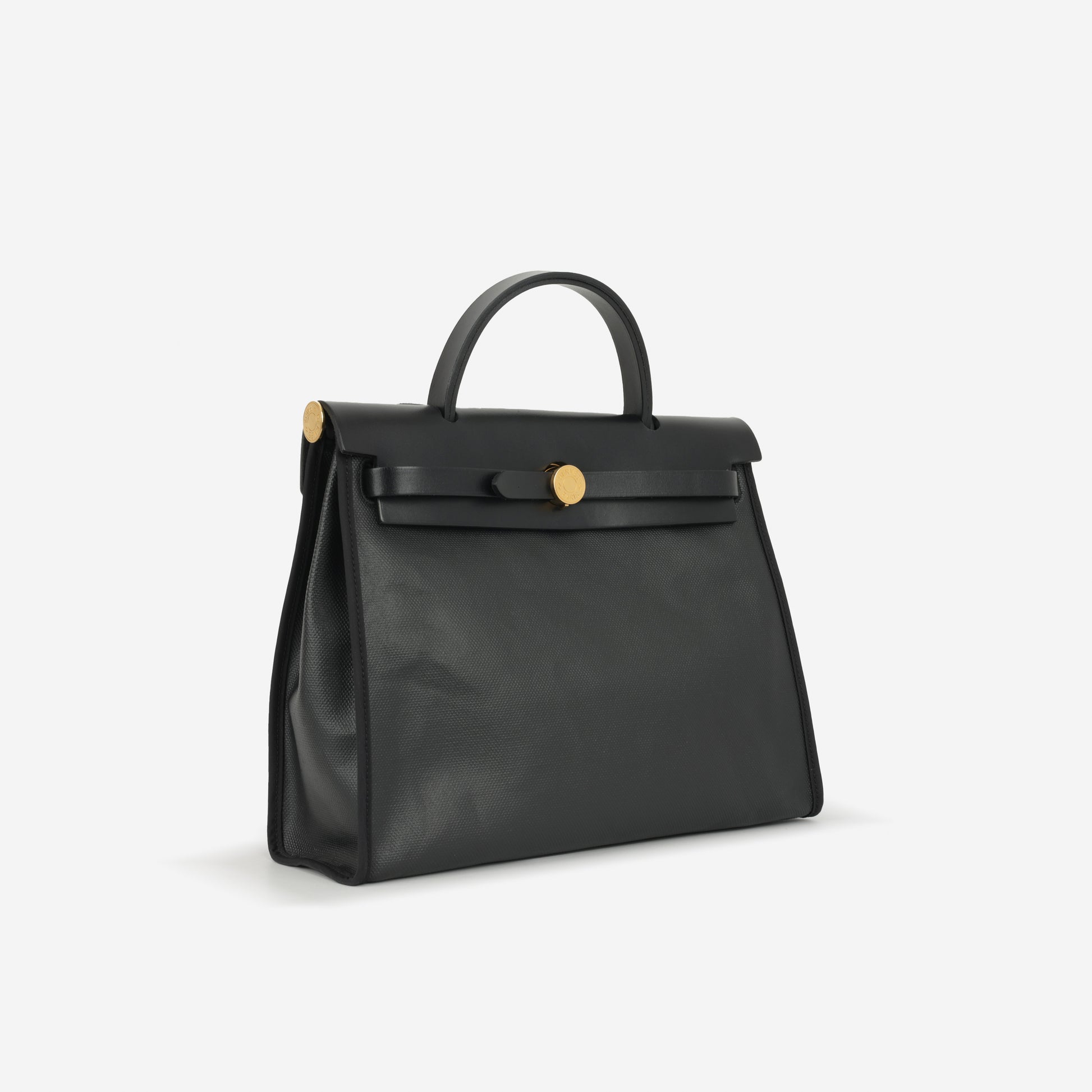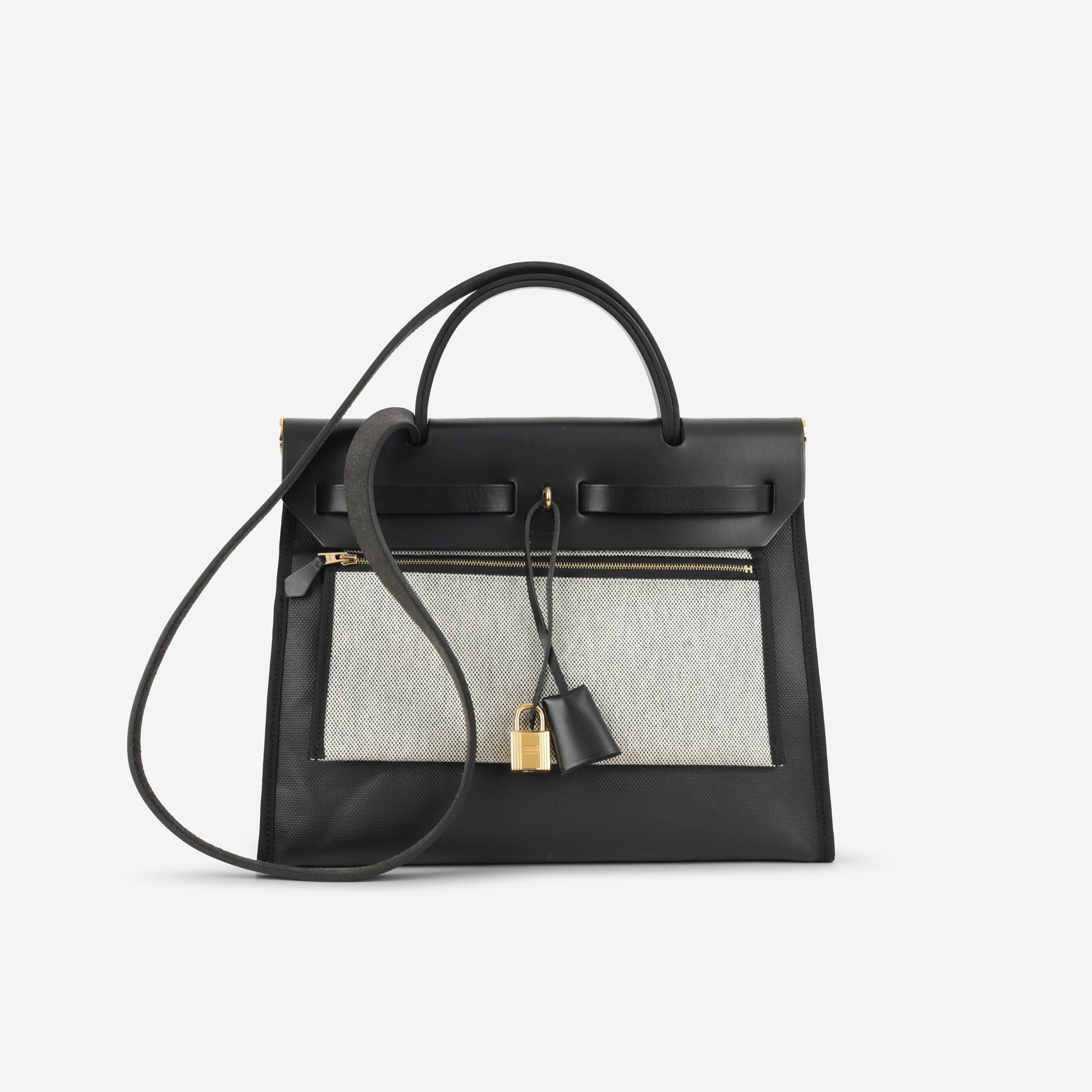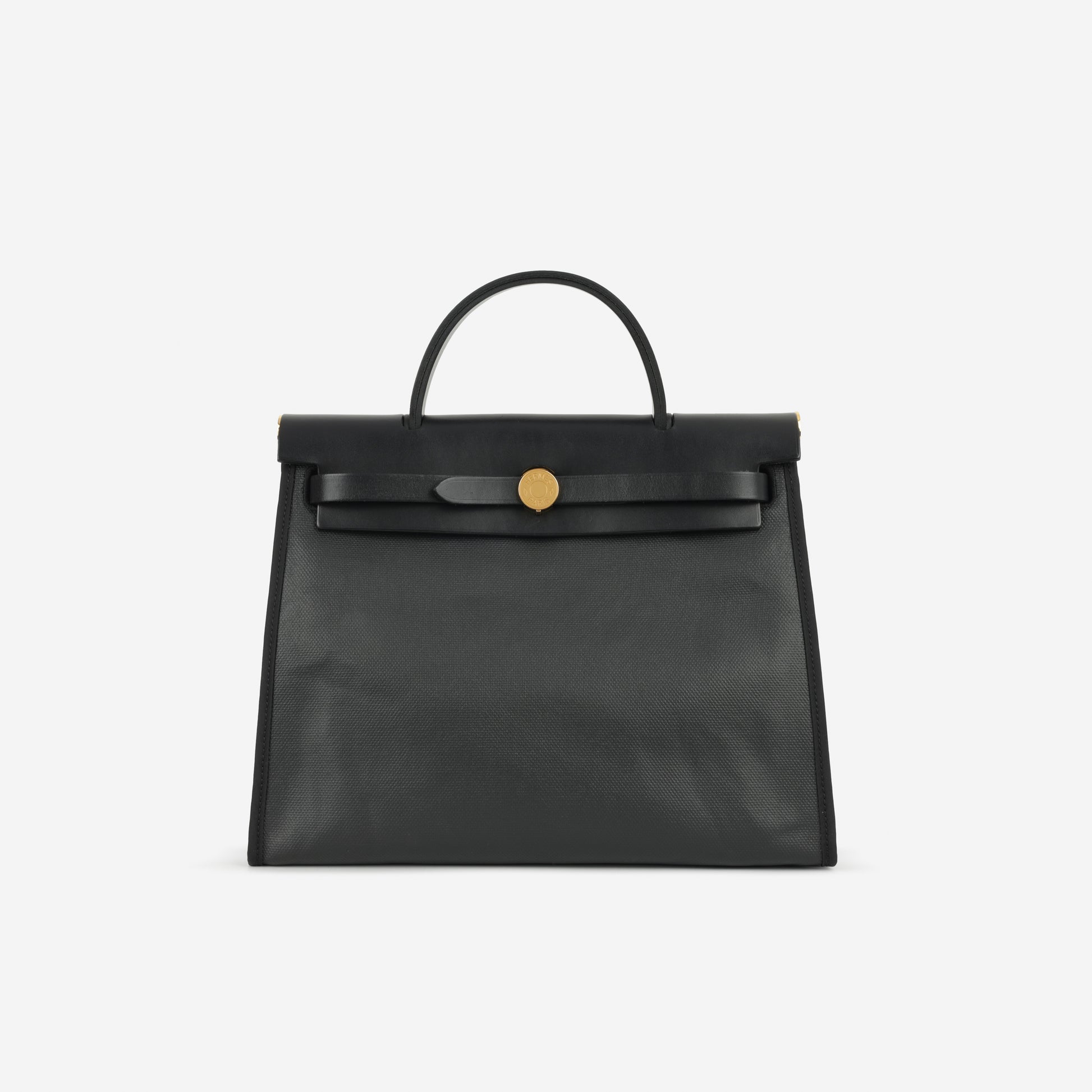 The Hermès Herbag 31 in black Berline toile with Hunter leather and gold hardware, featuring a B stamp (2023 production). A structured top-handle silhouette with flap closure and detachable shoulder strap.