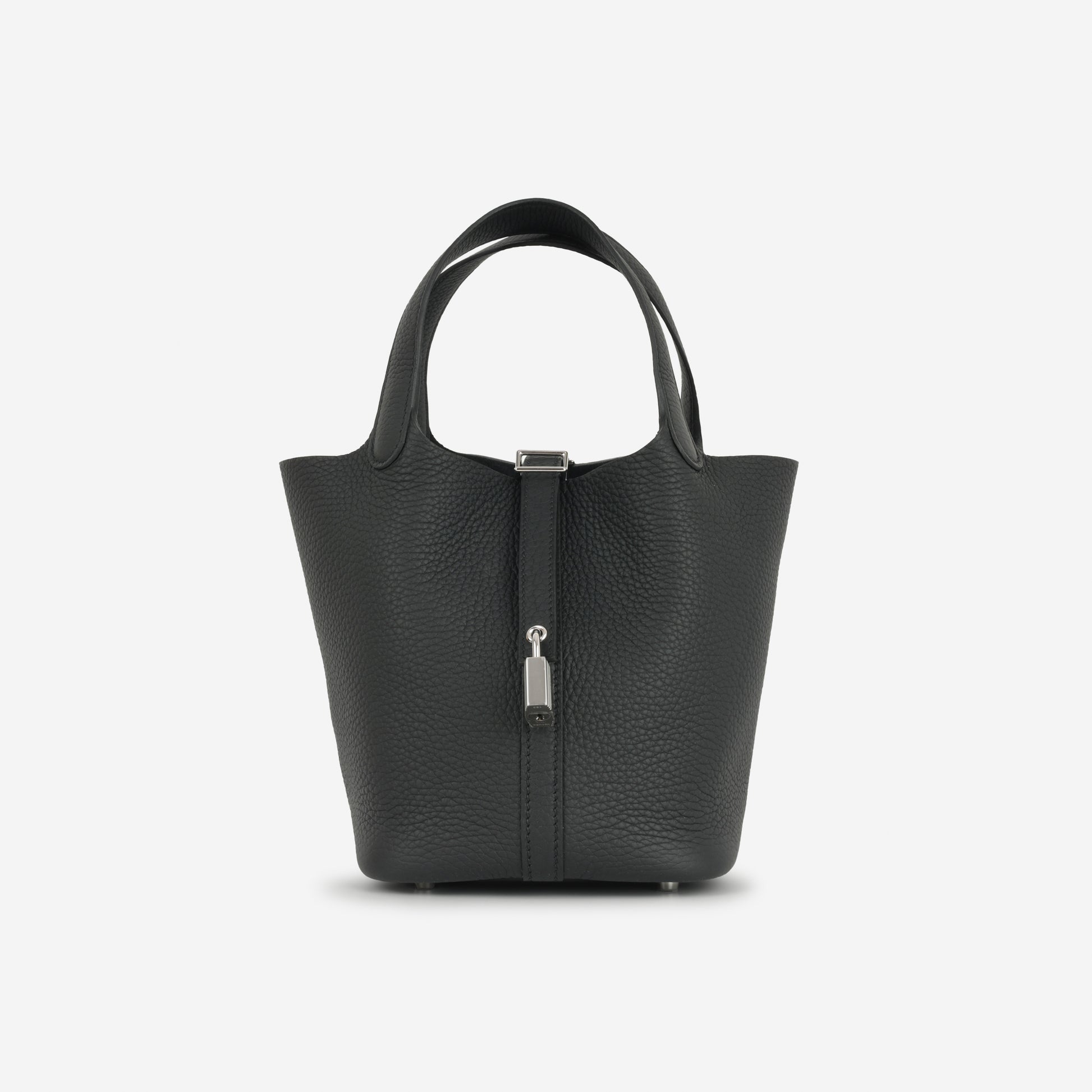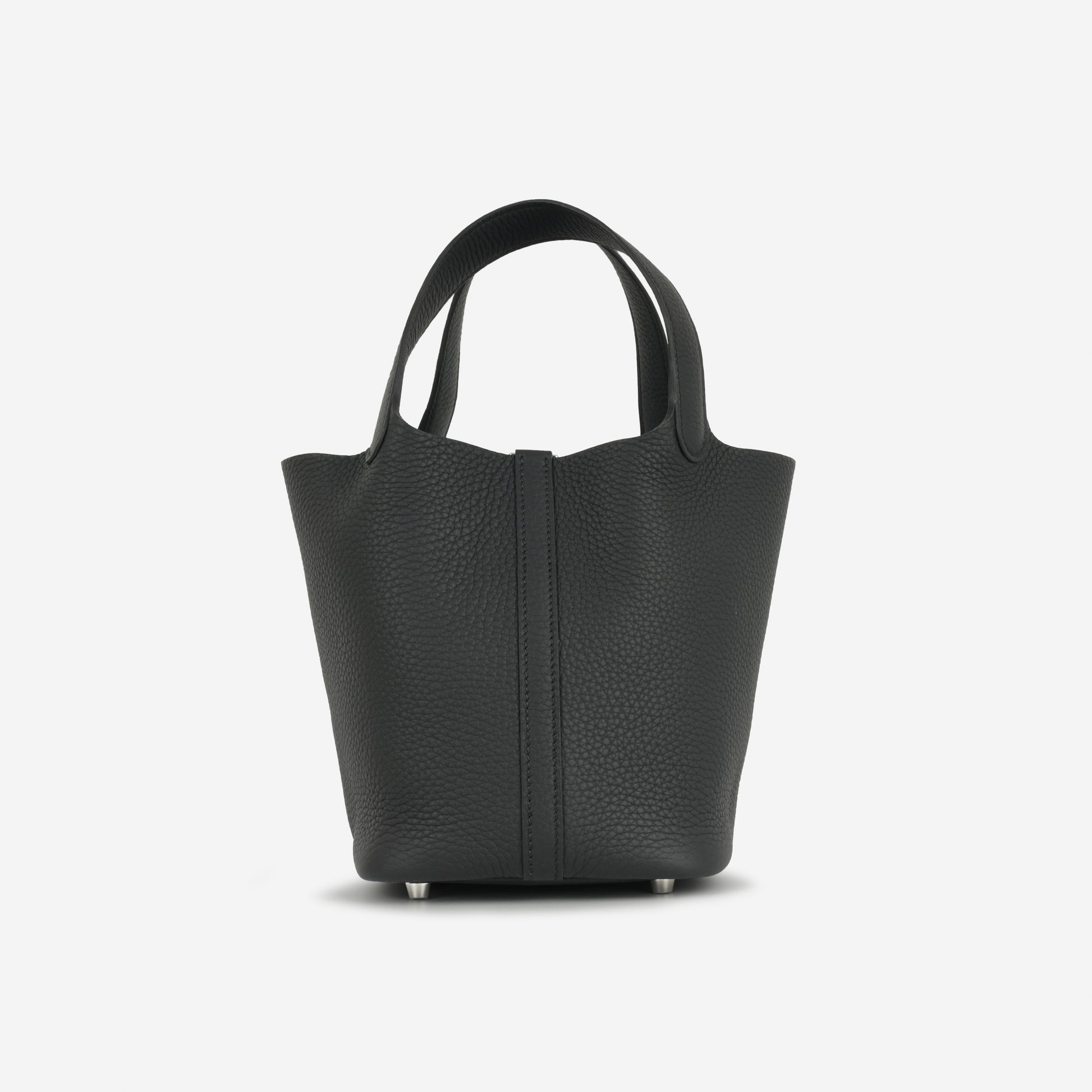 l;./The Hermès Picotin 18 is a symbol of understated elegance and timeless craftsmanship. Designed with inspiration from equestrian styles, this minimalist tote is crafted from supple Noir Clemence leather and accented with refined palladium hardware. Its clean silhouette and relaxed bucket shape make it both practical and effortlessly chic.
