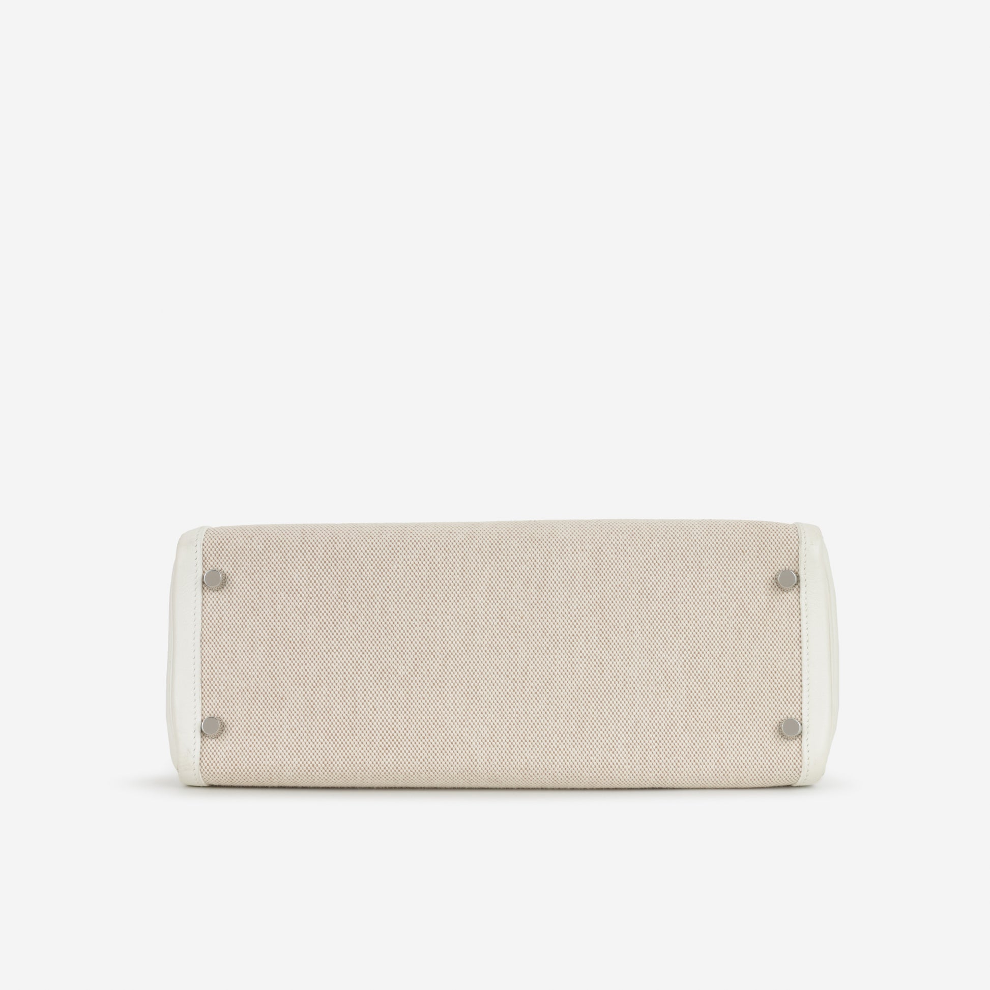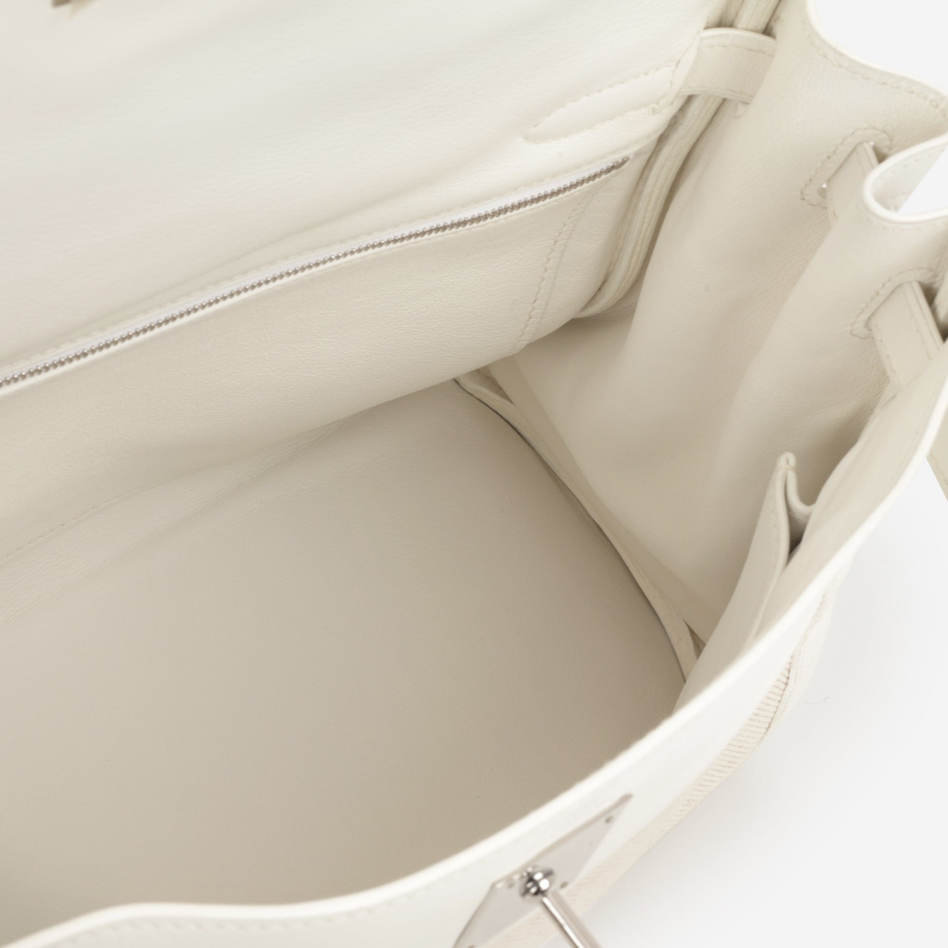 This Hermès Vintage Kelly 32 is crafted in a distinctive combination of Blanc Swift leather with Ecru Toile canvasand finished with Palladium Hardware. Produced in 2007 (K square stamp), this piece offers a refined, summery aesthetic within the timeless Kelly silhouette.