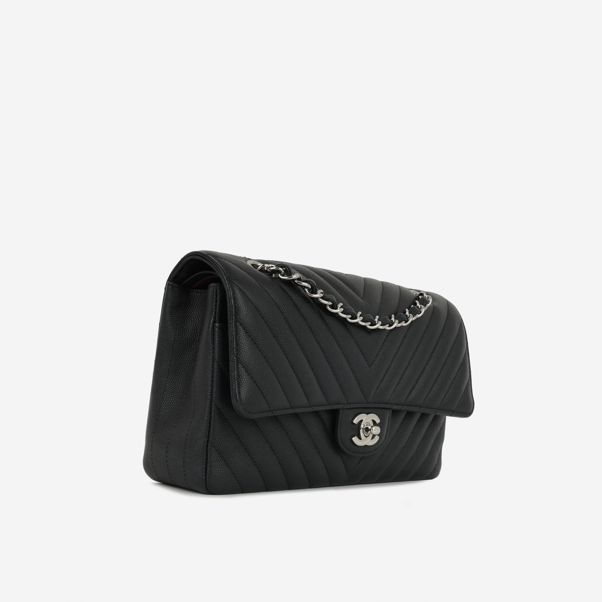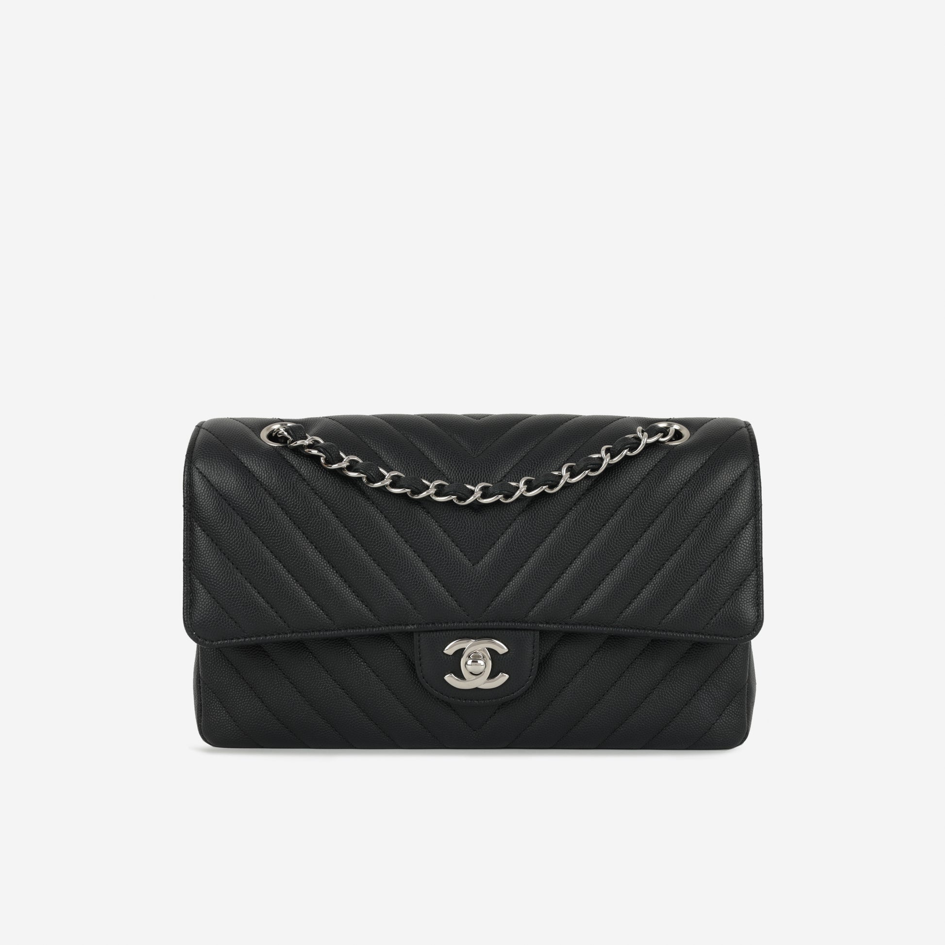 Elevate your style with the Chanel Medium Classic Flap in black chevron leather, featuring elegant silver hardware. This iconic designer handbag combines timeless sophistication with versatile luxury, perfect for everyday wear or special occasions.