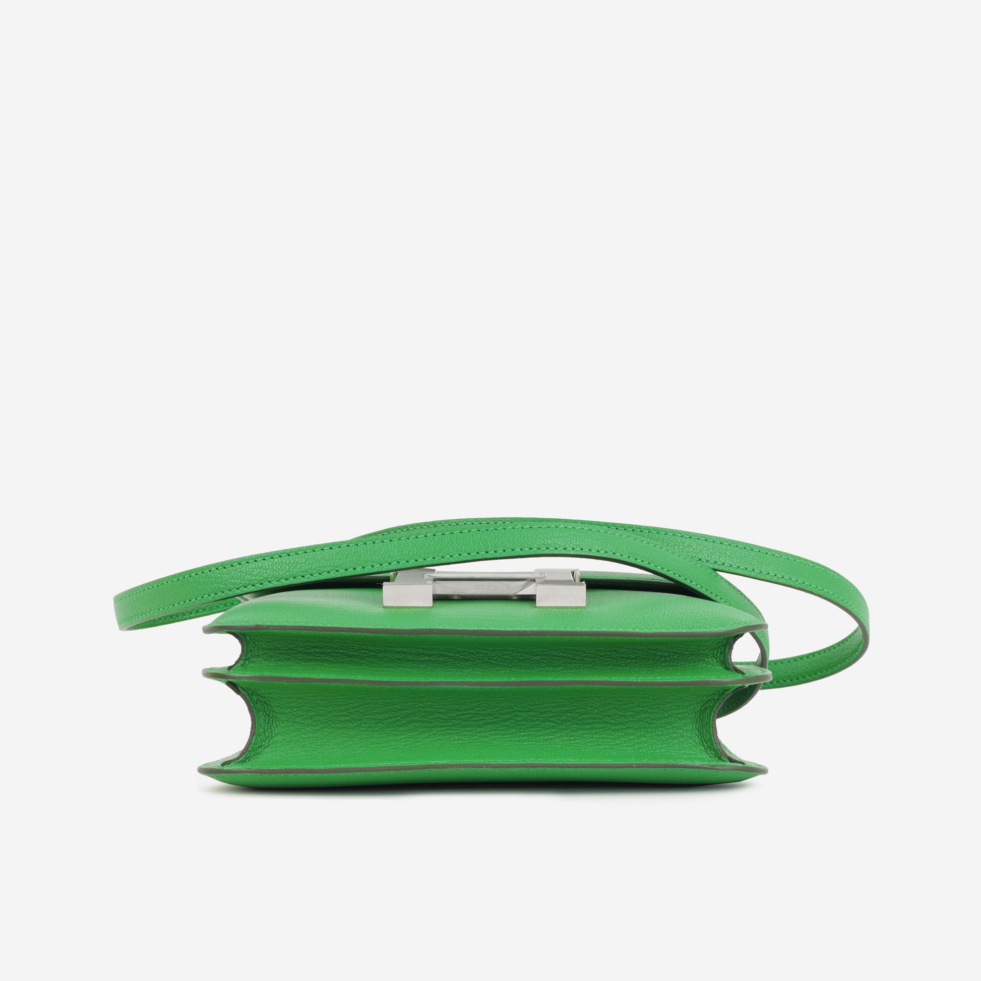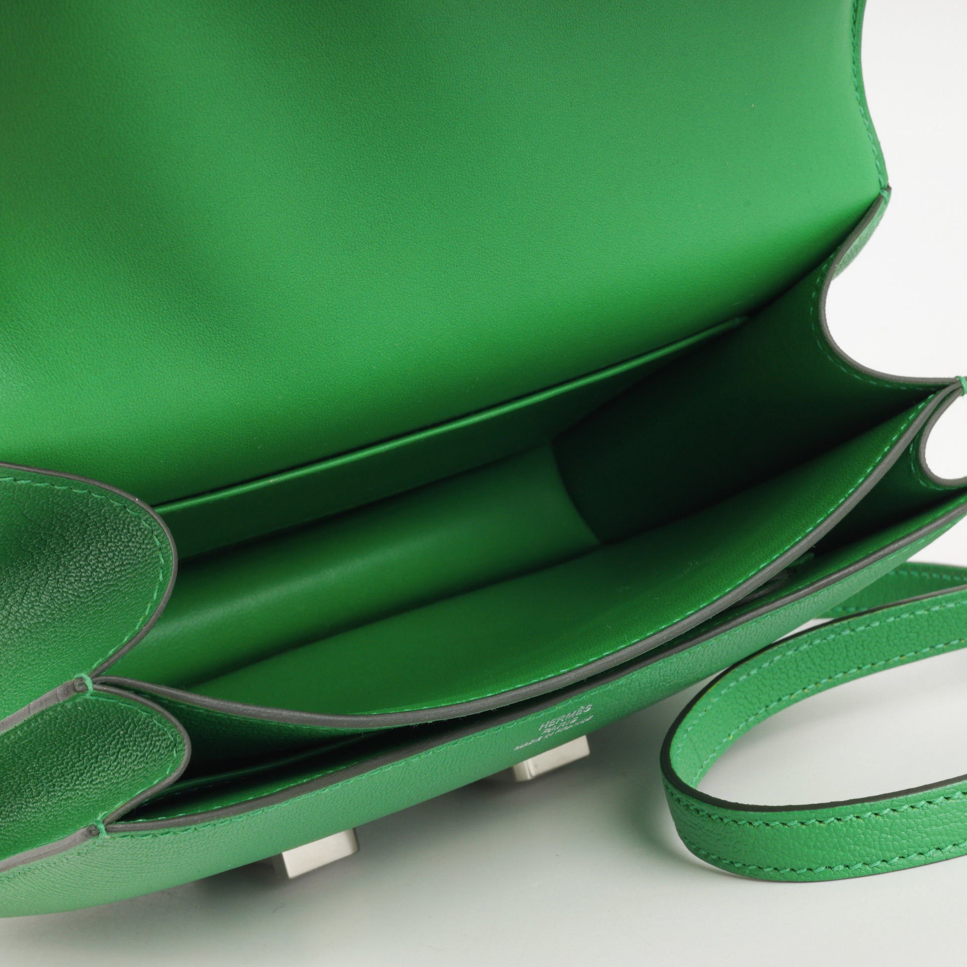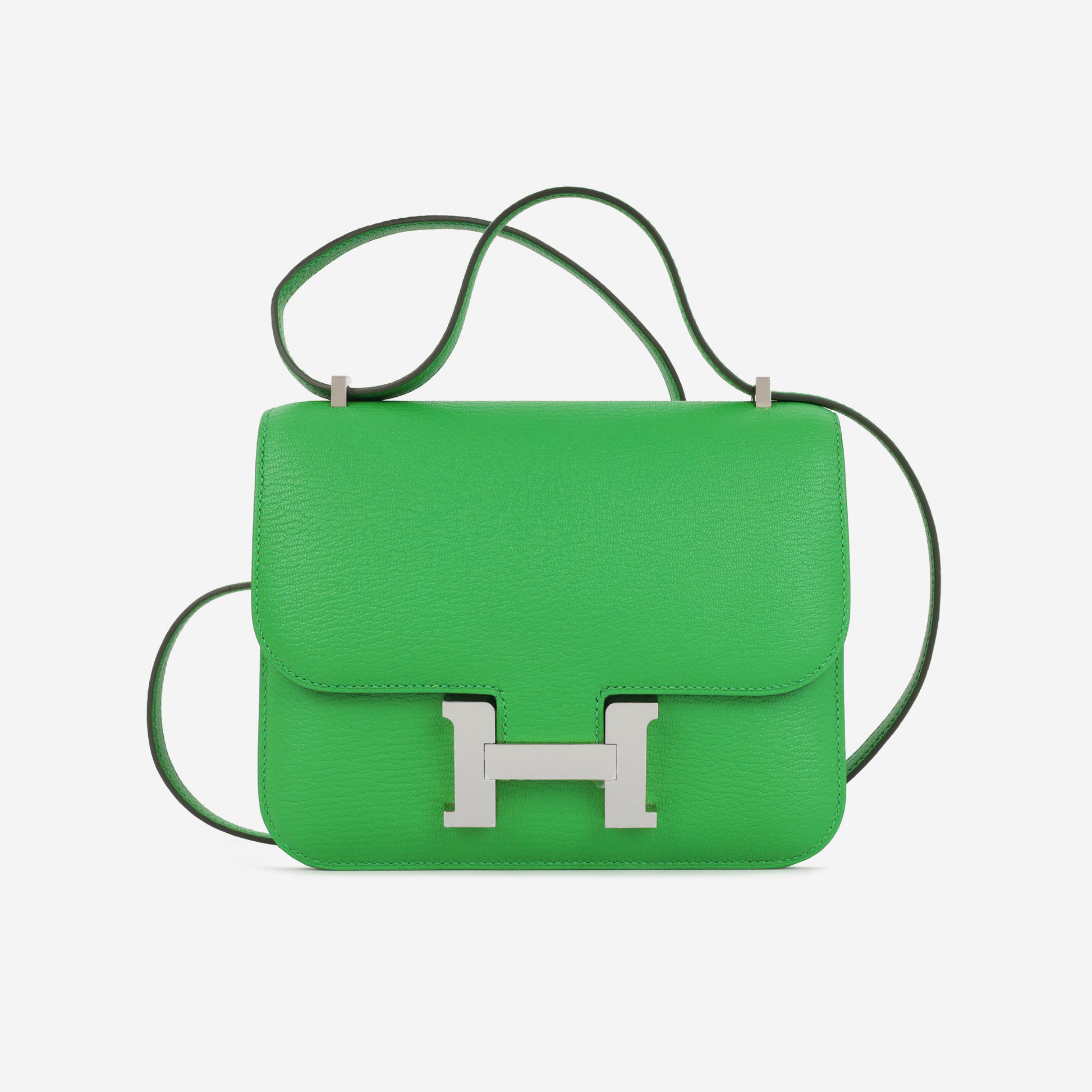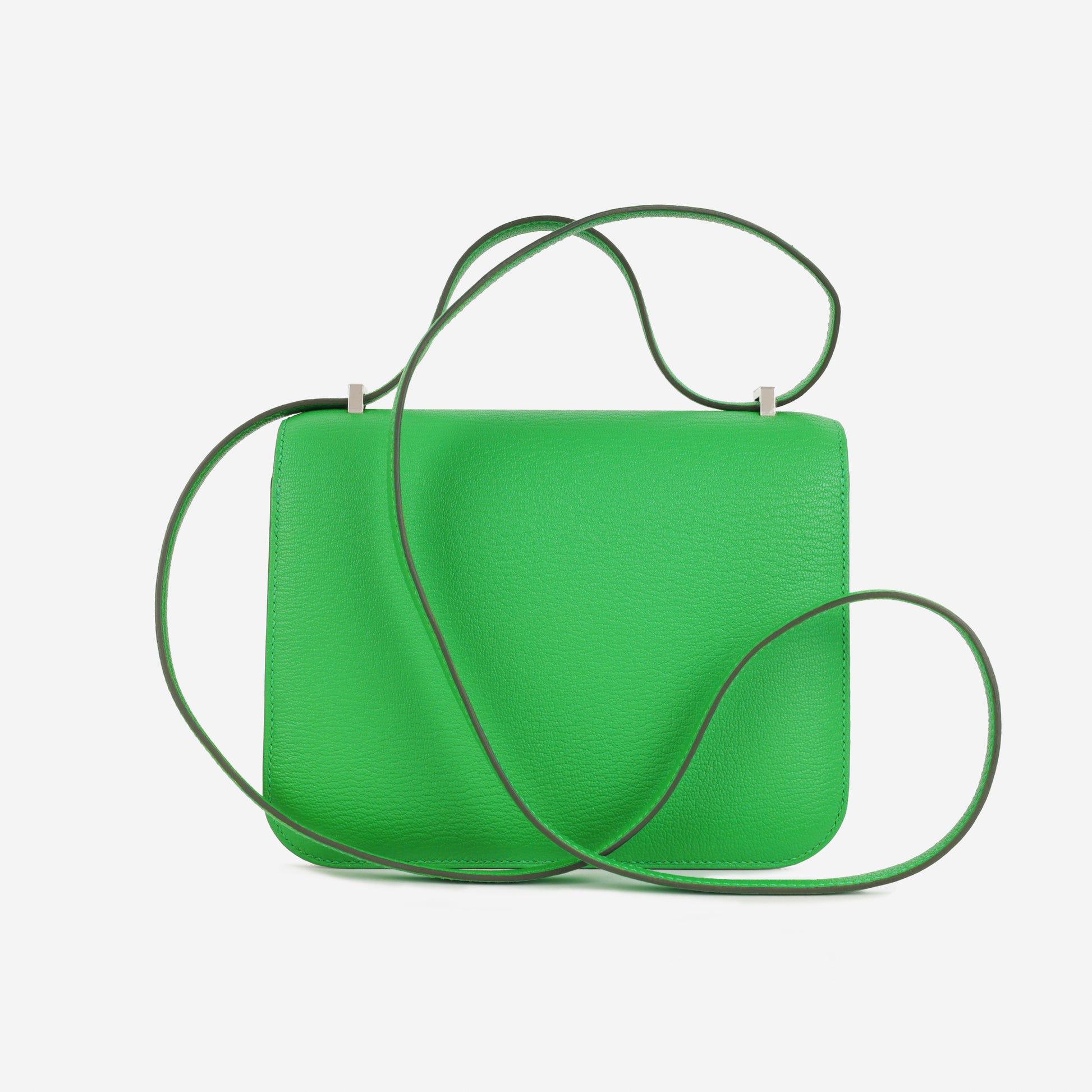 Vibrant and sophisticated, the Hermès Constance 18 in Bambou Chèvre leather with palladium hardware is a true symbol of modern elegance. The striking Bambou green hue adds a refreshing pop of colour, while the fine-grained Chèvre Mysore leather provides a luxurious sheen, durability, and lightweight feel. Finished with the signature “H” clasp in gleaming palladium, this compact Hermès icon perfectly balances chic style and timeless craftsmanship.