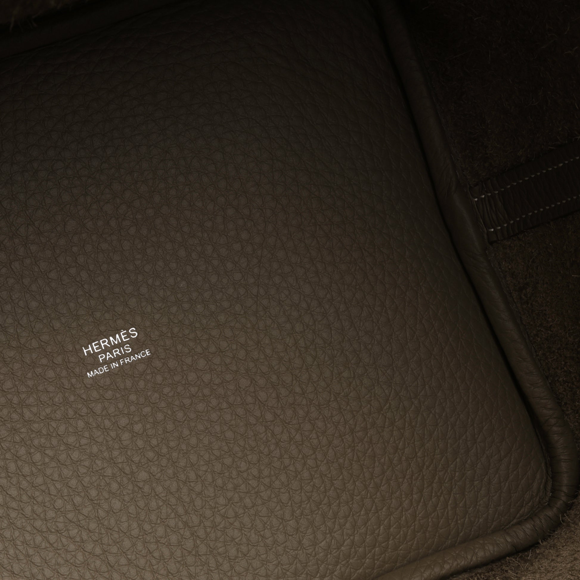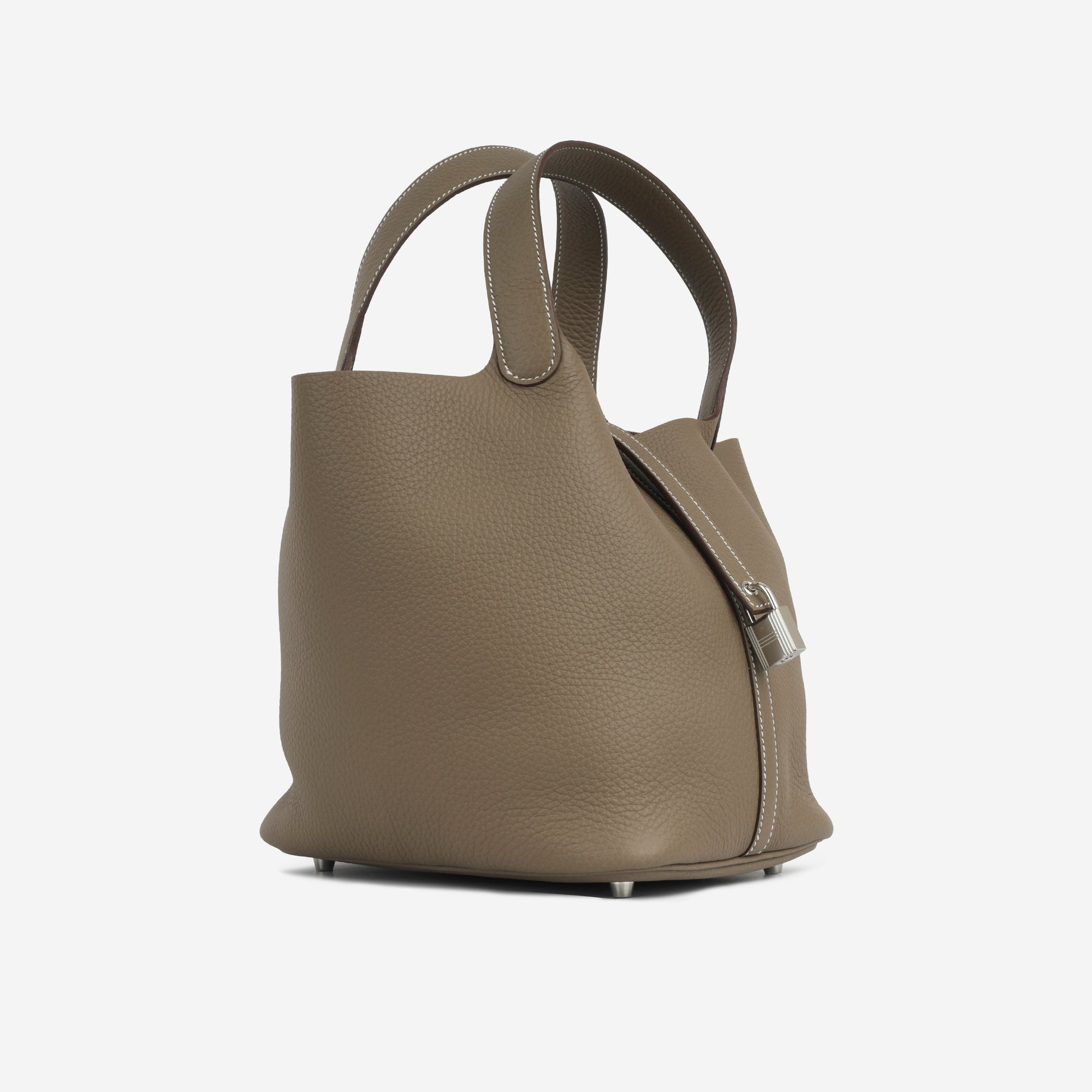 Carefully crafted from supple, textured leather, Hermès presents their stunning Picotin 22 bag in a beautiful combination of Etoupe Clemence and palladium tone hardware. Hermès is acclaimed for their leather quality, as well as being at the very top of the fashion hierarchy. Simple, elegant, and understated, each Hermès bag is timeless and tasteful.