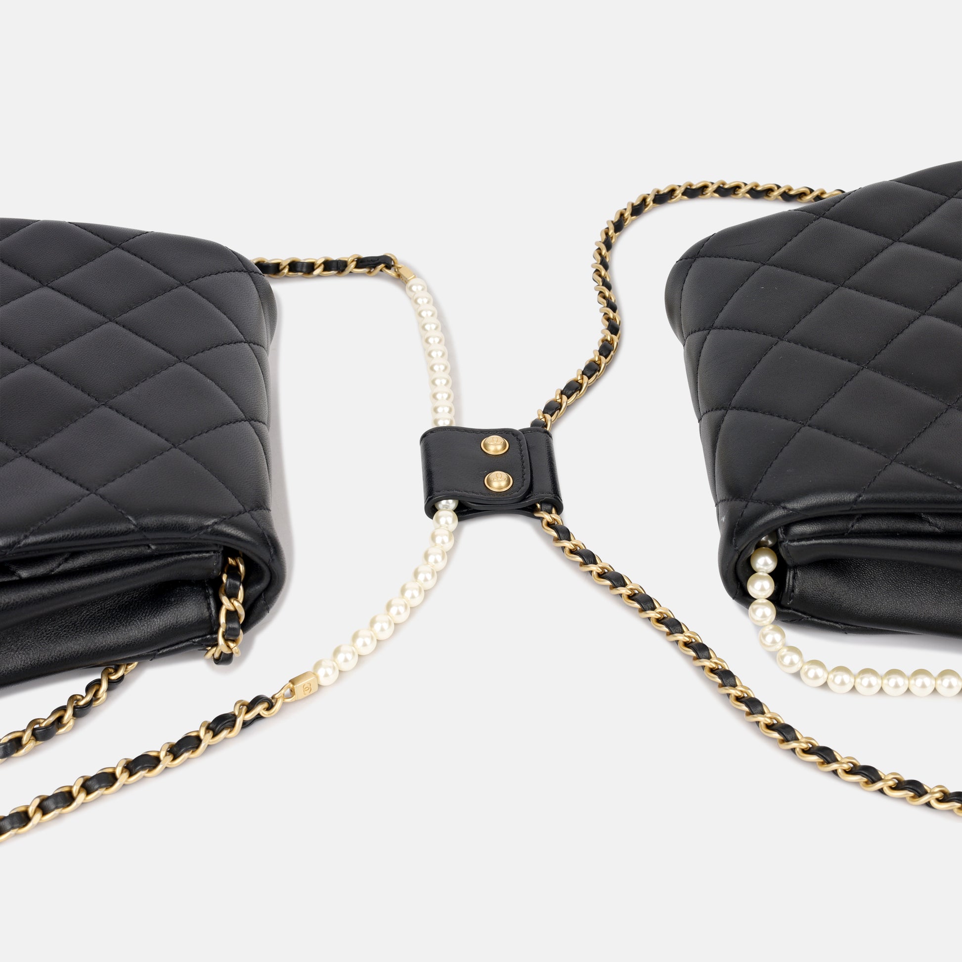 This unique flap bag set from Chanel is designed to be worn in duo crossing over each hip. The hardware emblem sits in the centre of the body to connect them. Both bags are conjoined and designed identically like twins. Created using black lambskin leather and champagne gold hardware, this bag remains iconic to the brand with these elements.