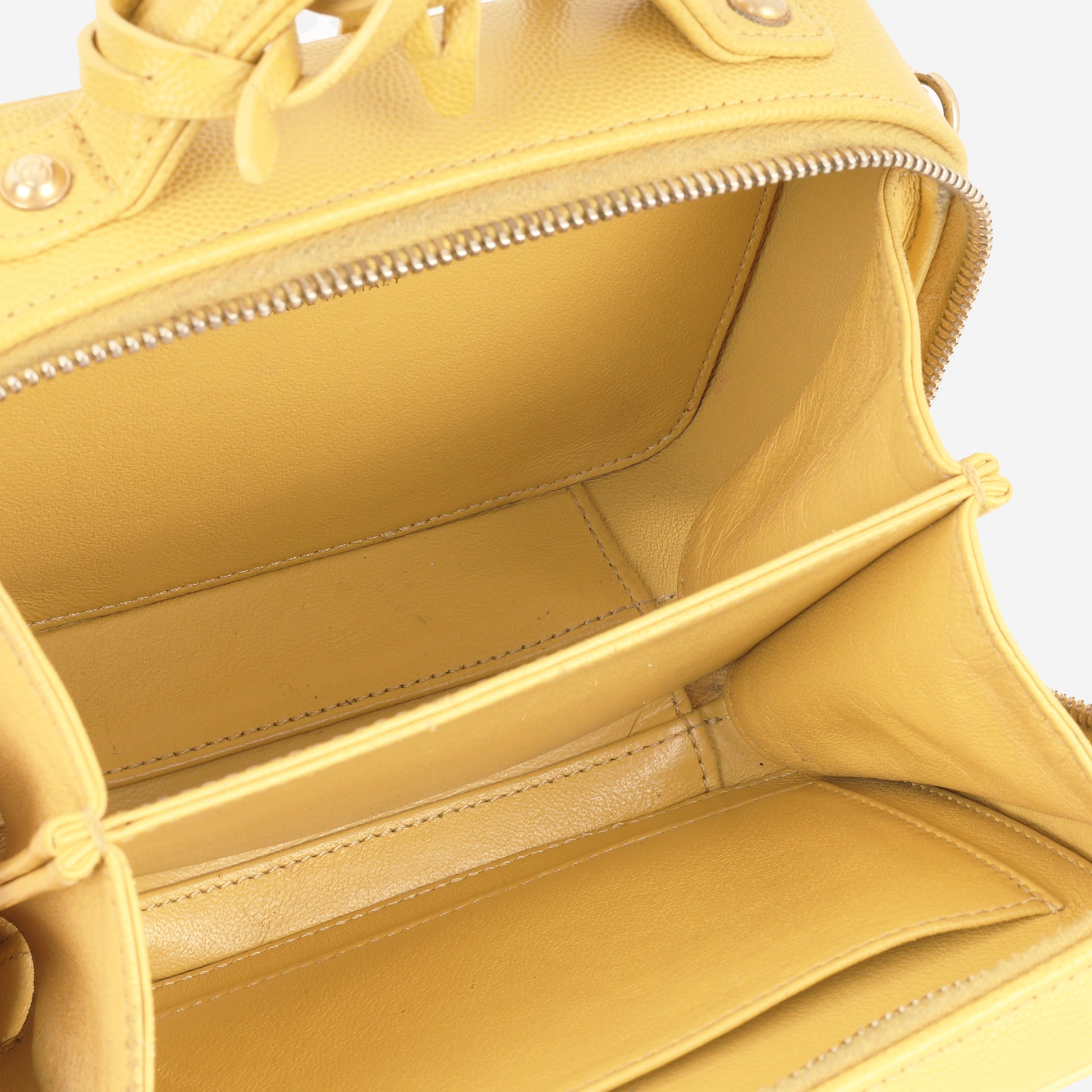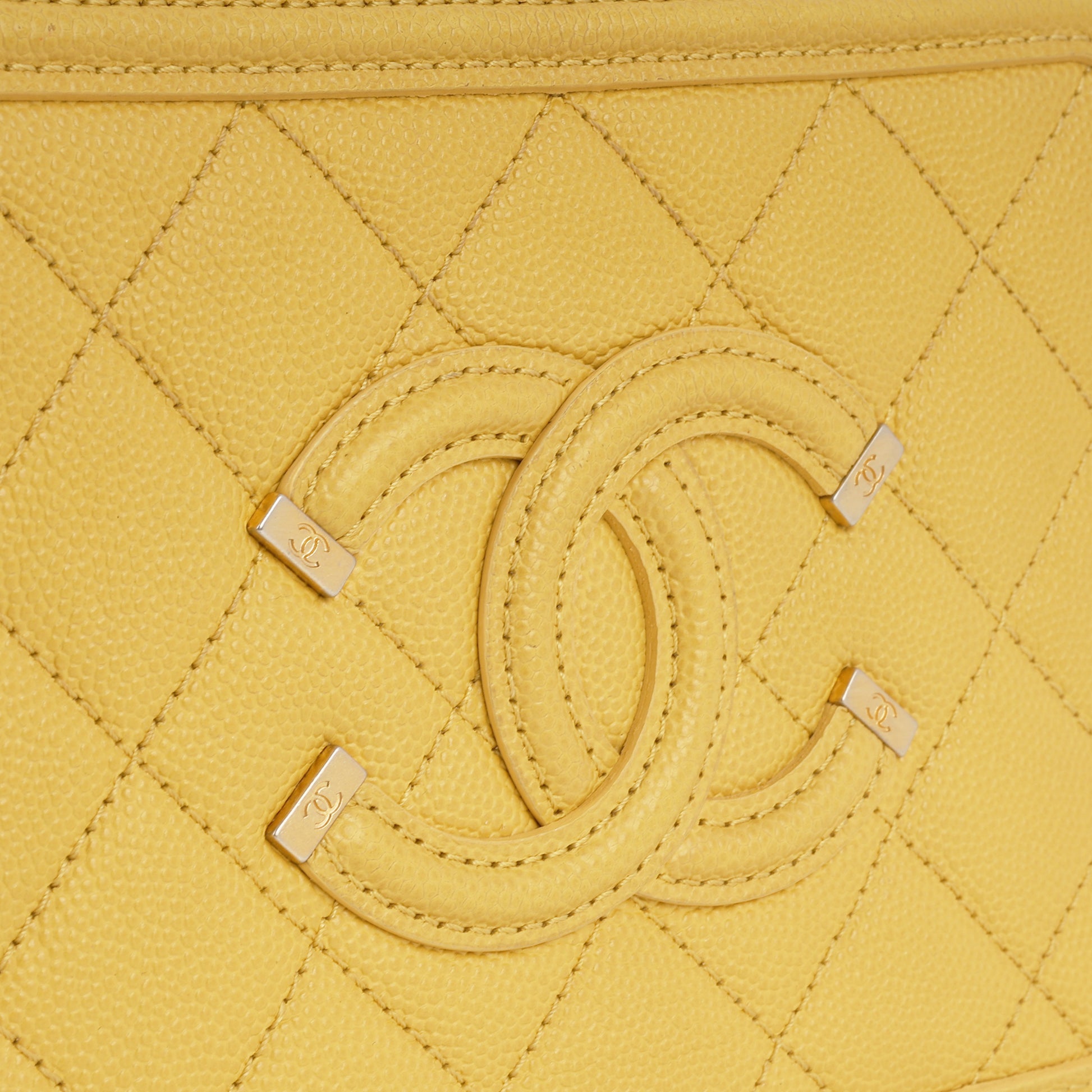 Brighten your collection with the Chanel Small Filigree Vanity Case in cheerful Yellow Caviar leather, finished with antique gold-toned hardware. Featuring the signature CC logo, top handle, and structured silhouette, this compact yet functional piece blends playful charm with timeless Chanel's elegance. Available exclusively at Bagista, London’s most trusted reseller.