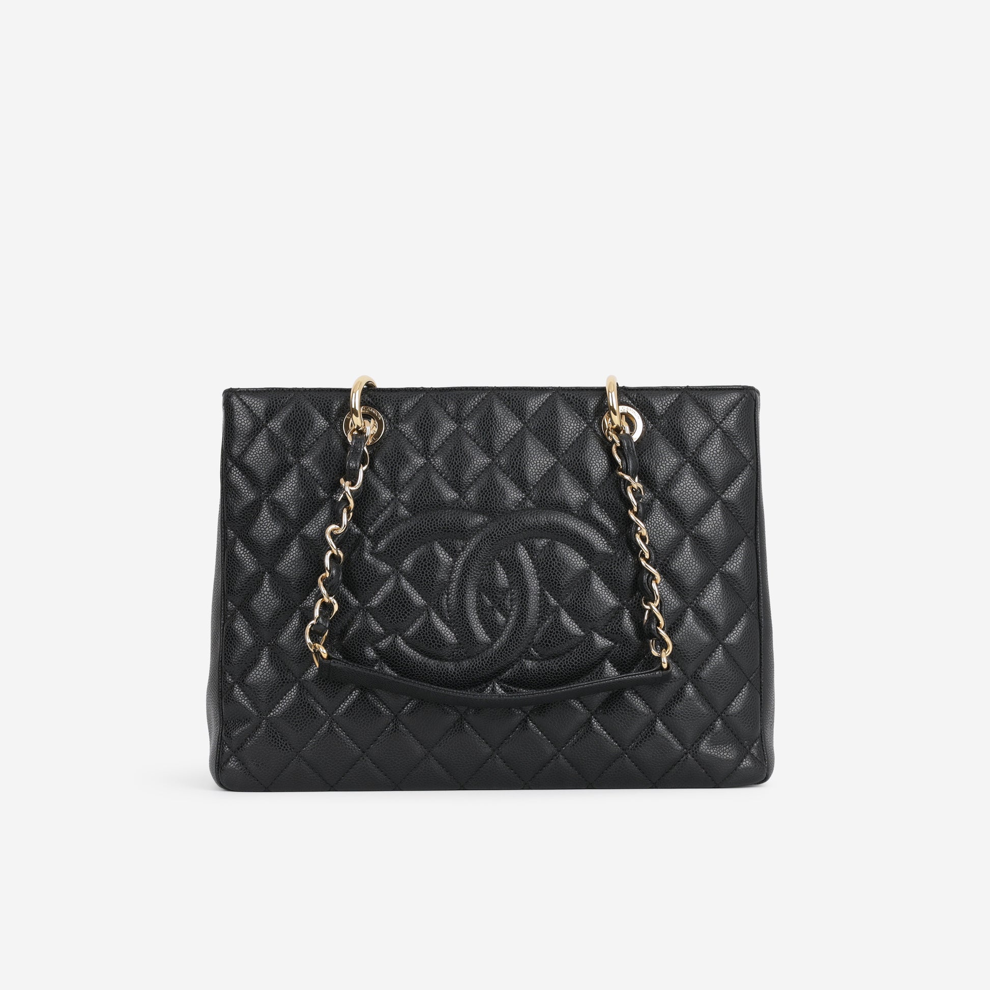 The Chanel GST (Grand Shopping Tote) in black caviar leather with gold hardware from the 2013 production. A classic tote silhouette featuring dual shoulder straps and CC logo detailing.