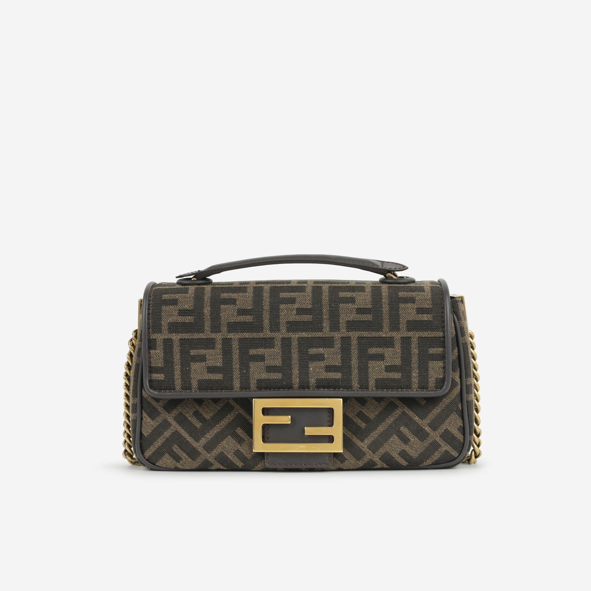 Elevate your style with the Iconic Baguette Chain Midi Bag, a true masterpiece of Italian craftsmanship. This exquisite bag is made of luxurious brown jacquard fabric adorned with the iconic FF motif, exuding timeless elegance and sophistication.
