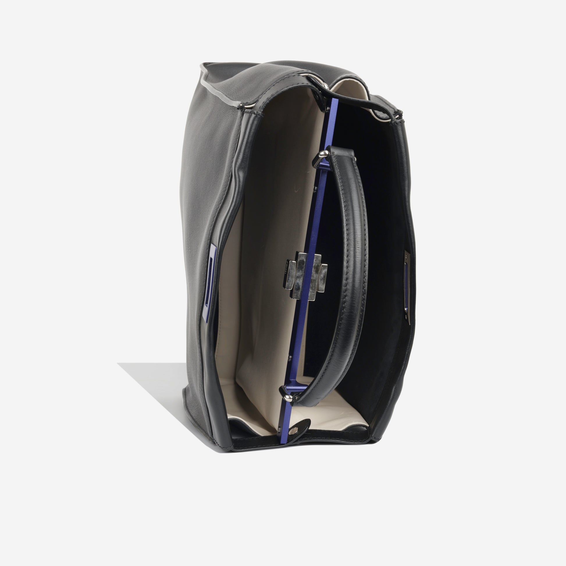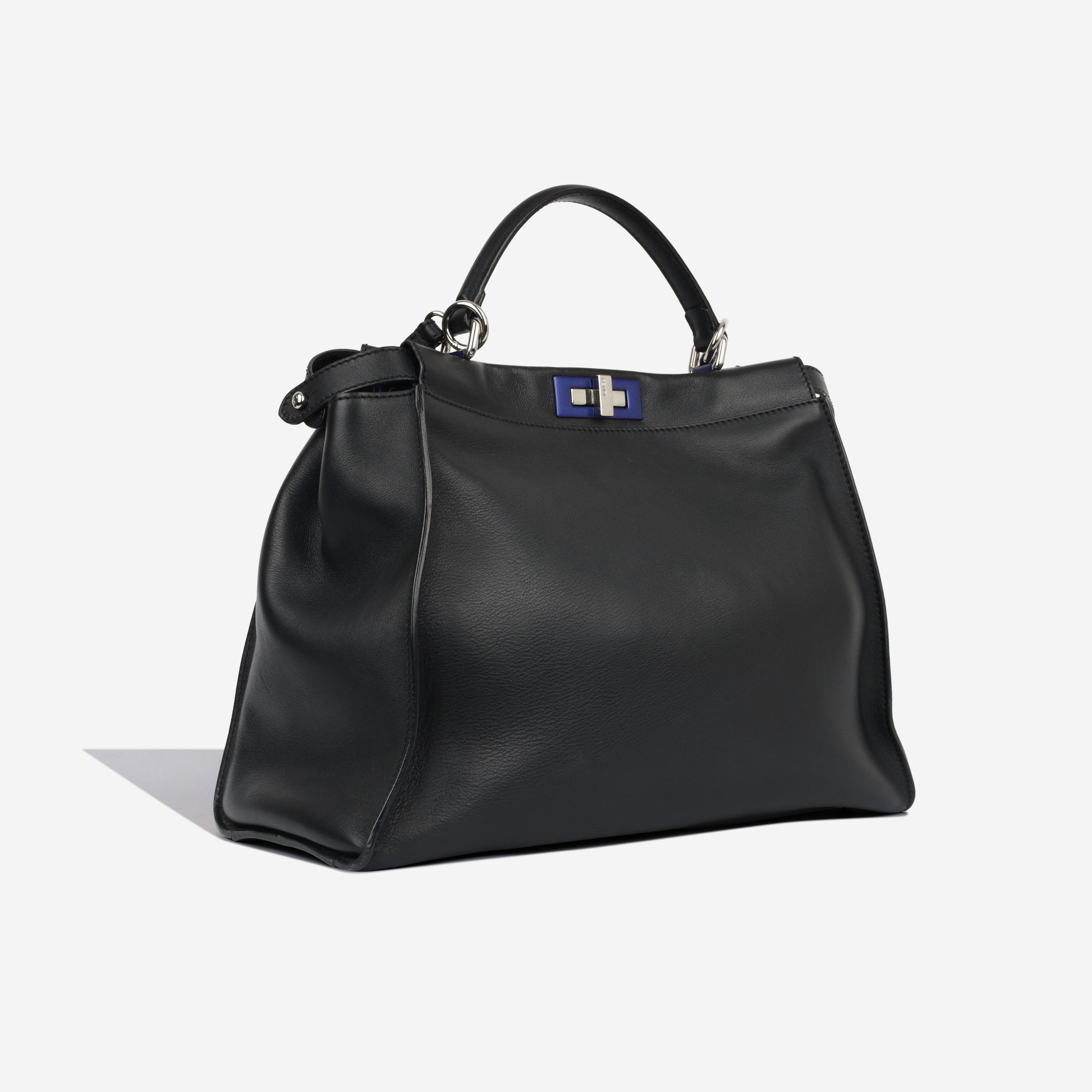 Fendi presents its iconic Peekaboo bag with smooth black calfskin leather and a pop of blue tone hardware. This bag is the perfect option for a modern, sleek woman on the go who needs to carry a lot with them. With two interior compartments divided by a stiff partition, an interior zip pocket, as well as the signature twist clasp - the Peekaboo is stylish, sophisticated, and elegant.