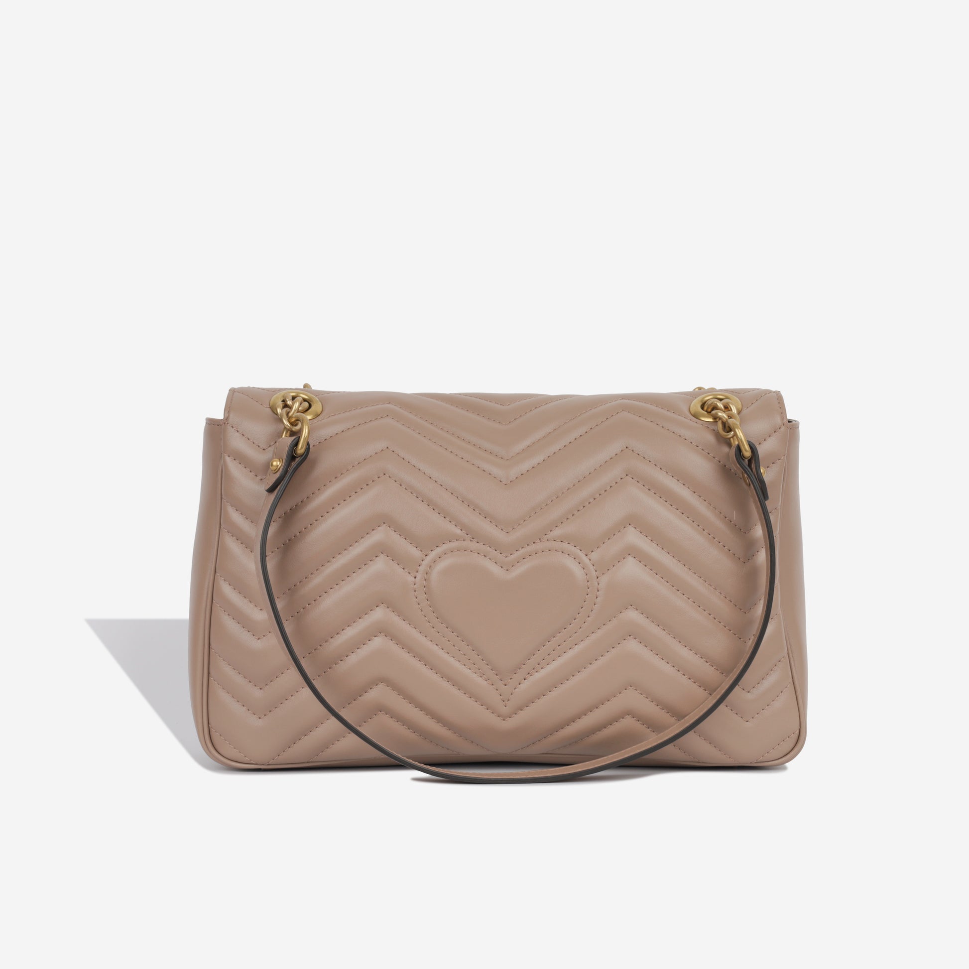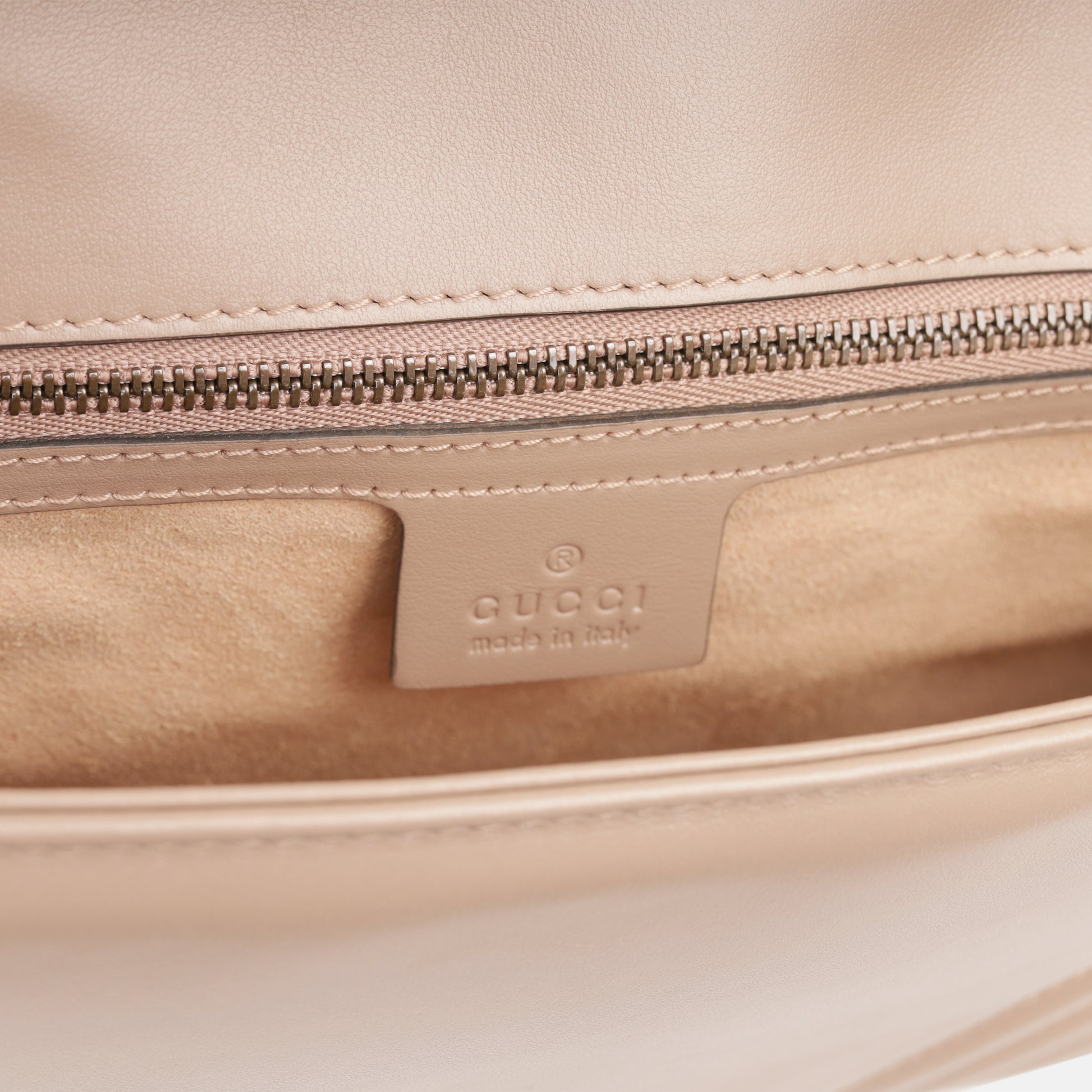 The softly structured and beautifully crafter medium marmont bag by Gucci is a firm favourite at Bagista for both it's iconic, striking details and it's everyday usability factor! The buttery soft matelassé leather has been quilted expertly in Gucci's signature chevron detailing and is finished in a perfectly neutral nude tone, making it the perfect addition to you AW22 wardrobe.