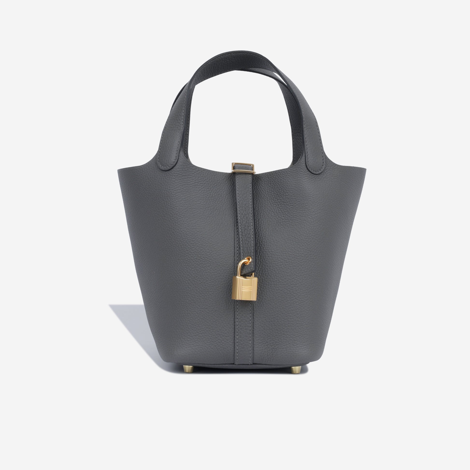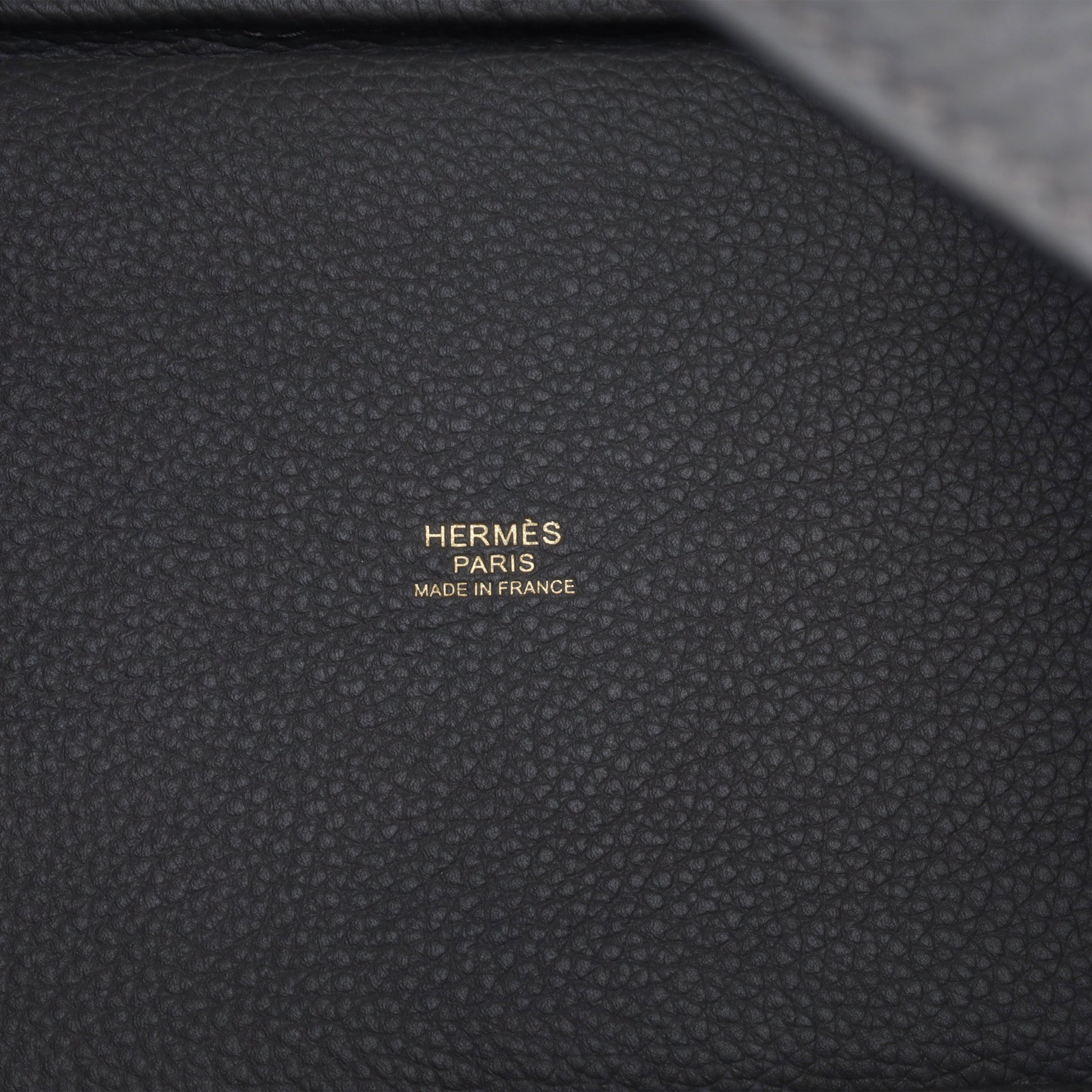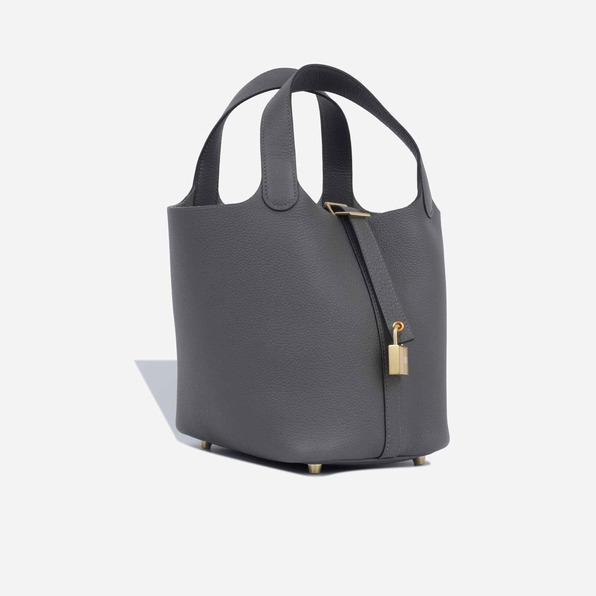 Carefully crafted from supple, Clemence leather, Hermès presents their stunning mini Picotin 18 bag in a beautiful combination of graphite grey Maurice leather and gold tone hardware. Hermès is acclaimed for their leather quality, as well as being at the very top of the fashion hierarchy. Simple, elegant, and understated, each Hermès bag is timeless and tasteful. This bag is no exception. Carry all your everyday essentials in style while remaining sleek and sophisticated. The Picotin lock exudes Hermès classic "if you know, you know" aesthetic.
