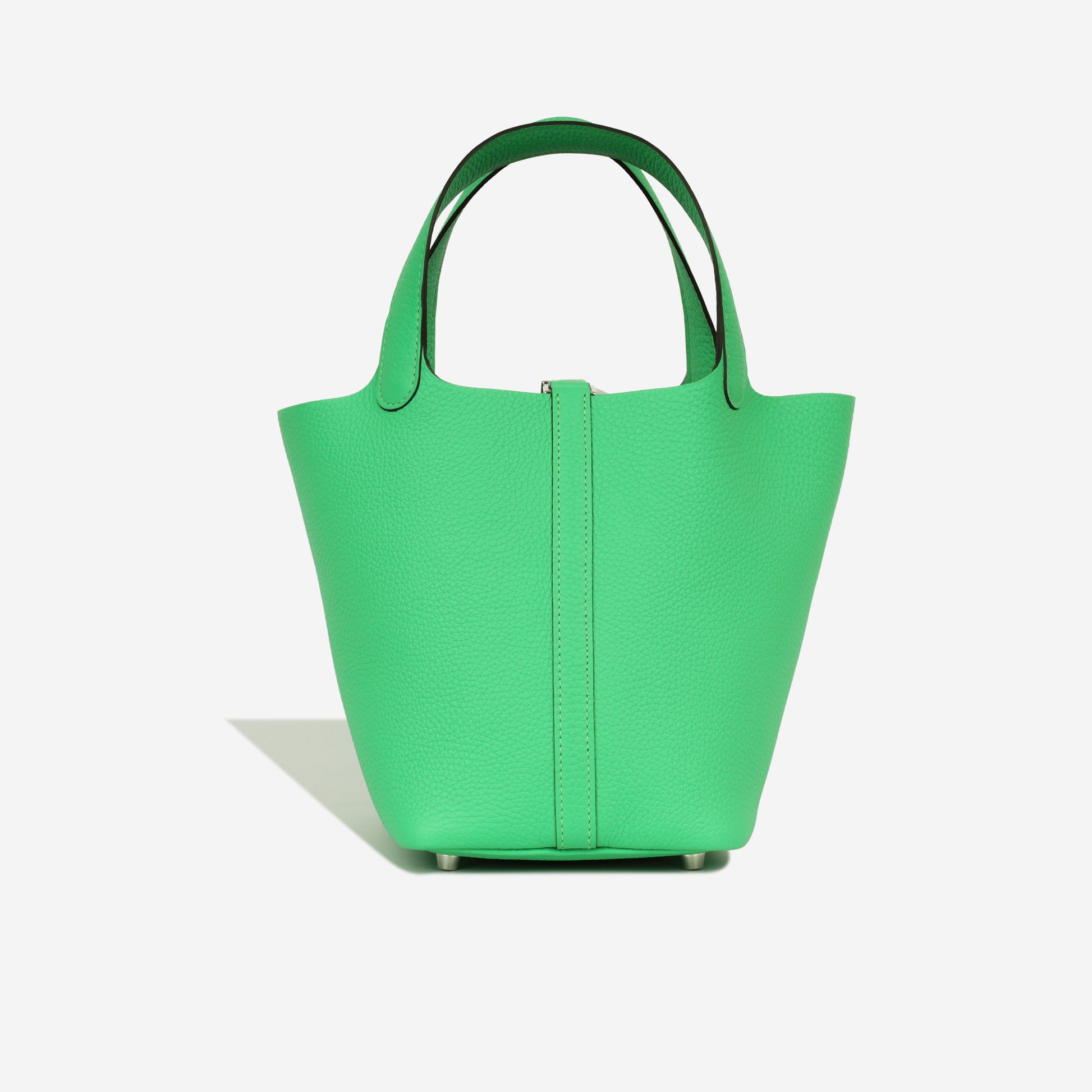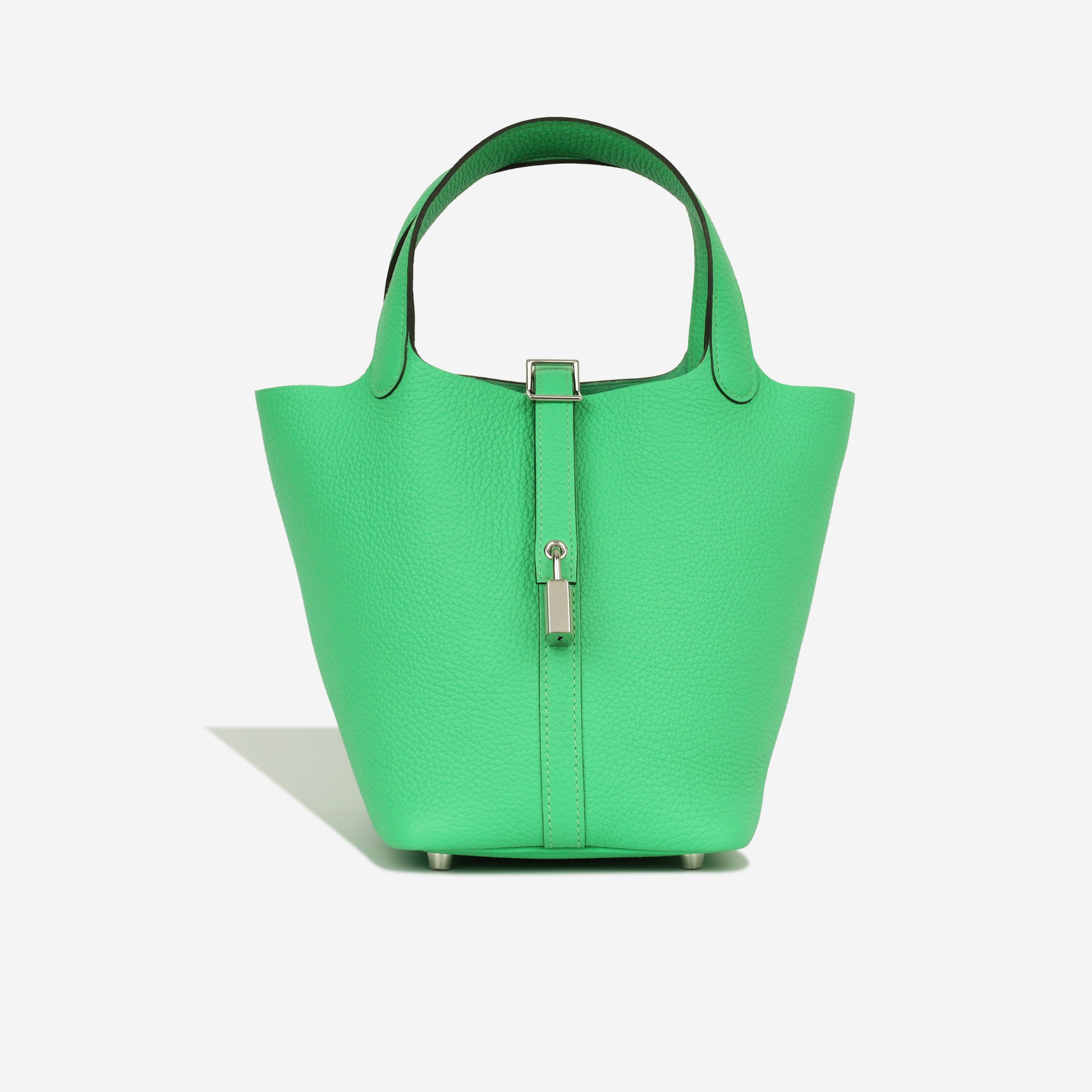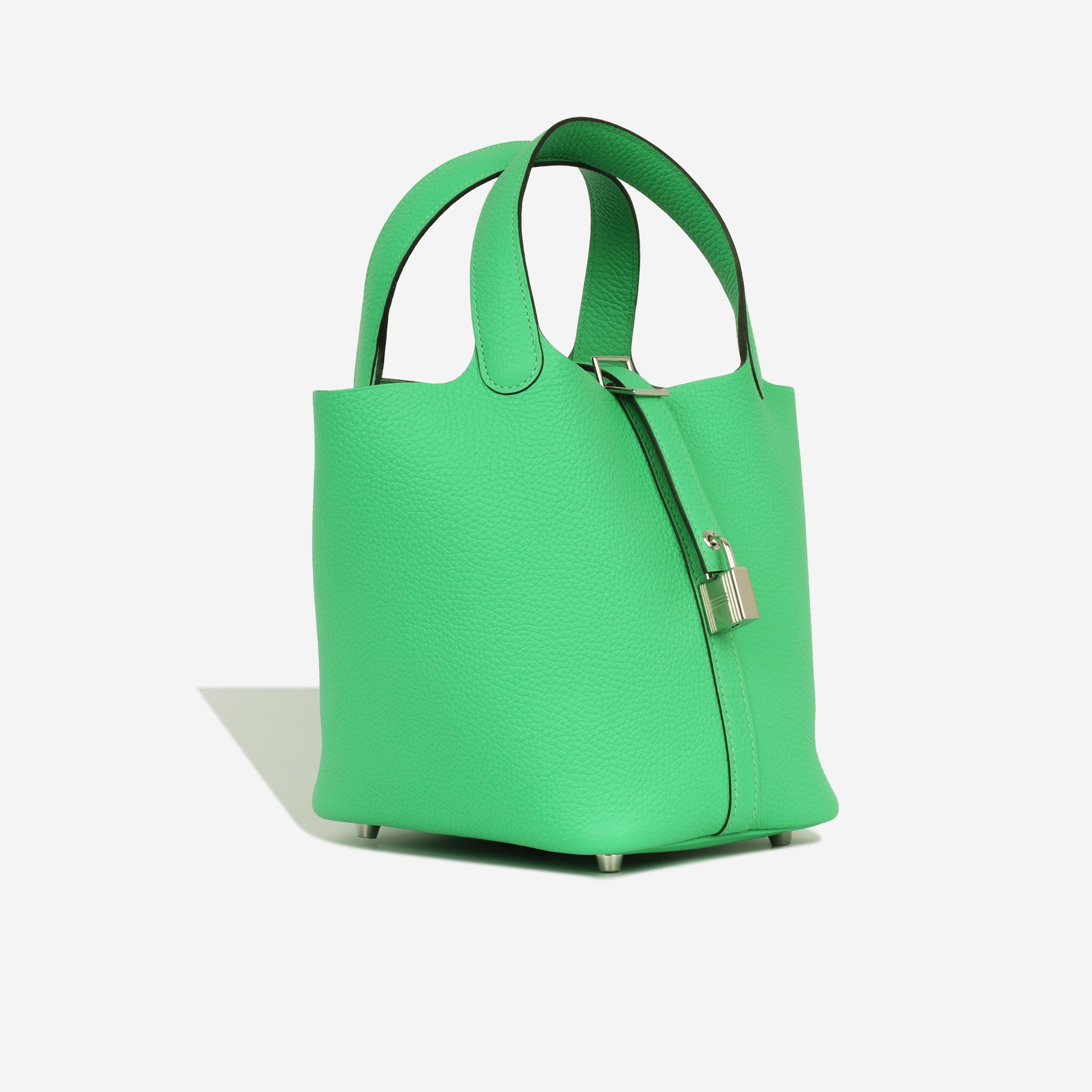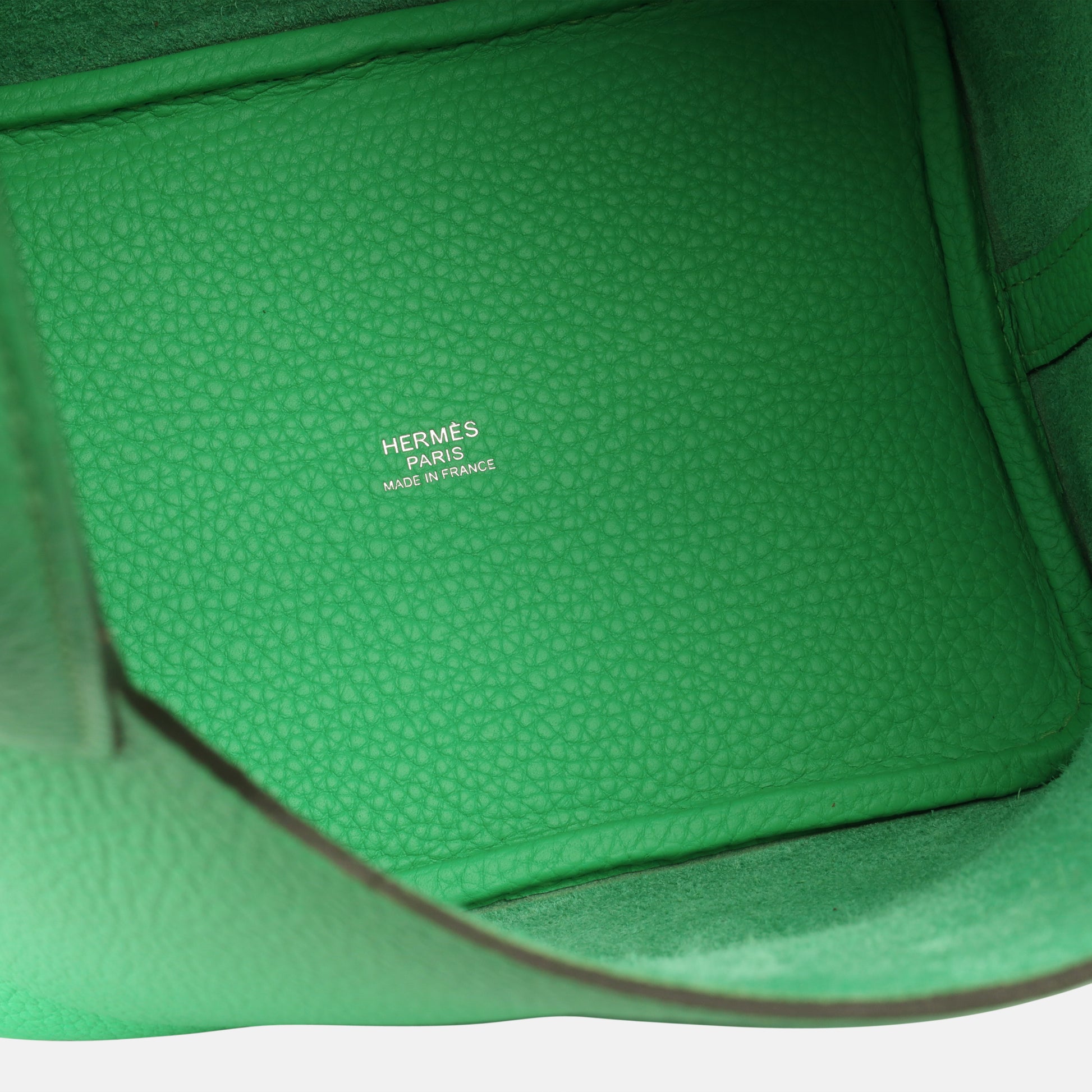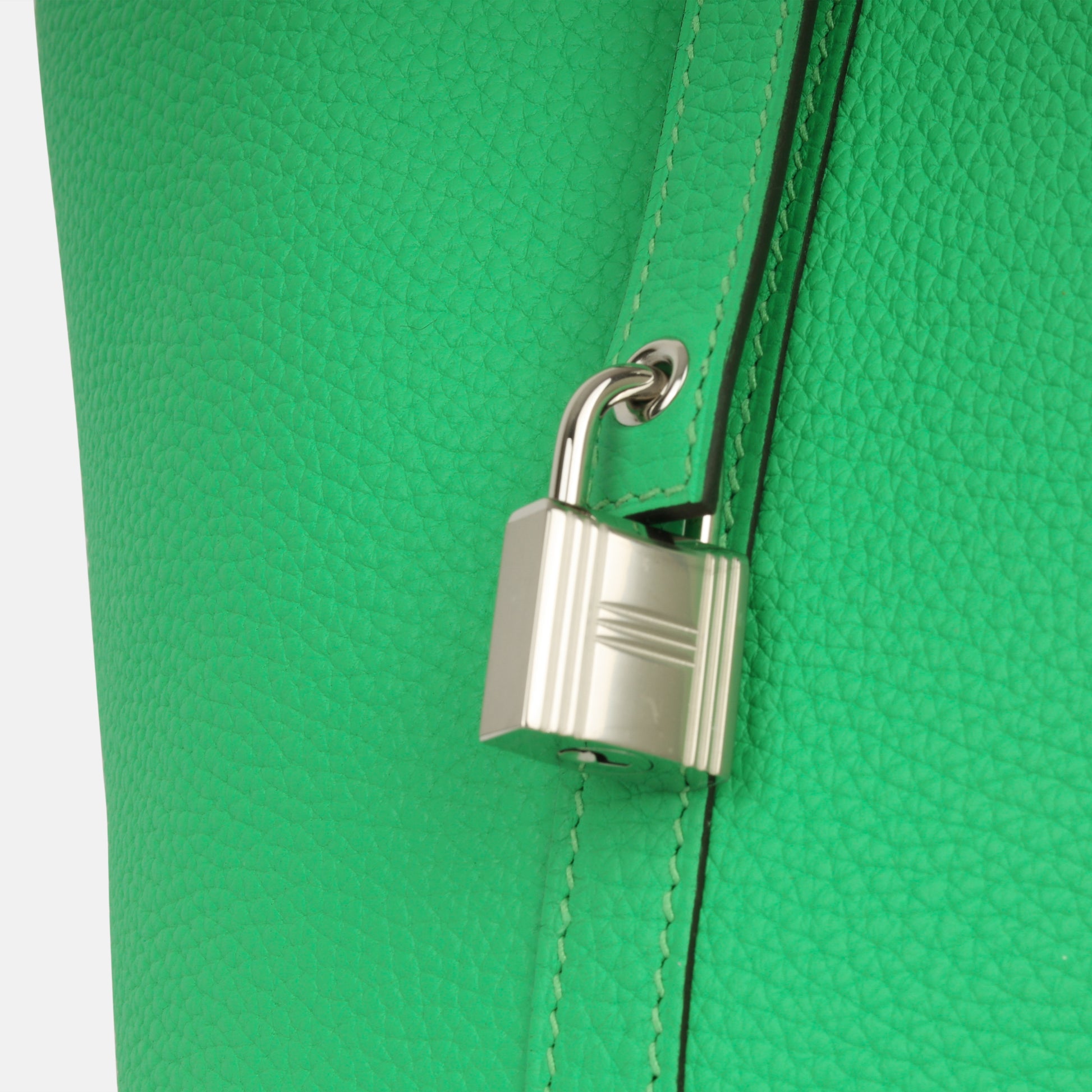 A slightly sturdier leather with a smaller grain, Maurice has been used to create this beautiful Picotin bag in a complimentary combination of Vert Comic Maurice leather with palladium hardware. Hermès is acclaimed for their leather quality, as well as being at the very top of the fashion hierarchy. Simple, elegant, and understated, each Hermès bag is timeless and tasteful. This bag is no exception.