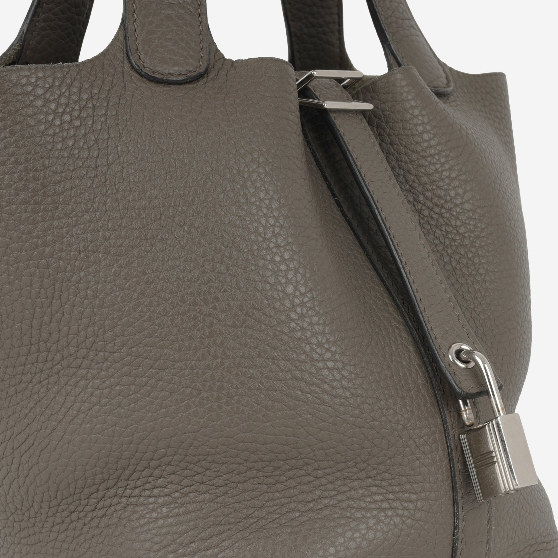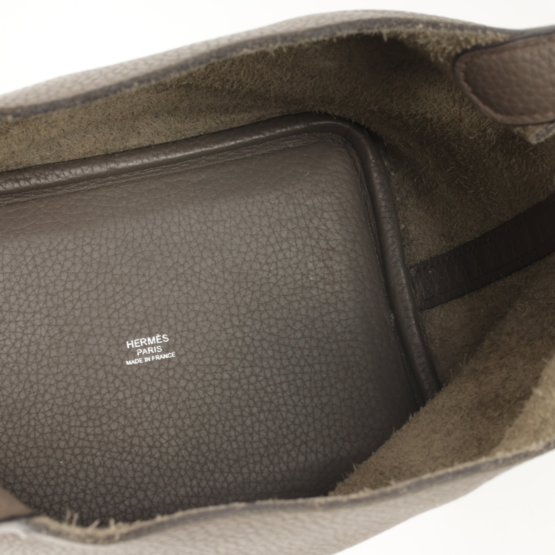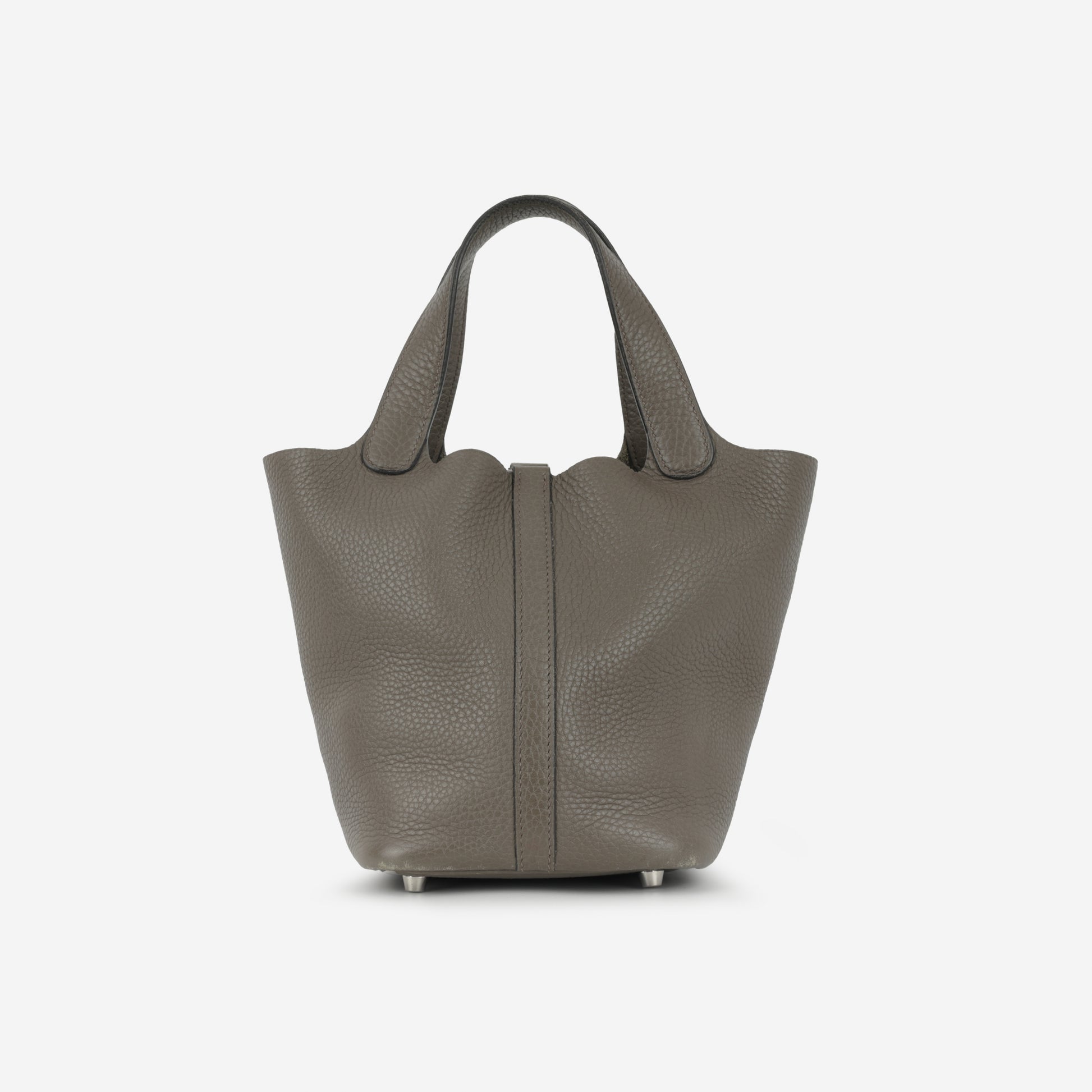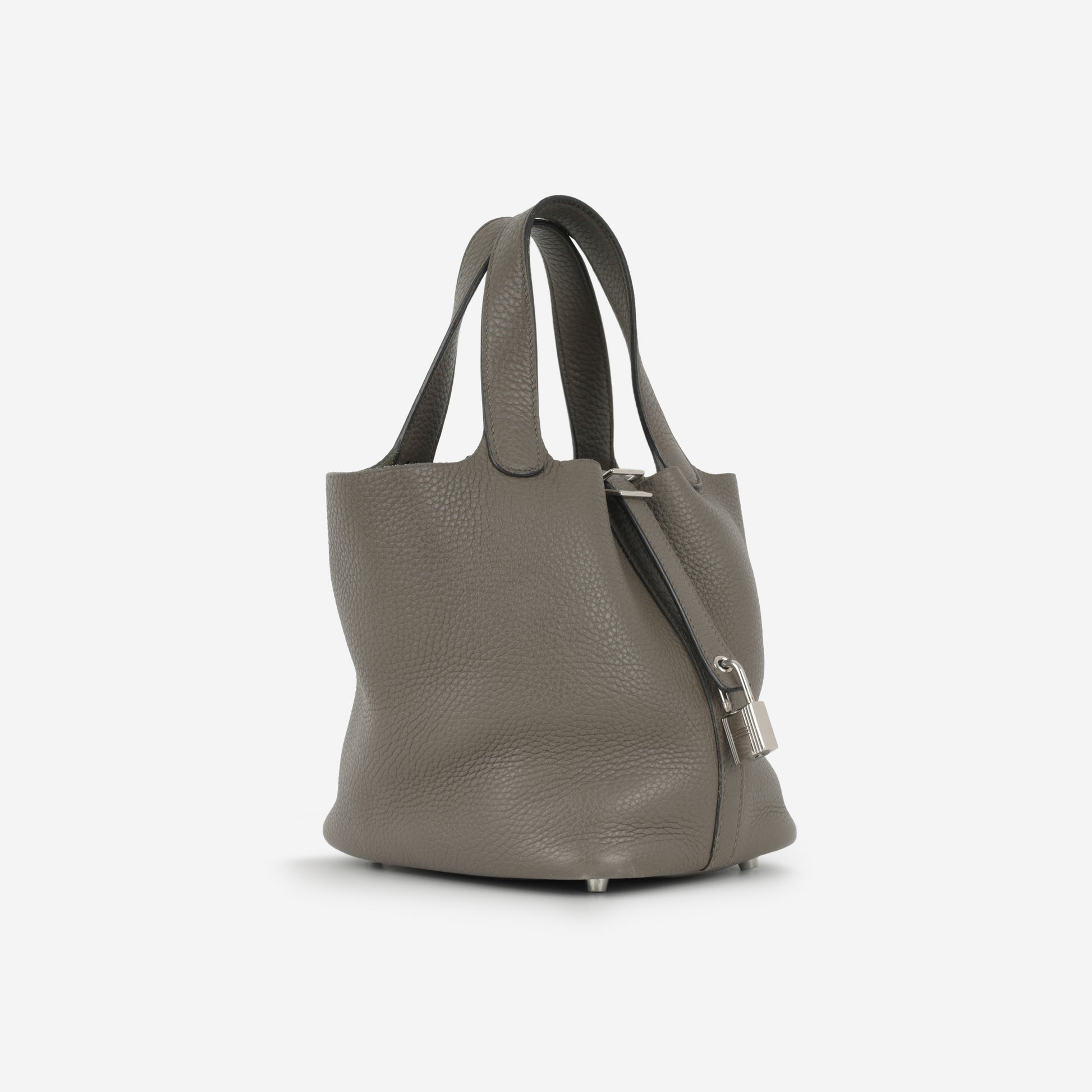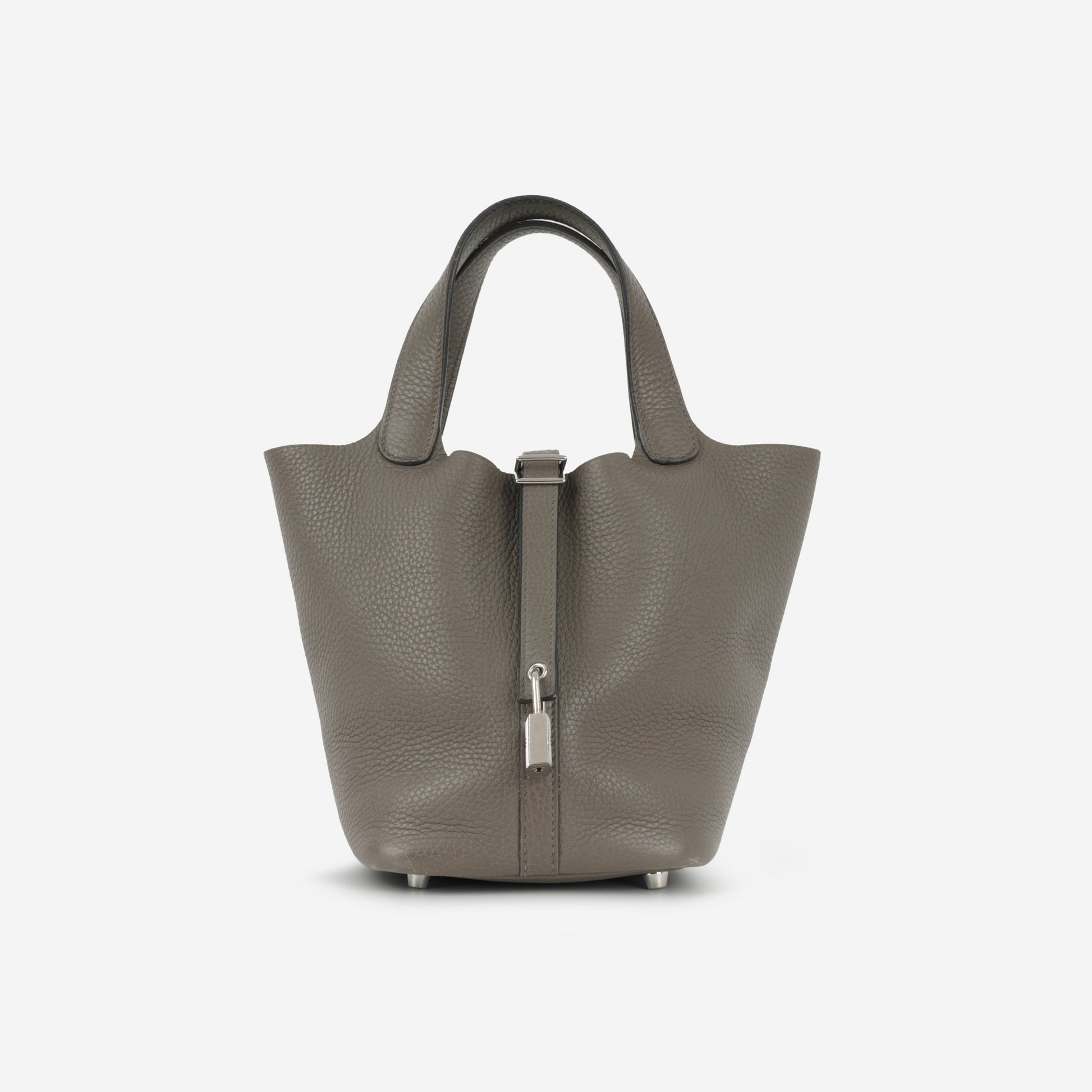 Hermès presents their stunning mini Picotin 18 bag in a beautiful combination of their Clemence leather and palladium hardware. Hermès is acclaimed for their leather quality, as well as being at the very top of the fashion hierarchy. Simple, elegant, and understated, each Hermès bag is timeless and tasteful. This bag is no exception. Carry all your everyday essentials in style while remaining sleek and sophisticated. The Picotin lock exudes Hermès classic "if you know, you know" aesthetic.