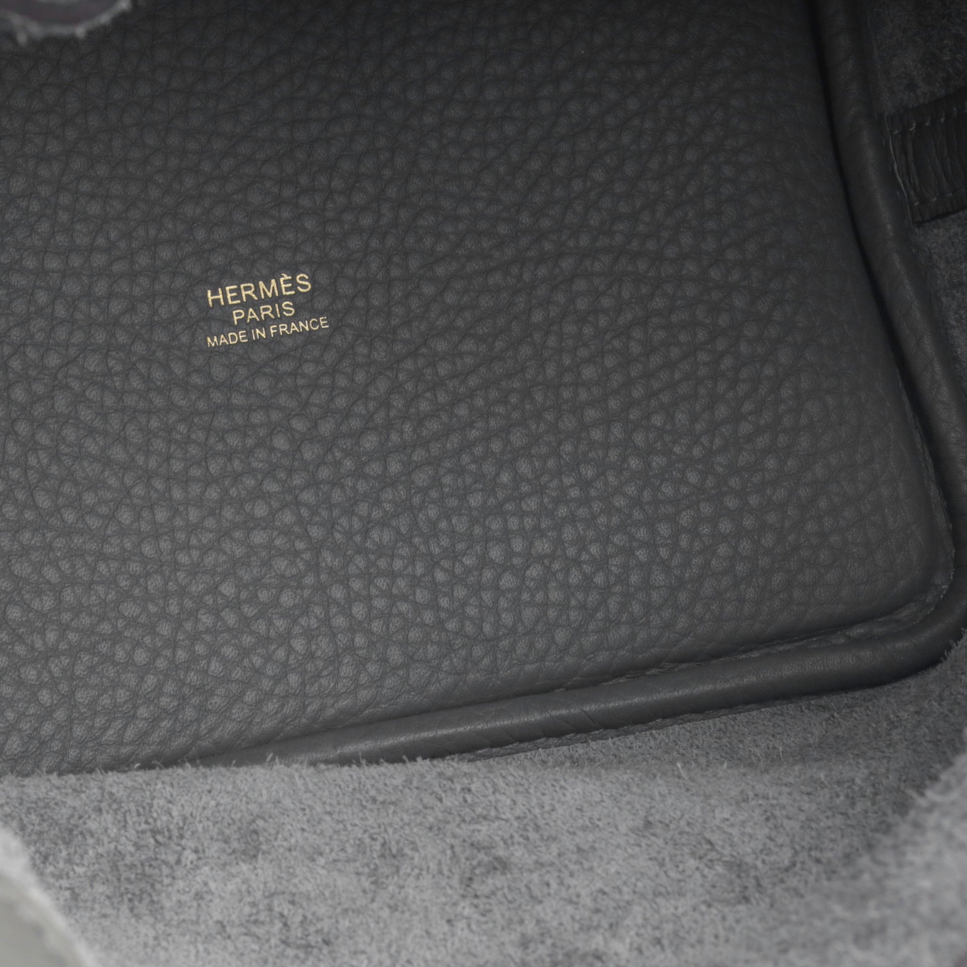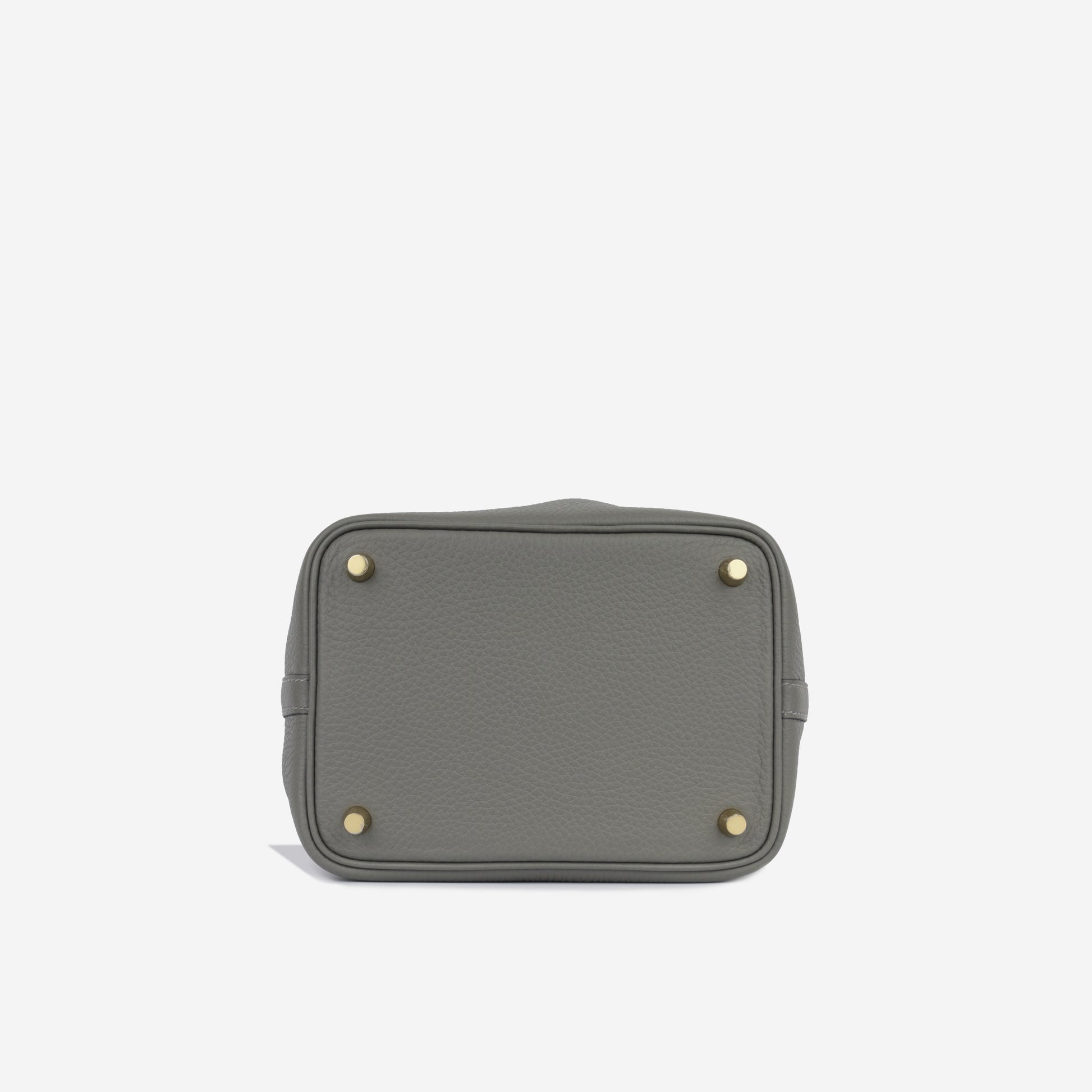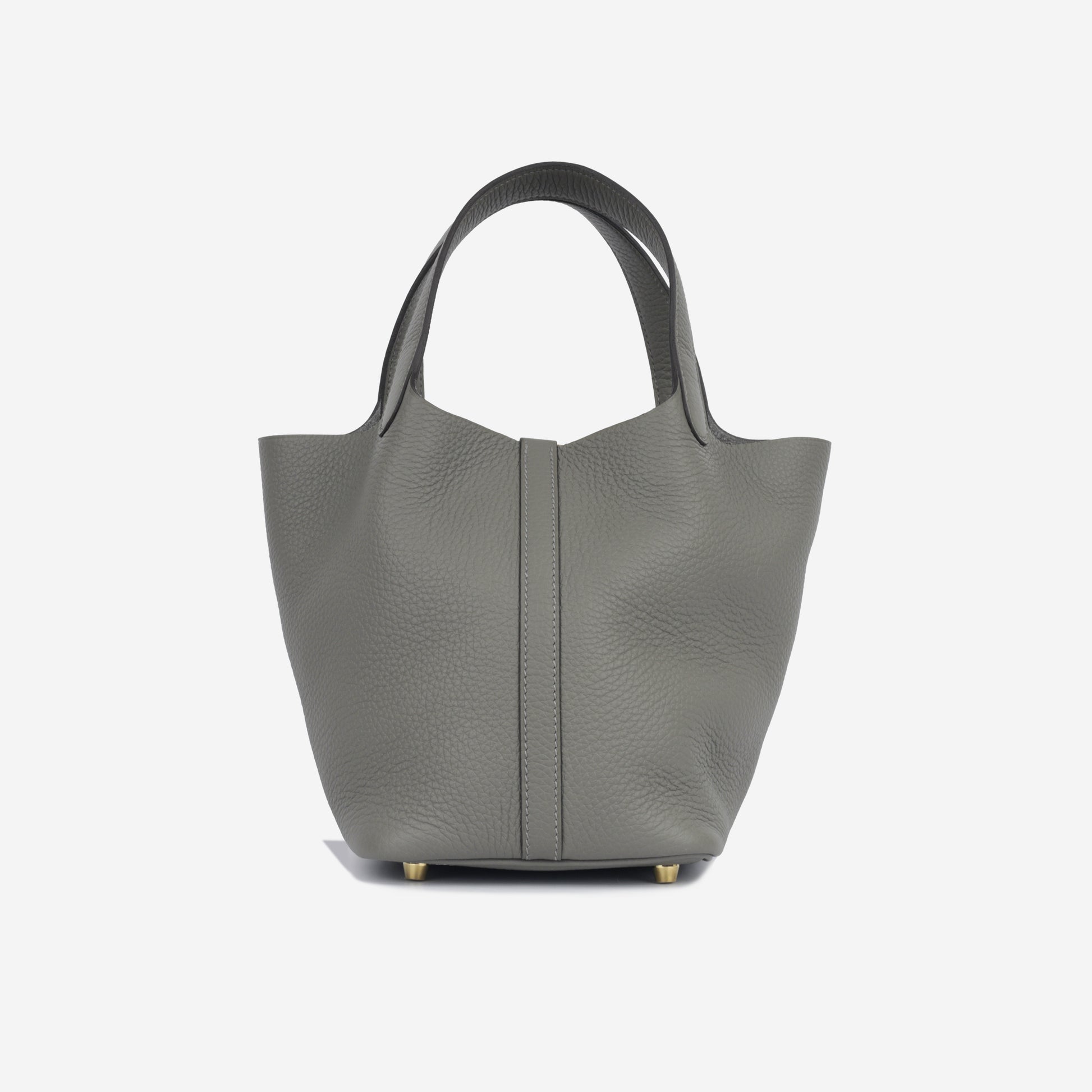 Carefully crafted from supple, Clemence leather, Hermès presents their stunning mini Picotin 18 bag in a beautiful combination of gris meyer and gold tone hardware. Hermès is acclaimed for their leather quality, as well as being at the very top of the fashion hierarchy. Simple, elegant, and understated, each Hermès bag is timeless and tasteful. This bag is no exception. Carry all your everyday essentials in style while remaining sleek and sophisticated. The Picotin lock exudes Hermès classic "if you know, you know" aesthetic.