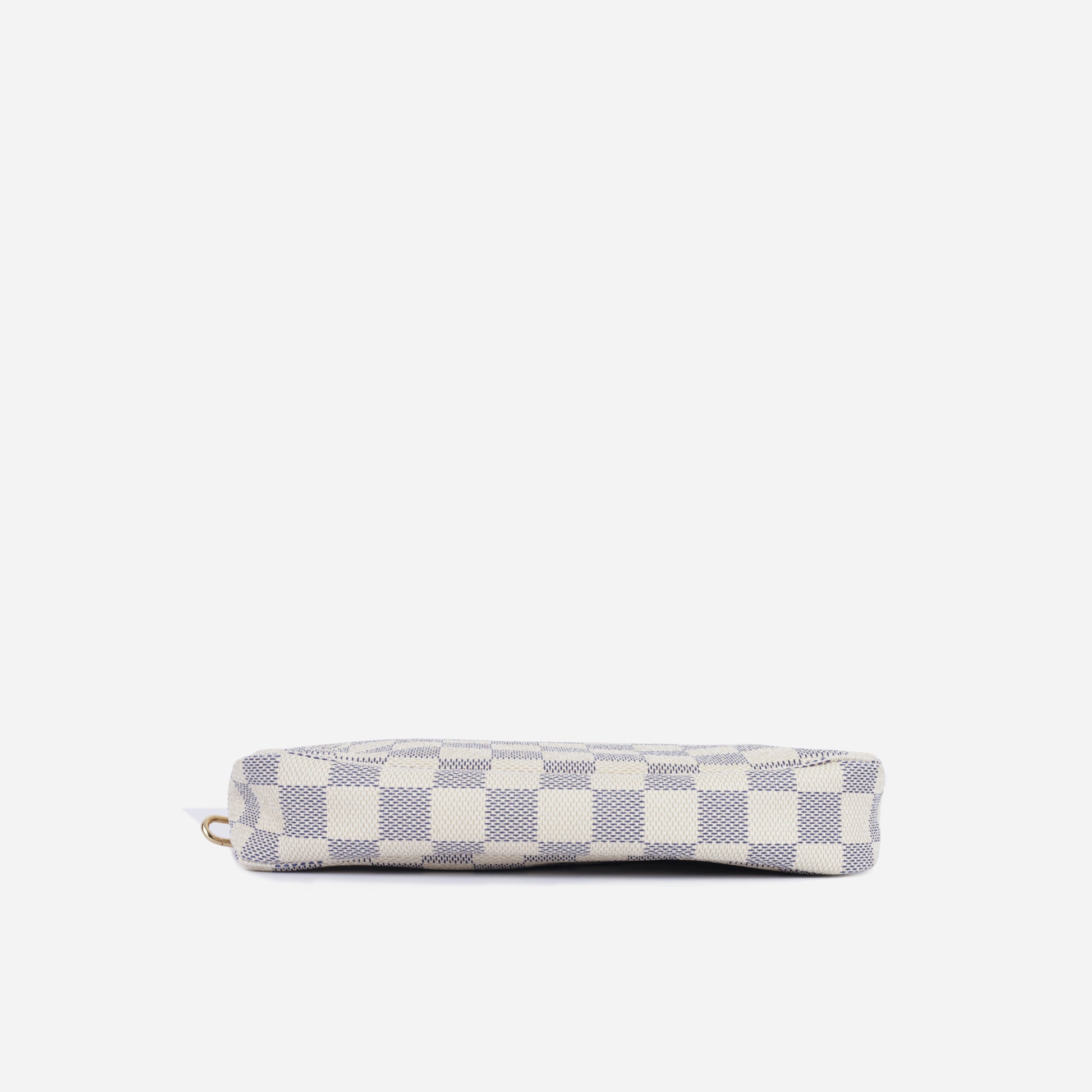 Crafted from the iconic damier azur canvas, this Pochette is a must-have. This design is rich in Louis Vuittons history and it's still such a popular piece. Durable yet effective, with its removable shoulder strap that also turns into a wristlet. The compact size makes this the perfect evening essential.