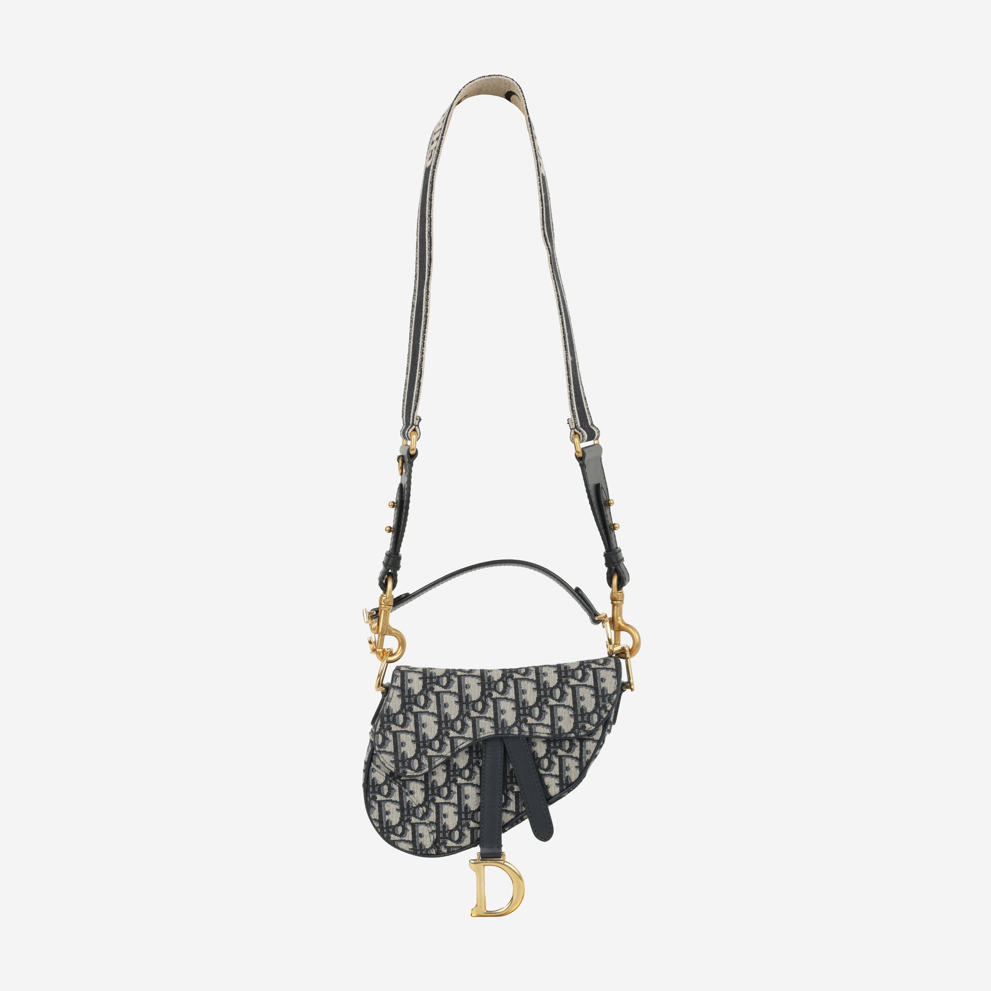 This Dior shoulder strap features signature ‘Christian Dior Paris’ embroidery in black and ecru tones, with antique gold-tone ring attachments. Designed in a fixed shoulder length, it adds iconic branding and elevated comfort to your Lady Dior, Saddle, or Book Tote.