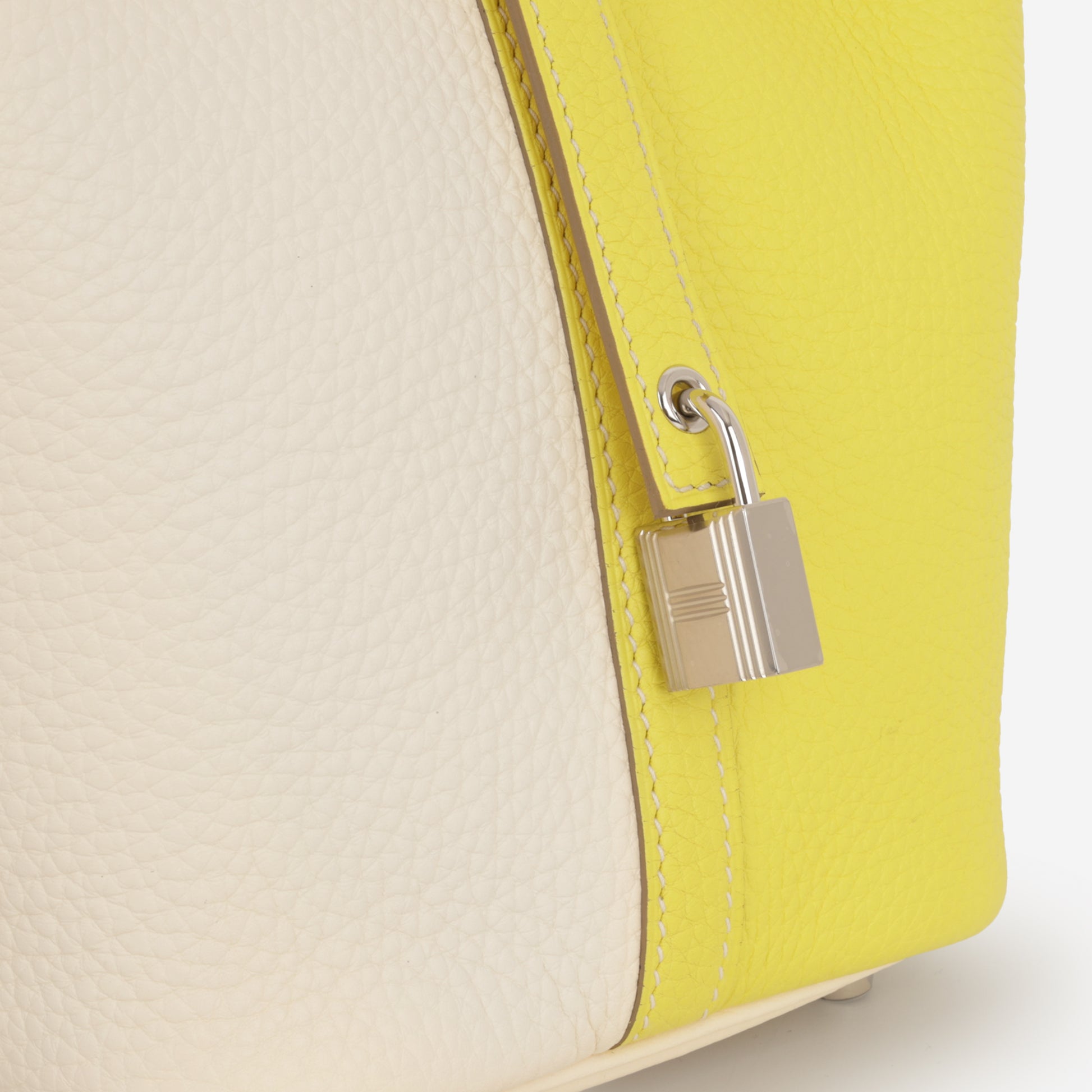 The Hermès Picotin 18 Casaque in Lime and Nata Clemence with Palladium Hardware is a vibrant yet elegant expression of modern Hermès craftsmanship. Featuring the distinctive Casaque bi-color design, this eye-catching bag pairs bold Lime with soft Nata, creating a fresh, playful contrast that remains refined and timeless.