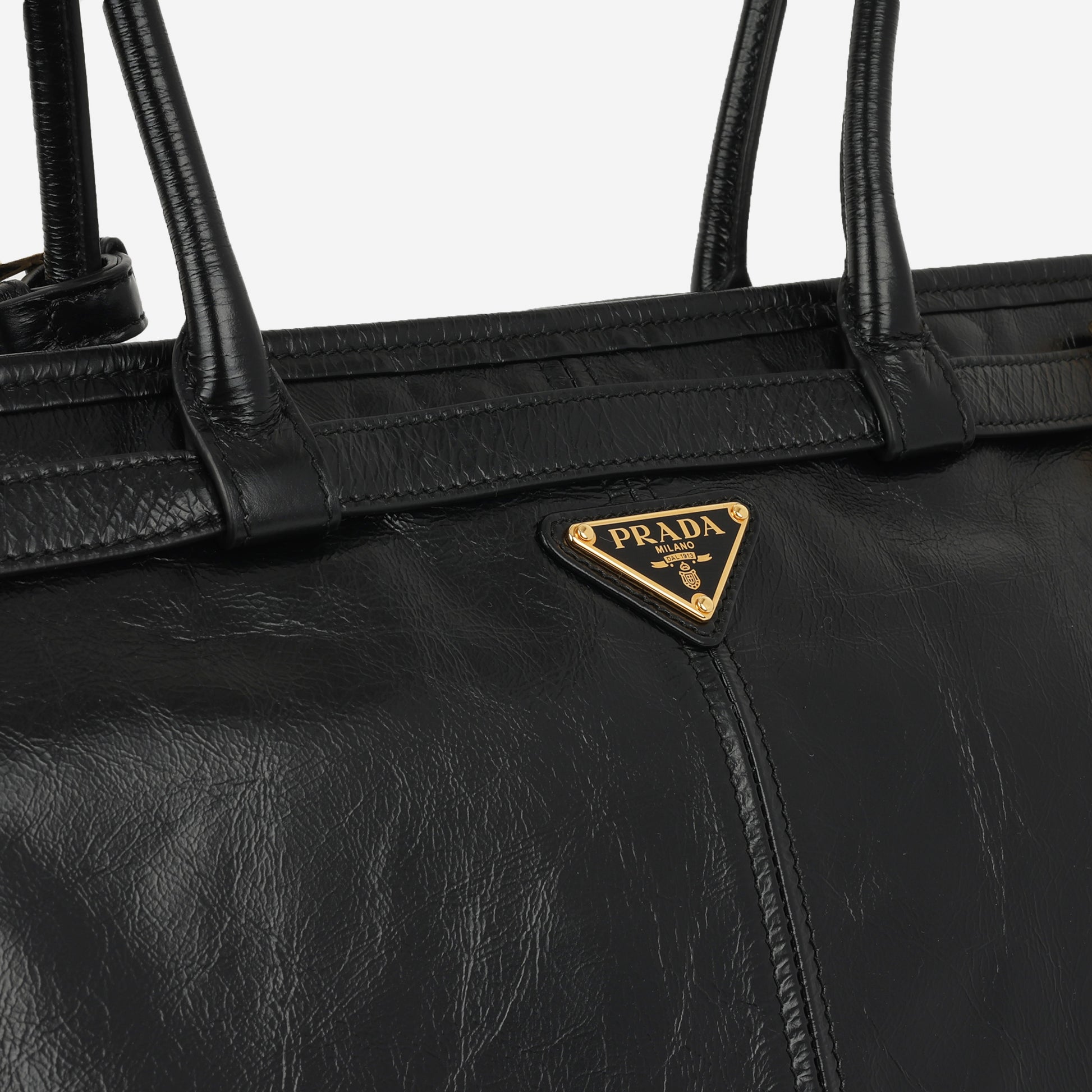 The Prada Medium Bonnie Bag is a refined and versatile handbag that blends modern elegance with timeless design. Crafted from soft calfskin leather with a glossy finish, it features a structured, rectangular silhouette enhanced by sophisticated strap detailing and Prada's iconic enamelled metal triangle logo.