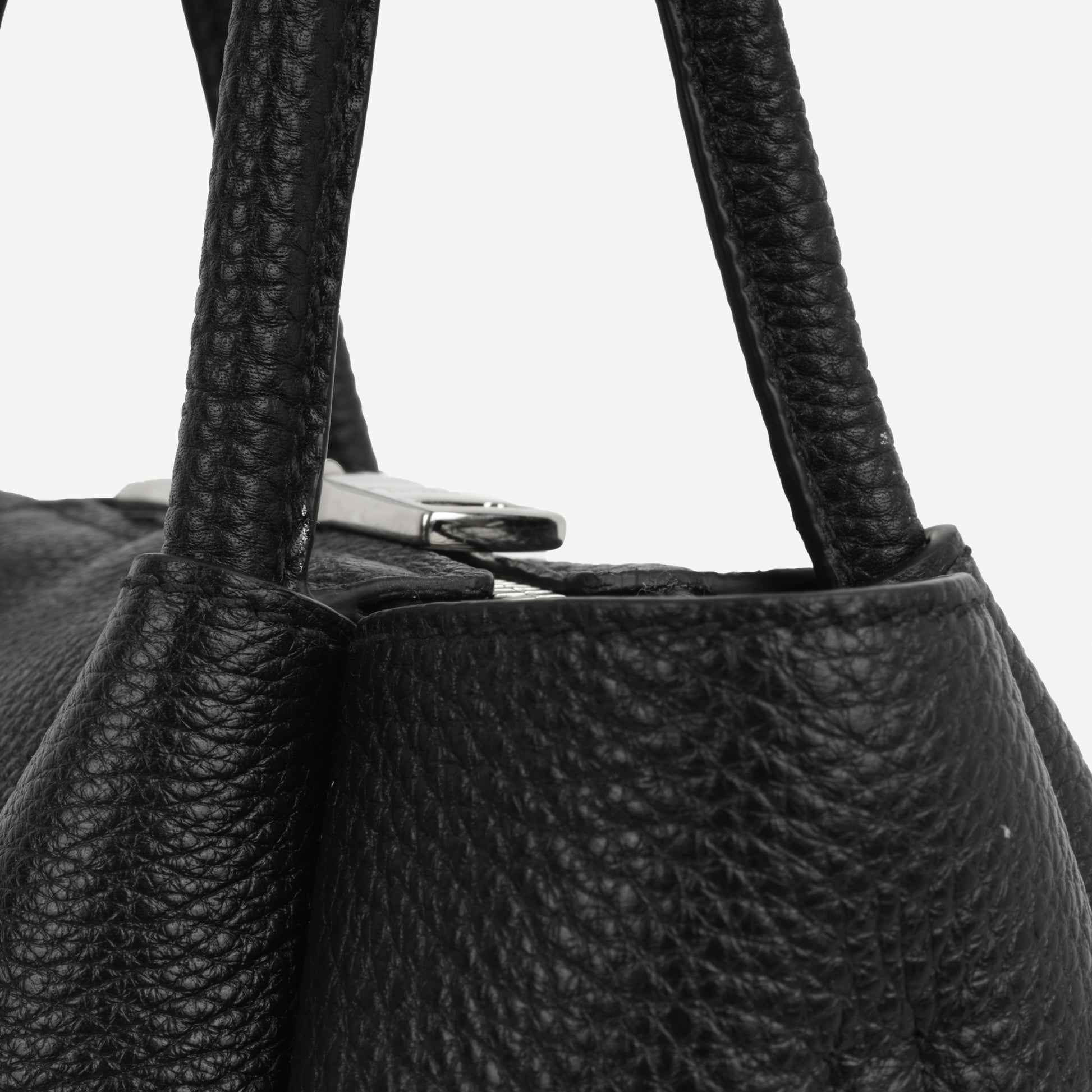 The Prada Mini Daino Bag in Black Taurillon leather with Silver Hardware is a refined expression of timeless Italian craftsmanship and everyday luxury. Made from soft, pebbled Taurillon (Daino) leather, this mini bag is both durable and elegant, offering a supple texture and structured silhouette that never goes out of style.