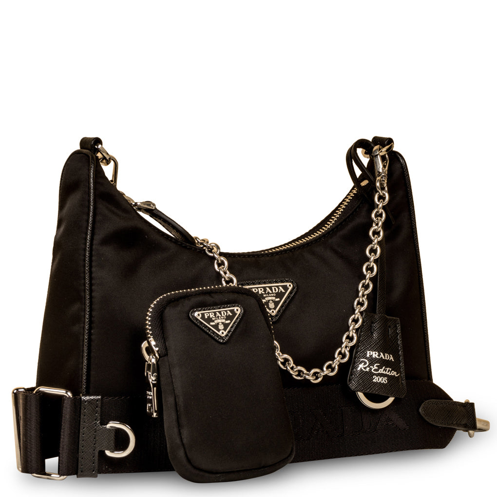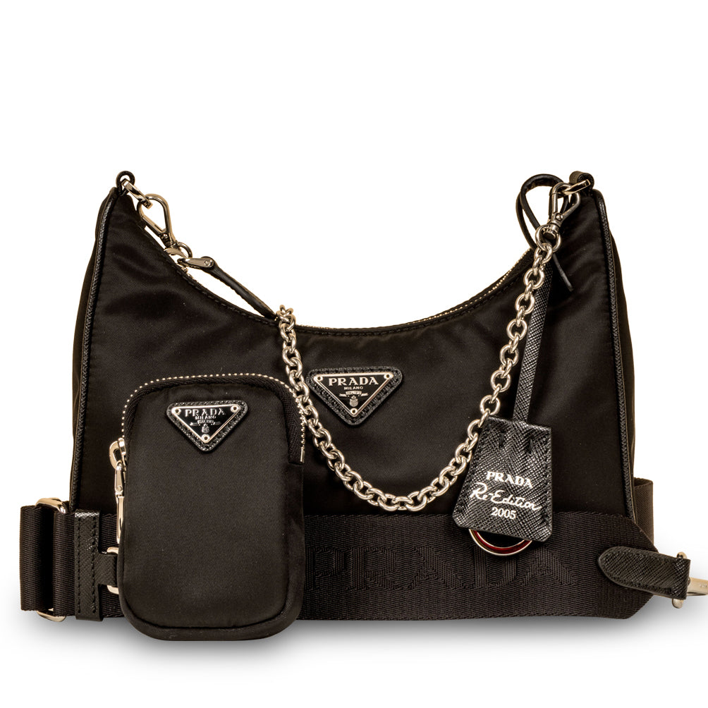 The bag on everyones wishlist, the 2005 Re-edition Crossbody bag from Prada is the ultimate It-Bag currently seen on every It-Girl. Carefully crafted the brand’s signature nylon exterior, the Re-edition is one of the coolest bags we’ve seen. Featuring a main zip-top pochette, a matching logo-embossed fabric strap and an additional mini rectangular pochette attached to the strap, this effortlessly chic bag is truly a must-have for any and every women with a love for luxury and hot products. Worn by every fashion enthusiast, influencer and model. Remove the mini Pochette and wear it on its own with its delicate chain strap, or wear it attached to the larger, fabric shoulder strap for a more contemporary look. A bag that belongs in your wardrobe, the Re-edition is the perfect combination of timeless tradition and modern edge - and we can’t get enough!