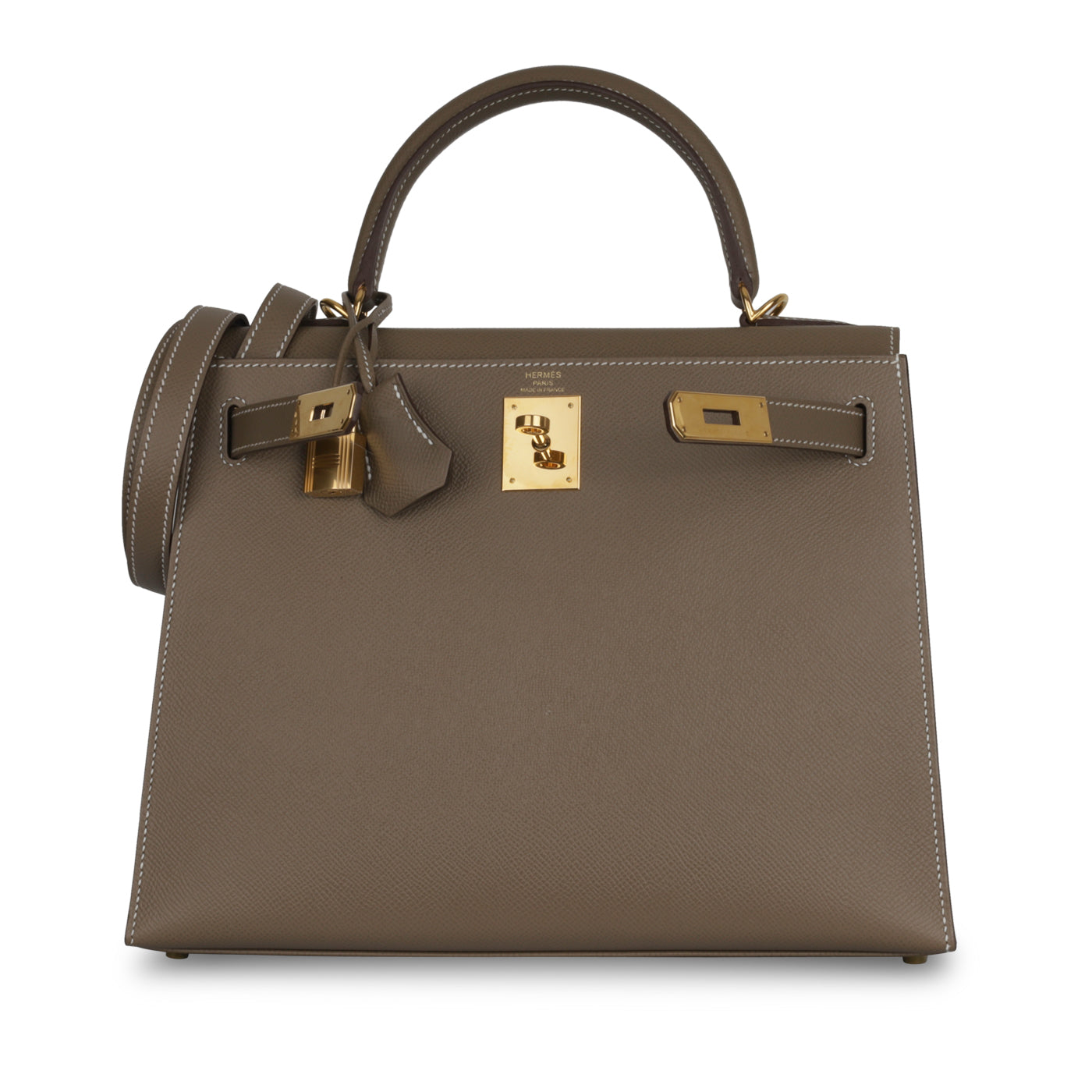 One of the most iconic and desired bags around the world, the Hermès Kelly, along with its sister bag, the Birkin, are the two most internationally recognized bags of all time. Created and designed for actress and Princess of Monaco, Grace Kelly, the bag received its claim to fame when the Princess was supposedly using her bag to shield her baby bump from the paparazzi. Crafted in luxurious Etoupe Epsom leather, the Kelly is structured and durable but maintains its classic silhouette.