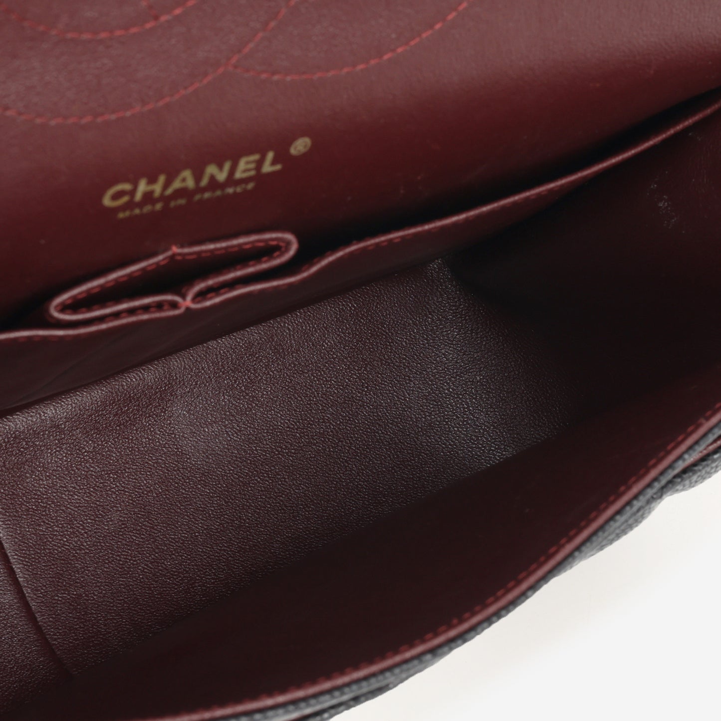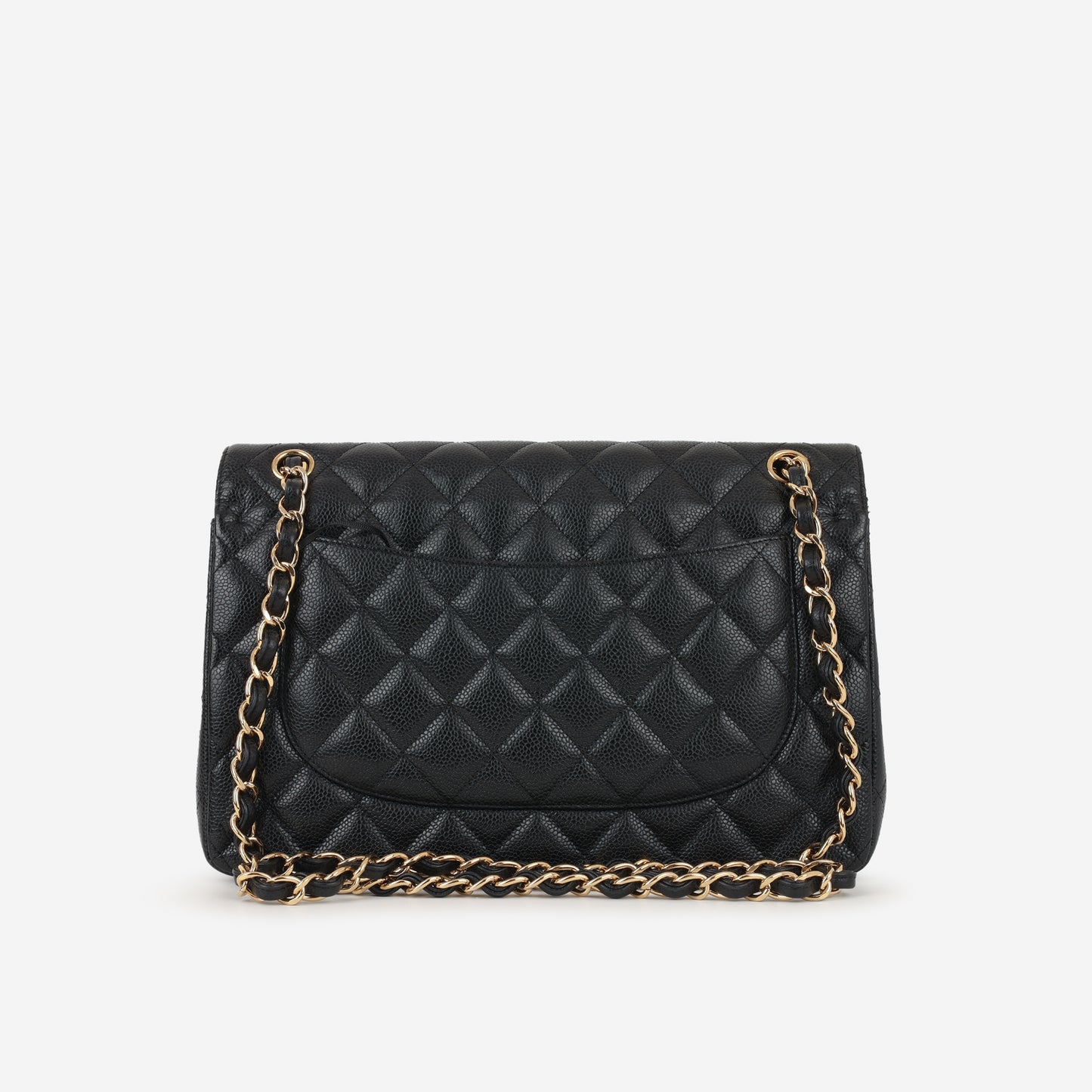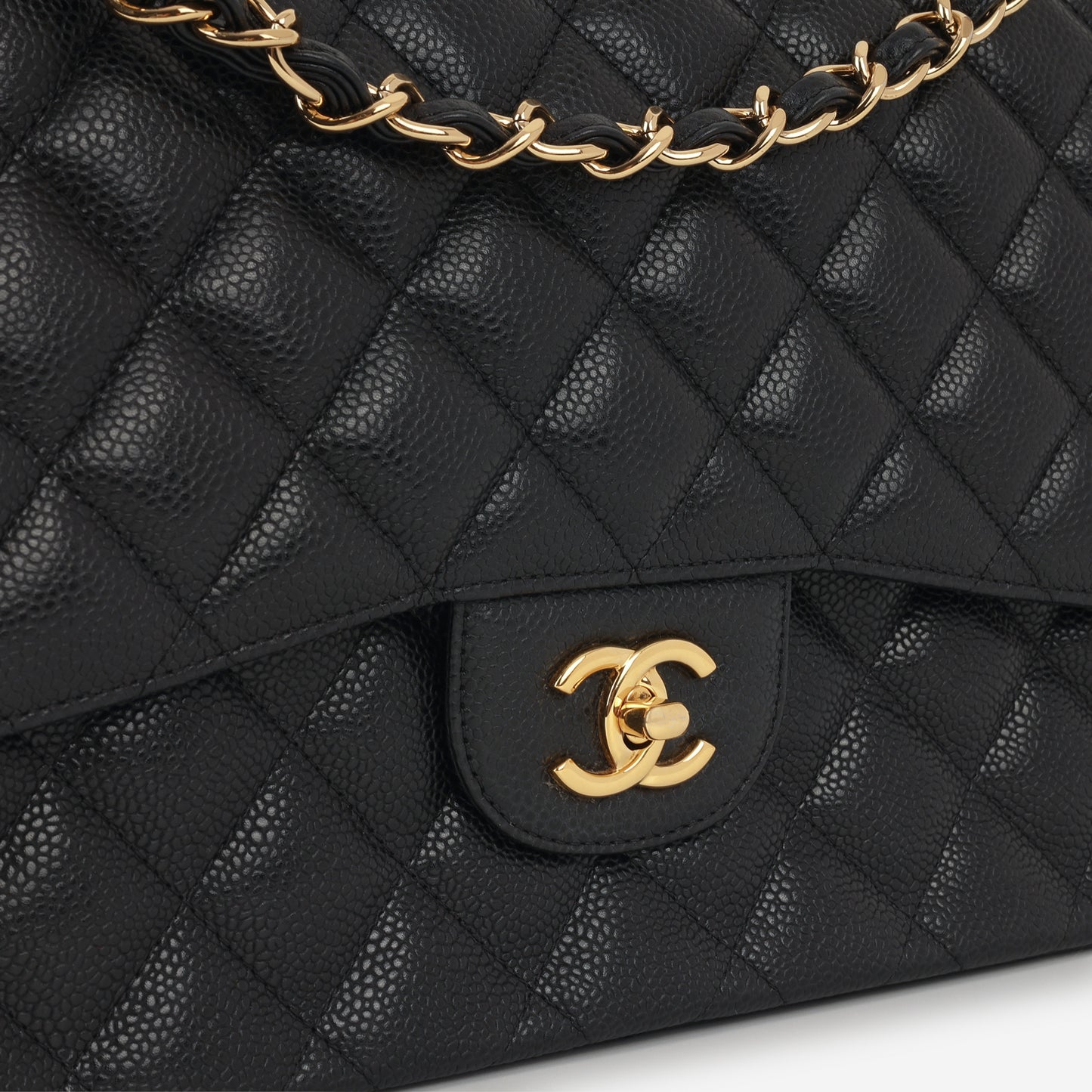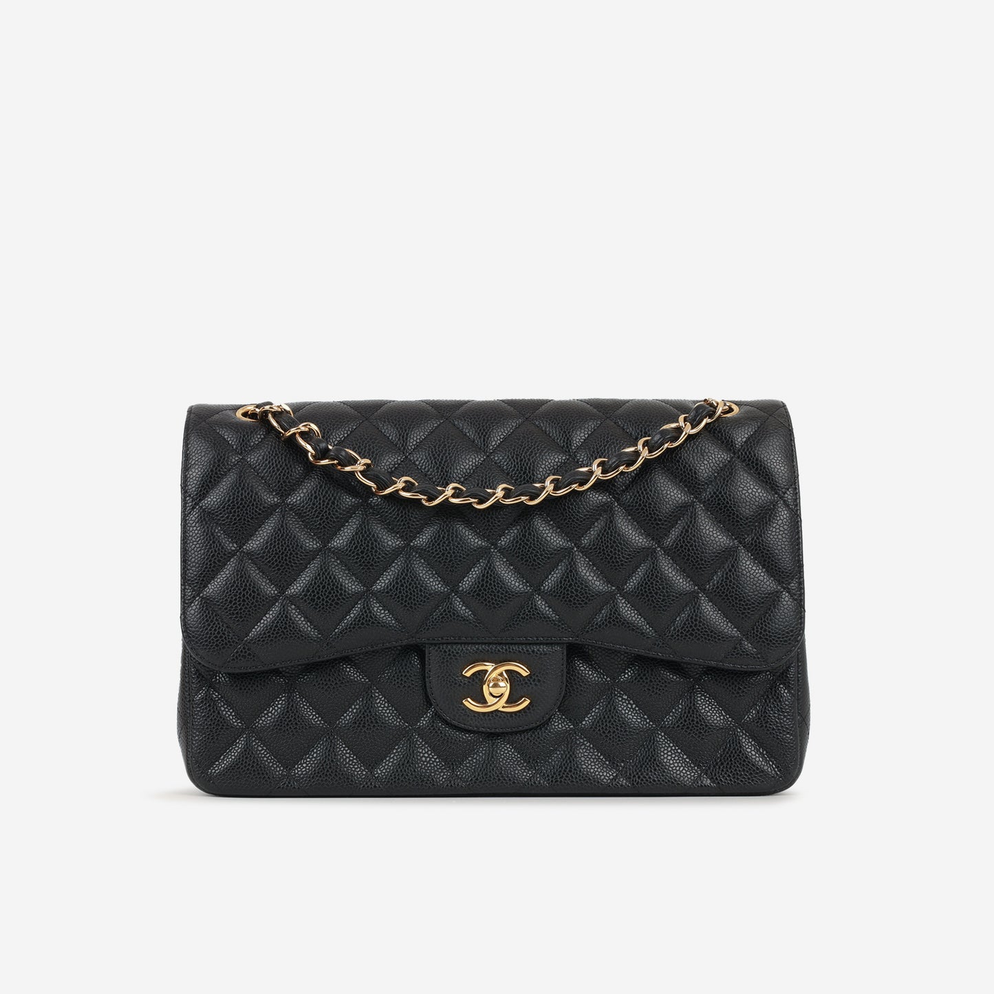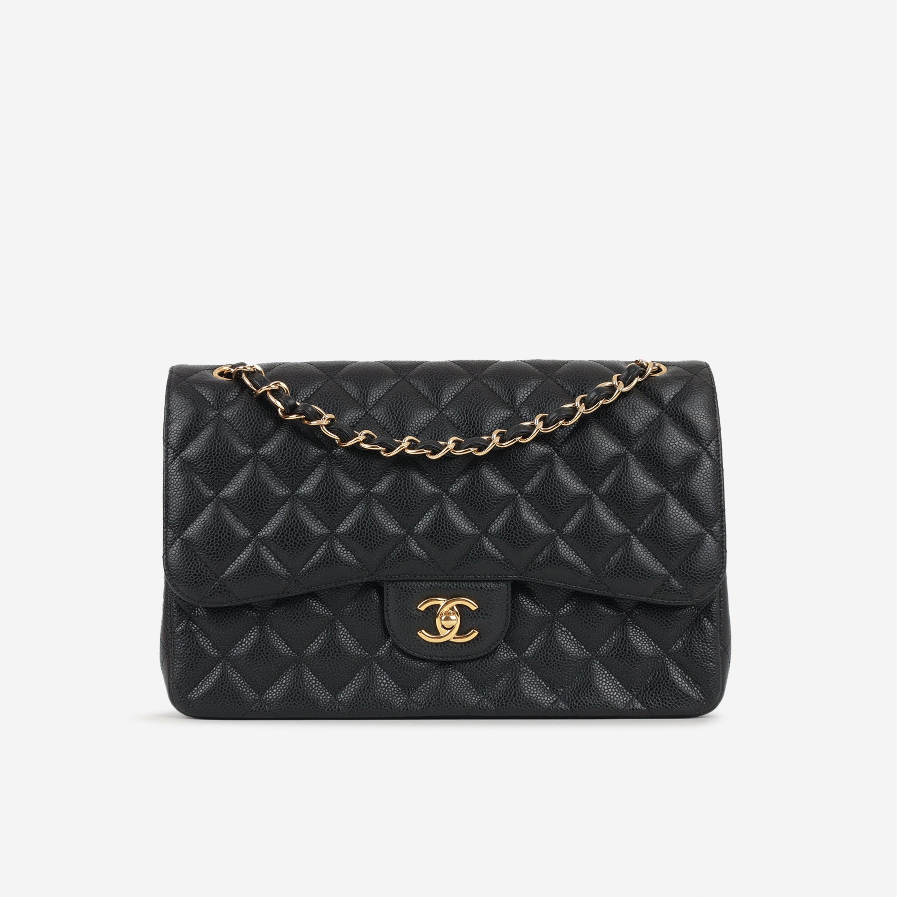 The Chanel Jumbo Classic Flap in Black Caviar leather with Gold Hardware is available now. Crafted from durable, quilted caviar leather, it features the iconic CC turn-lock, double flap, and leather-woven chain strap. Spacious and timeless, this jumbo size is perfect for everyday elegance. The gold-tone hardware adds a classic finish to the signature black exterior. Authenticity guaranteed and ready to ship from a trusted luxury reseller.