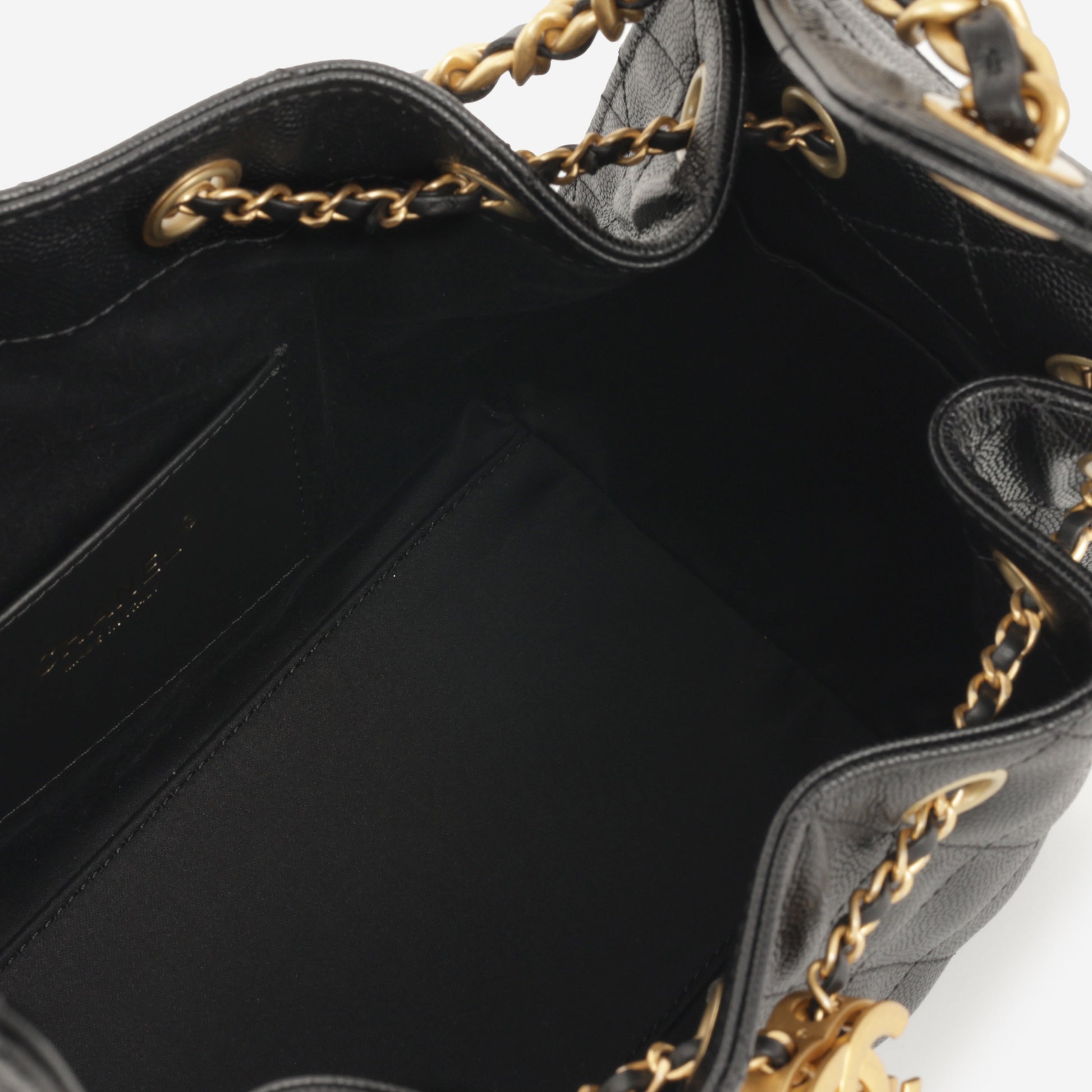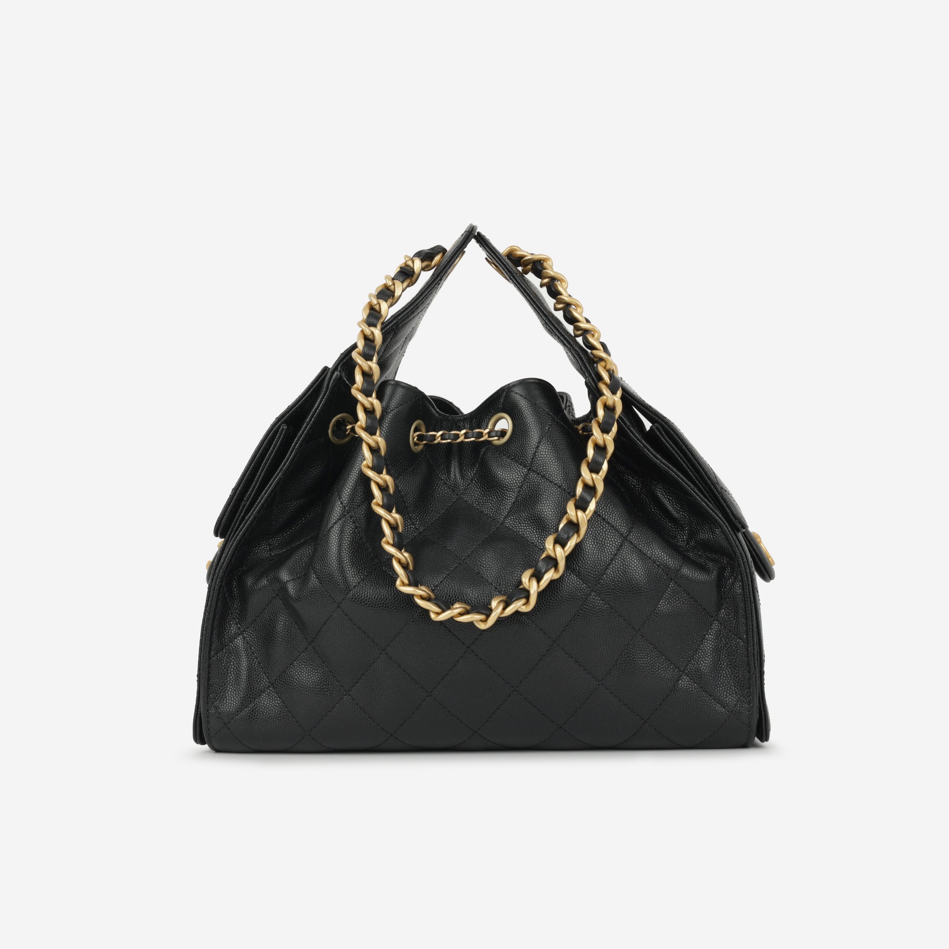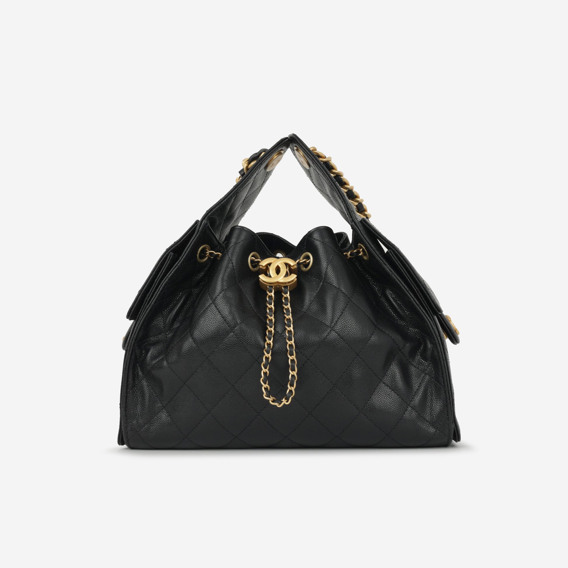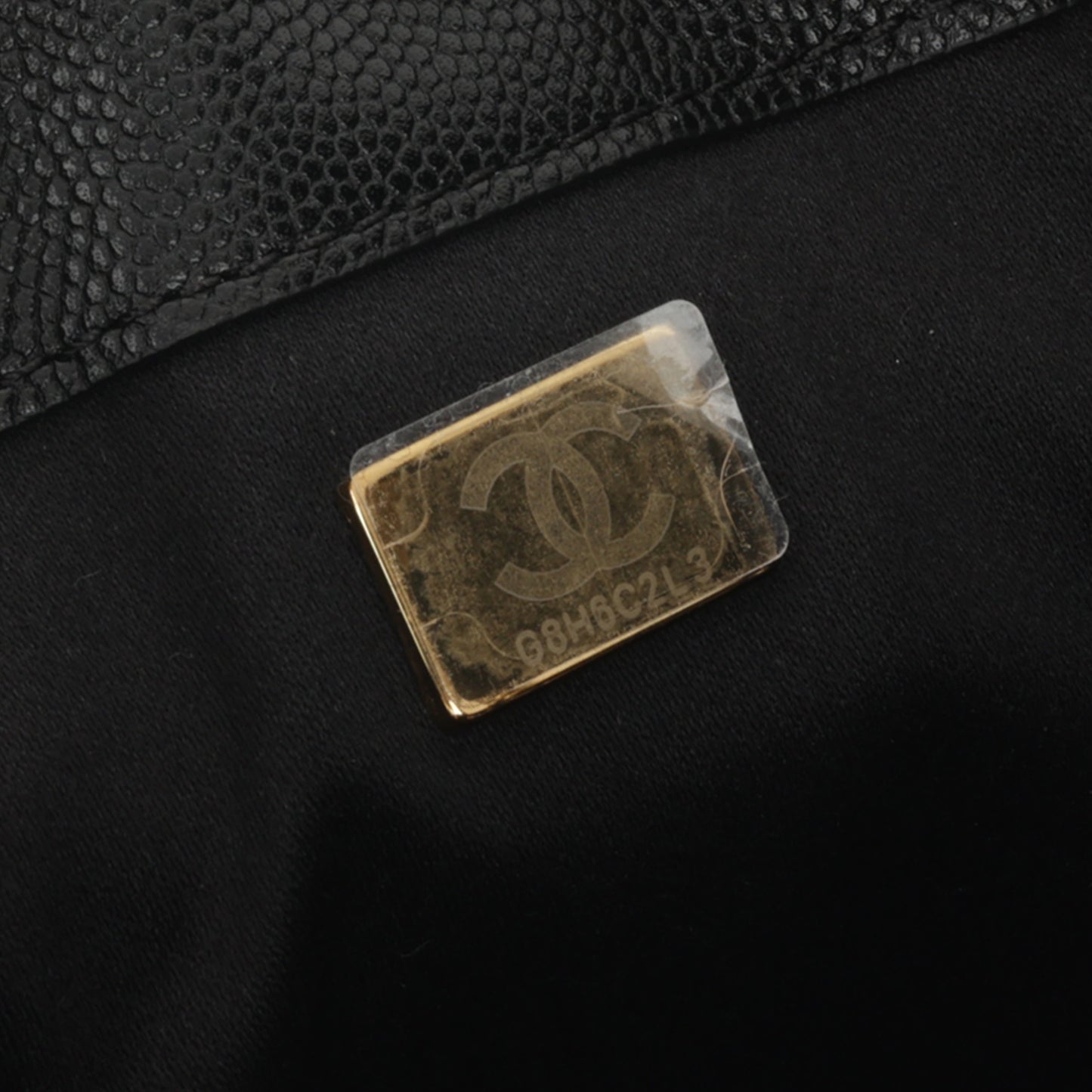 Crafted in Chanel’s iconic black caviar grained leather, renowned for its durability and luxurious texture, and finished with the signature gold-tone CC turn-lock closure. Available now at Bagista.
