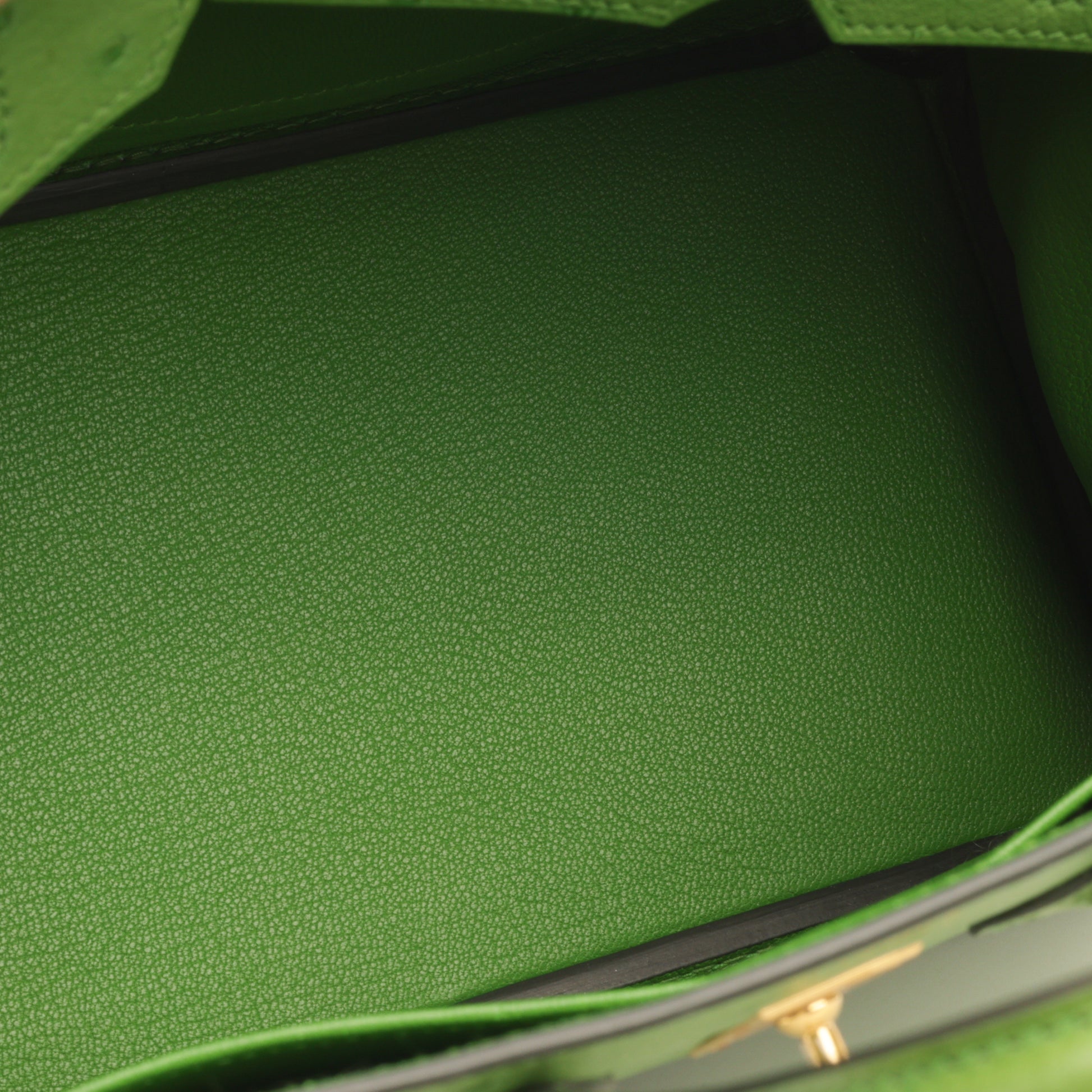 Ostrich leather is celebrated for its unique pore pattern, lightweight feel, and exceptional durability. In this model, it is paired with gold-plated hardware, creating a warm, luminous contrast against the rich green tone.
