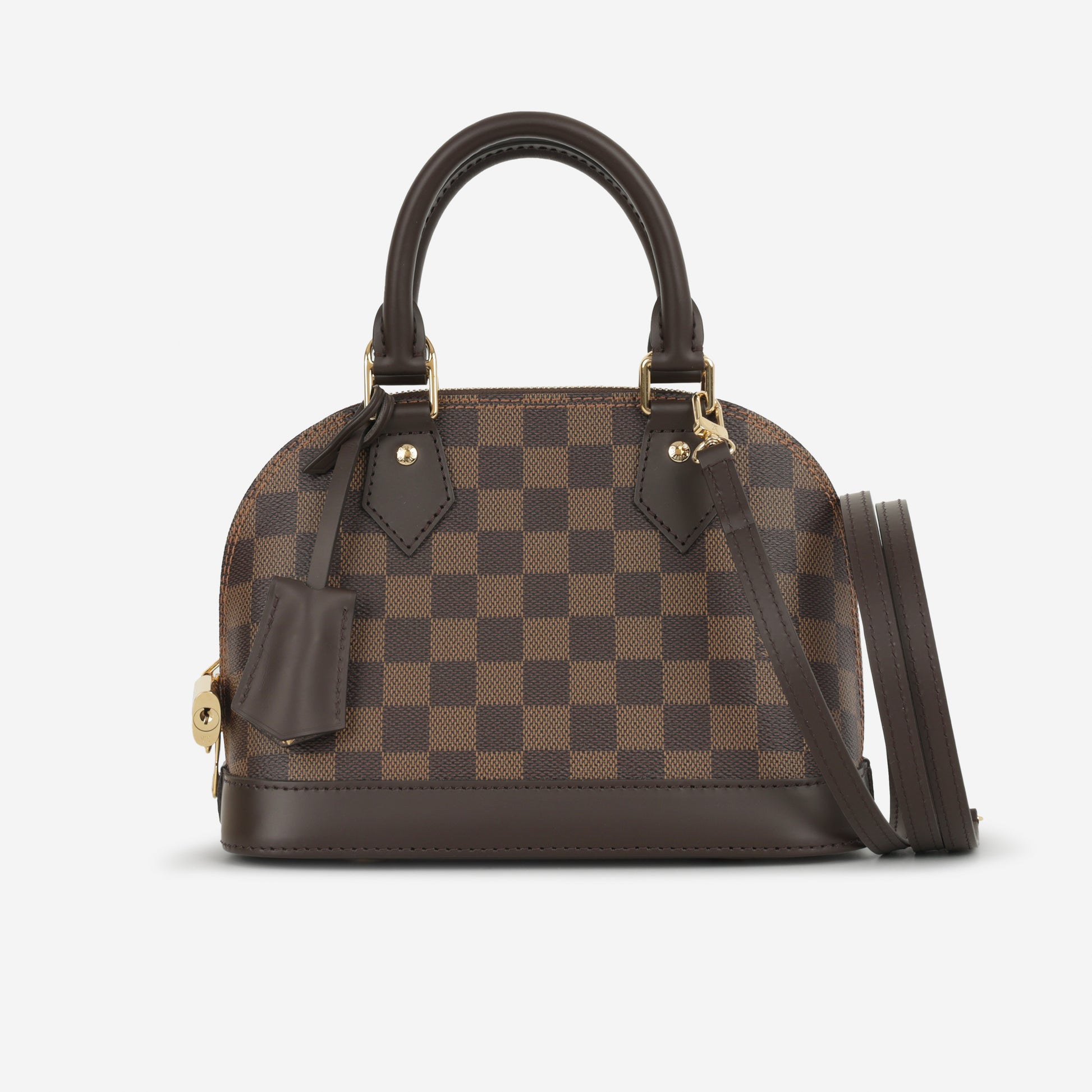 The Alma BB features a structured silhouette, top handles, and a detachable shoulder strap, making it versatile for hand carry or crossbody styling. Its classic Damier Ebene pattern paired with gold hardware ensures a sophisticated, long-lasting look.