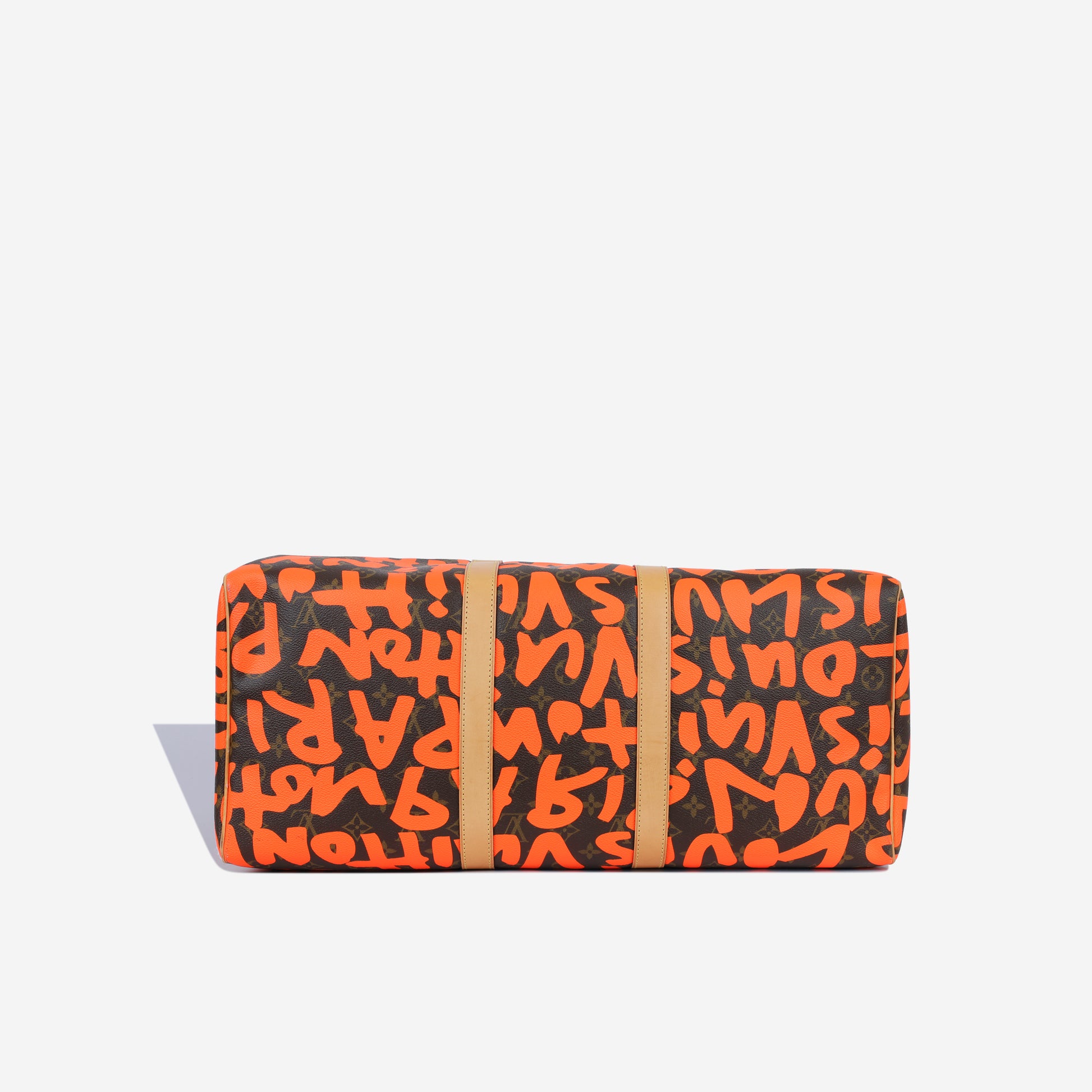 Louis Vuitton presents their signature Keepall bag in collaboration with Stephen Sprouse, making the perfect travel accessory for both men and women. Carefully crafted in the brand's iconic monogram canvas with the Graffiti text overlay, the Keepall is sleek and sophisticated and modern. Large and spacious, making it easy to carry your whole world with you wherever you go, the Keepall is also extremely lightweight.