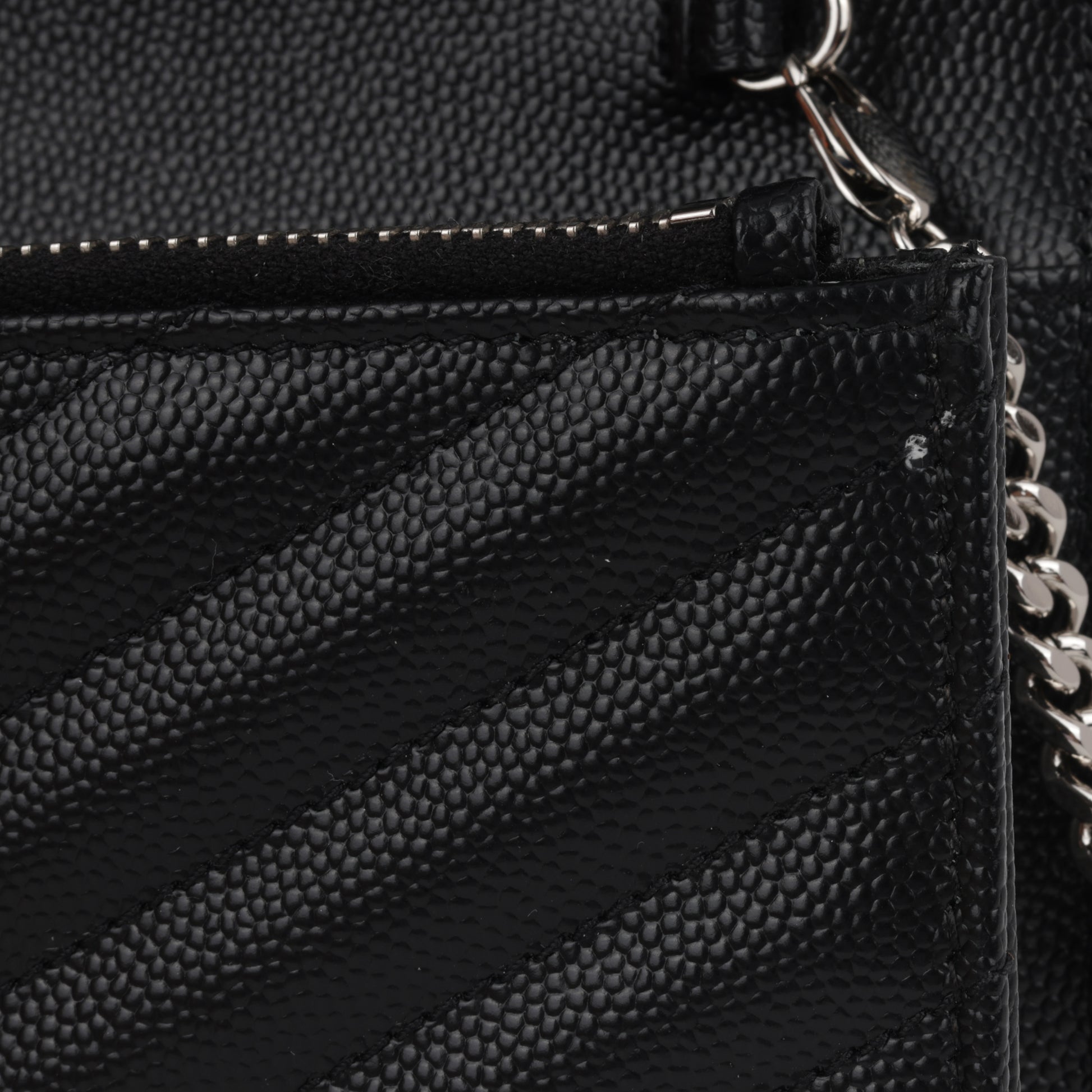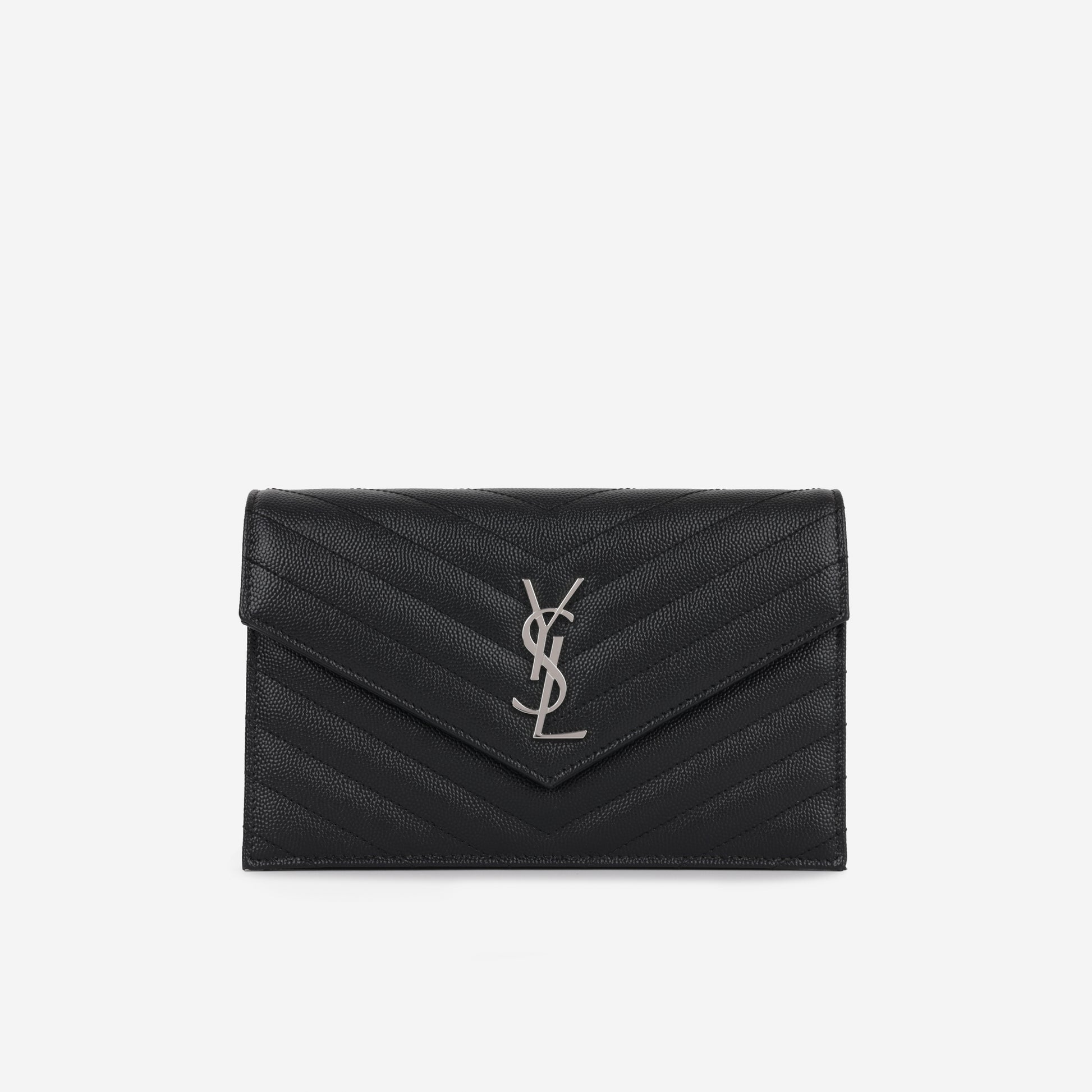 Refined. Compact. Instantly iconic. The Saint Laurent Mini Cassandre Envelope Chain Wallet in black grain de poudre calfskin offers effortless sophistication in a sleek, minimalist silhouette. The textured leather and classic chevron quilting are elevated by striking silver-tone hardware and the signature YSL Cassandre logo.