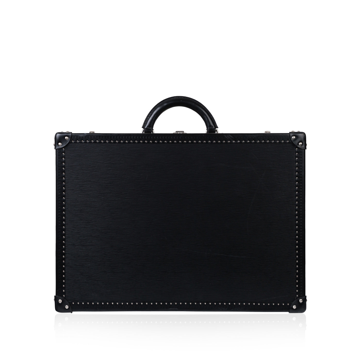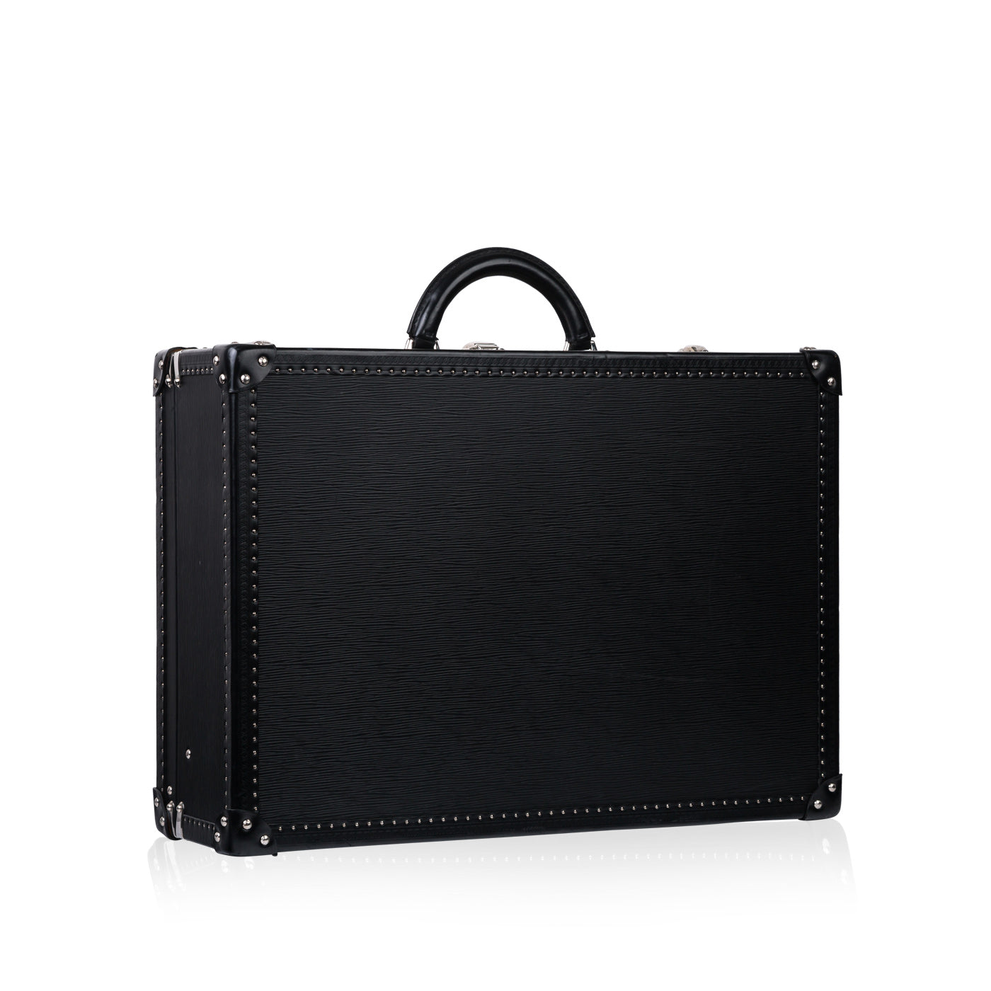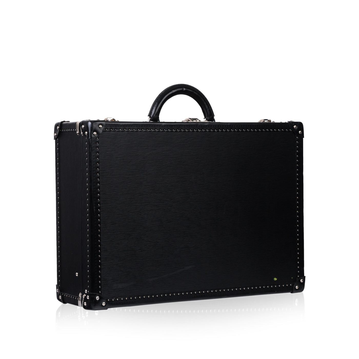 This Black EPI Leather suitcase is the perfect companion for your travel adventures. Featuring a classic trunk style that incorporates the previous original luggage designs of Louis Vuitton. With a spacious interior and an extremely sturdy exterior, you can guarantee that your items are going to be kept safely. Louis Vuitton has ensured security with this design, it comes with a 3 fastenings systems, 2 buckles and a lock with 2 spare keys. The all black leather exterior is chic and classy whilst the silver toned studs and rivets add a luxurious extra touch.