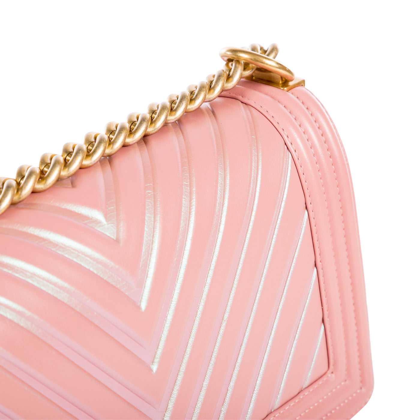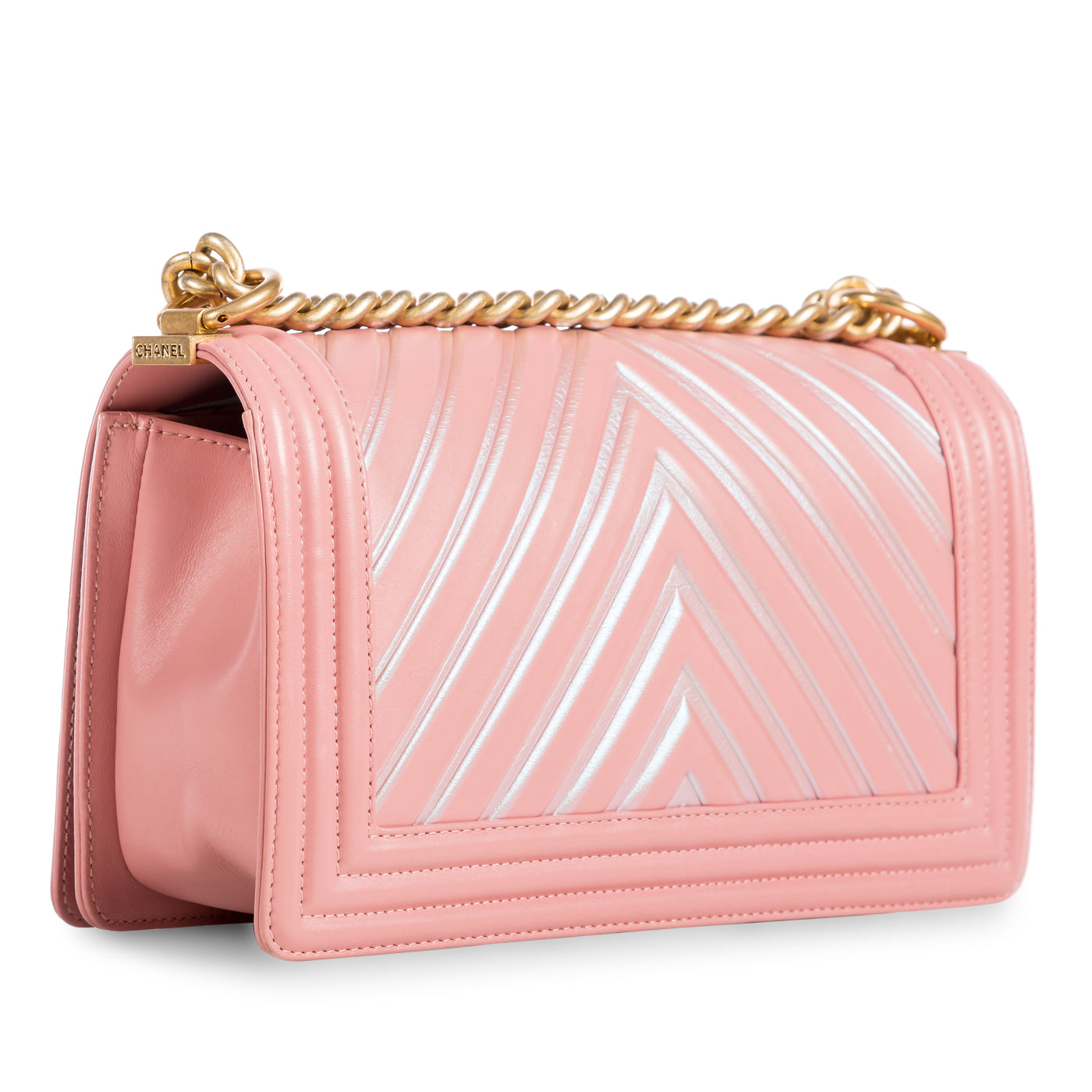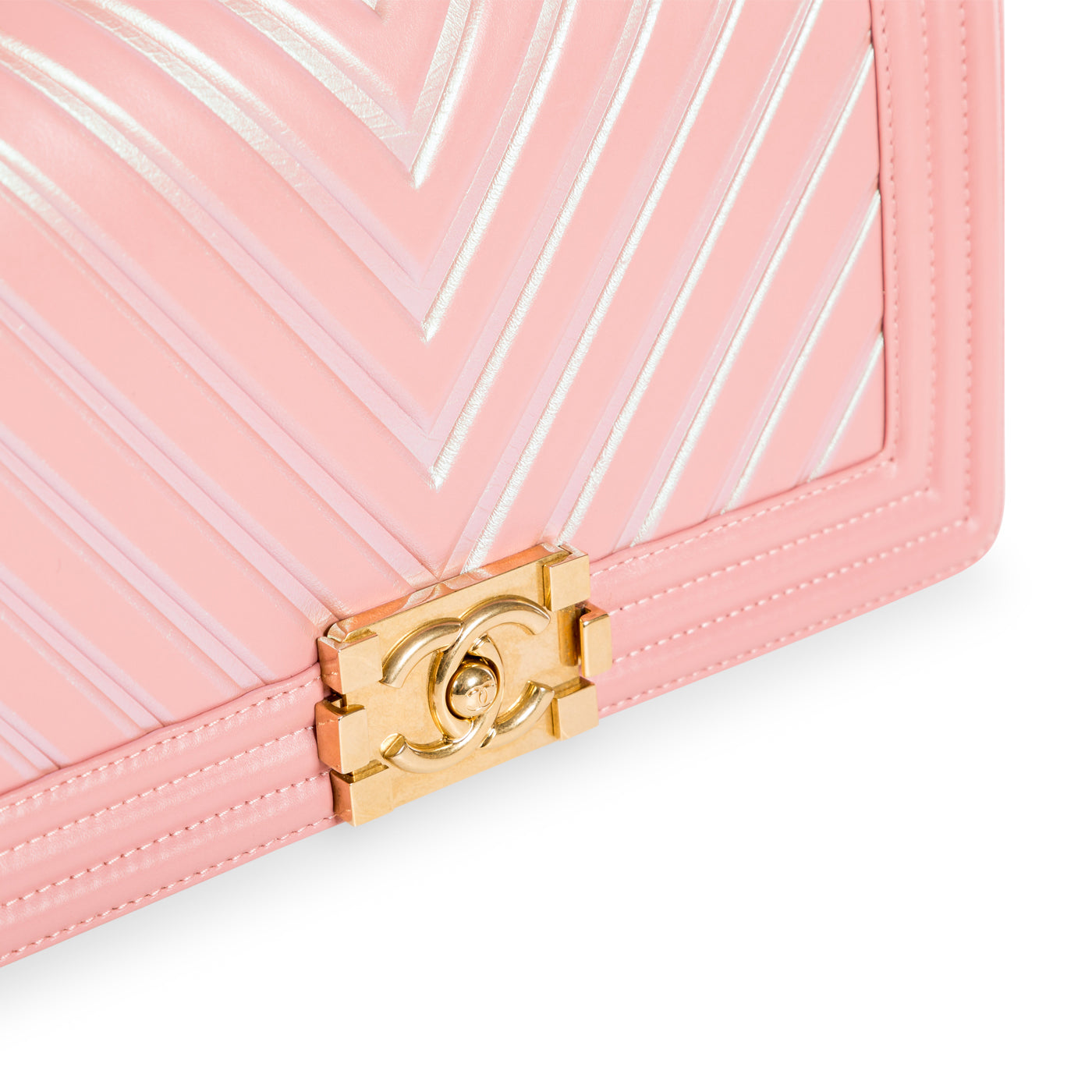 A true must-have for any major Chanel collector! Presented in their Spring/Summer 2017 collection, Chanel's Iridescent Chevron Boy bag wowed fashion lovers globally. Crafted in smooth, baby pink lambskin leather with reflective Purple/Green chevron detailing, this Boy bag is both extremely unique and rare. The perfect compliment to any neutral-toned outfit, this piece is perfect for any woman who wants to make a statement.