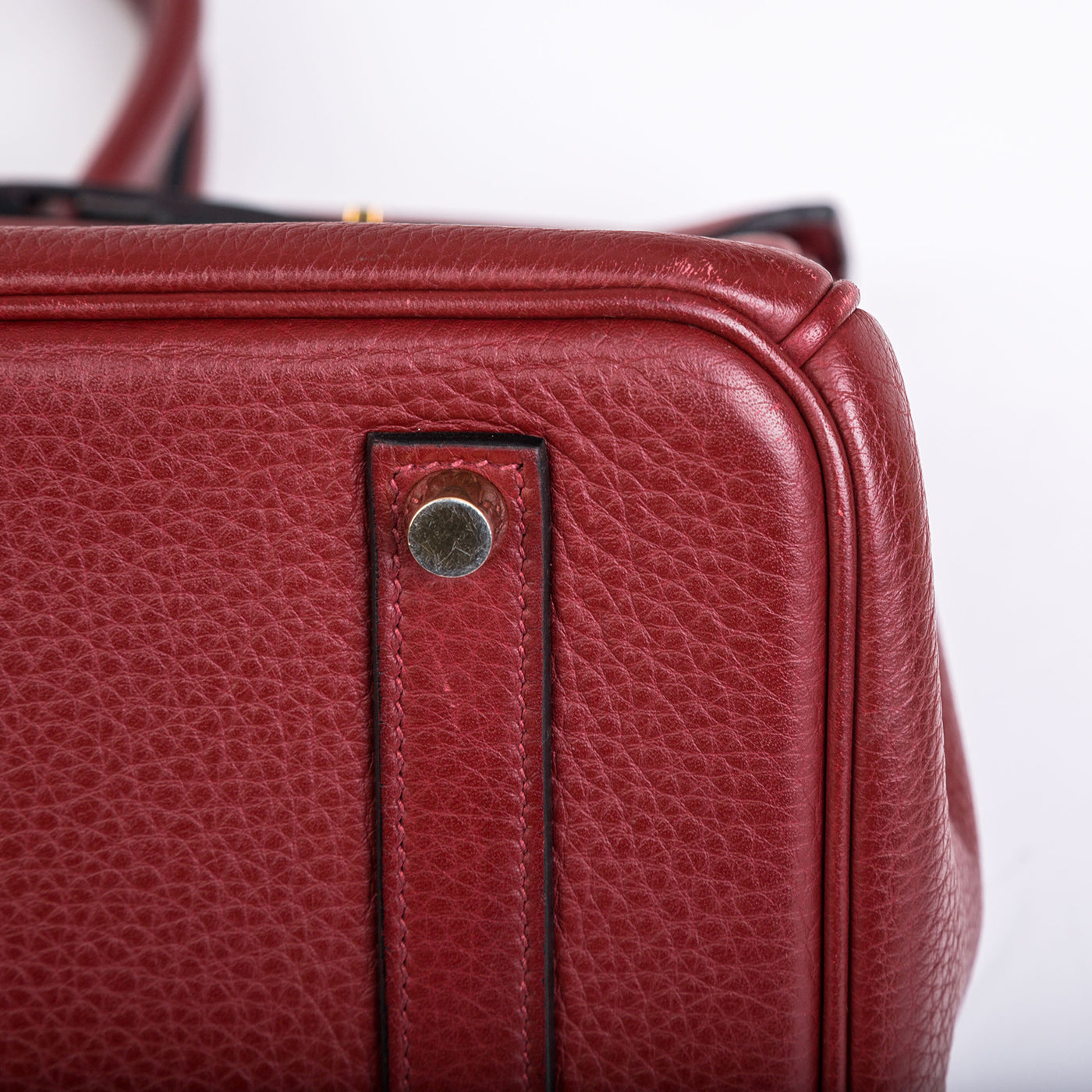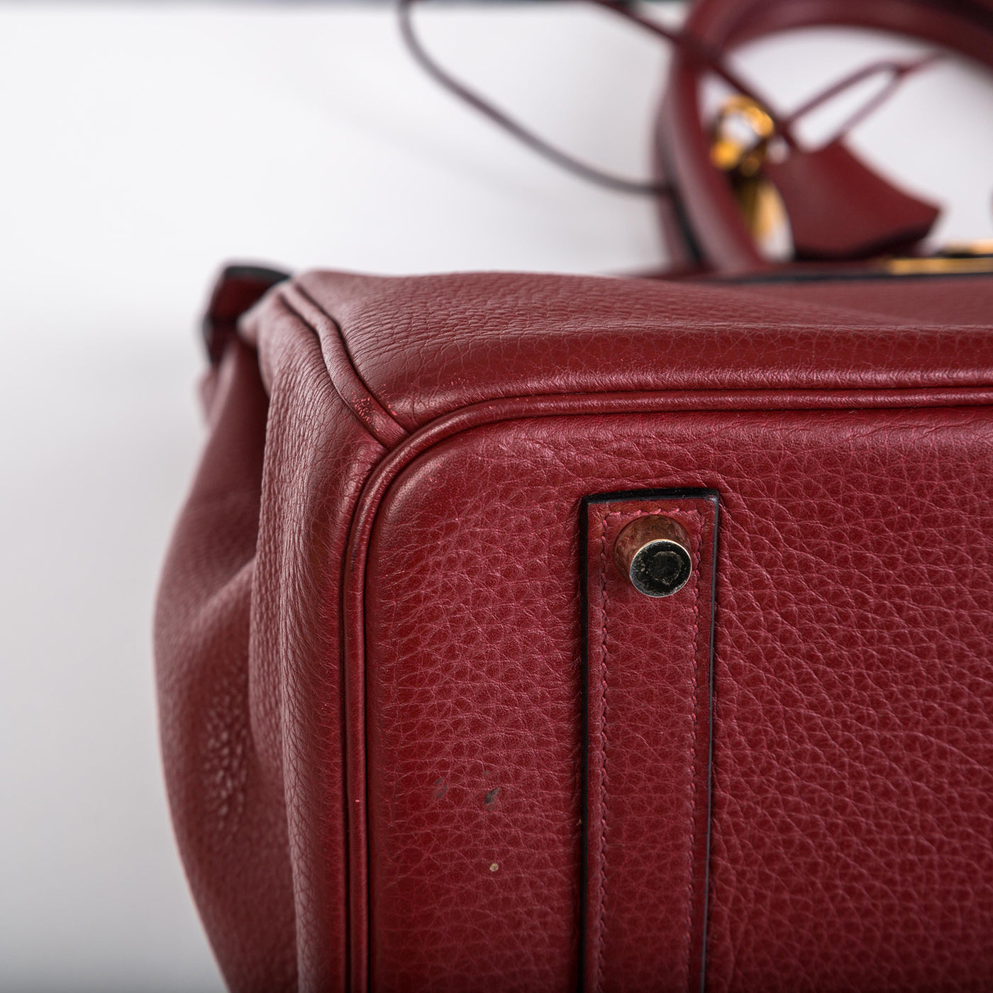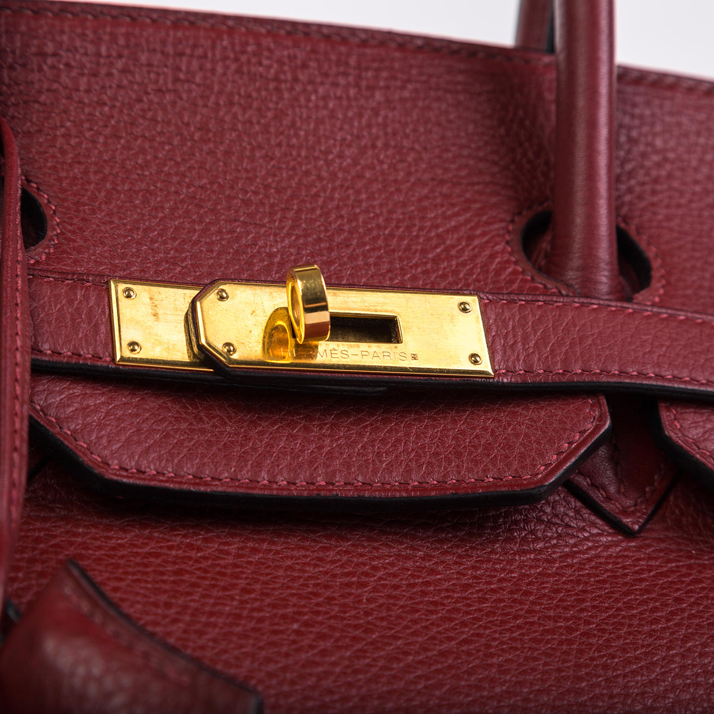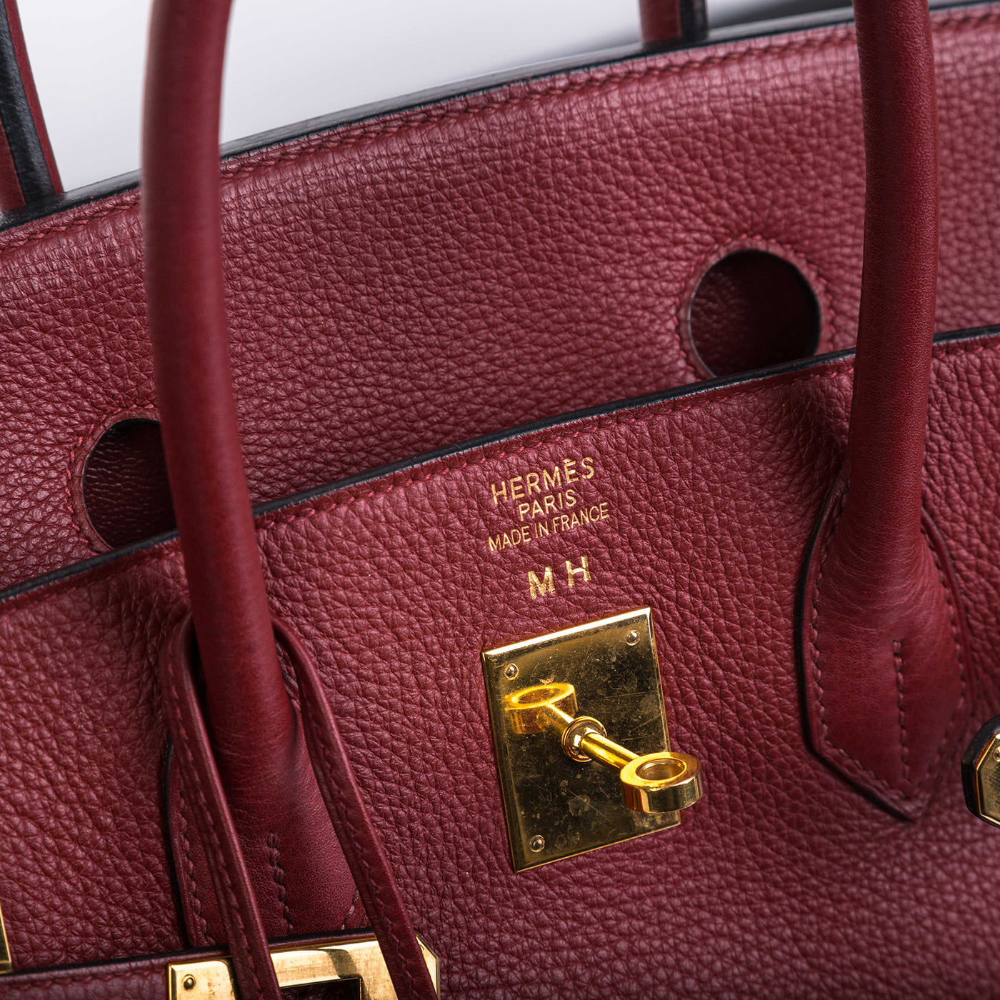 The Hermès Birkin is among the most famous bags in the world. First created in 1983 after Jean-Louis Dumas met Jane Birkin on a flight from Paris to London. In the short flight, Birkin explained that she needed a bag which was spacious enough for everything she needed to carry, with plenty of pockets as well. He sketched the first bag there and then, and the rest is history. Thirty-four years later, this bag has been created in a huge variety of styles and materials. This version of the Birkin is crafted out of stunning, Hermès Rouge Grenat Togo leather and perfectly complimented with gold-tone hardware.