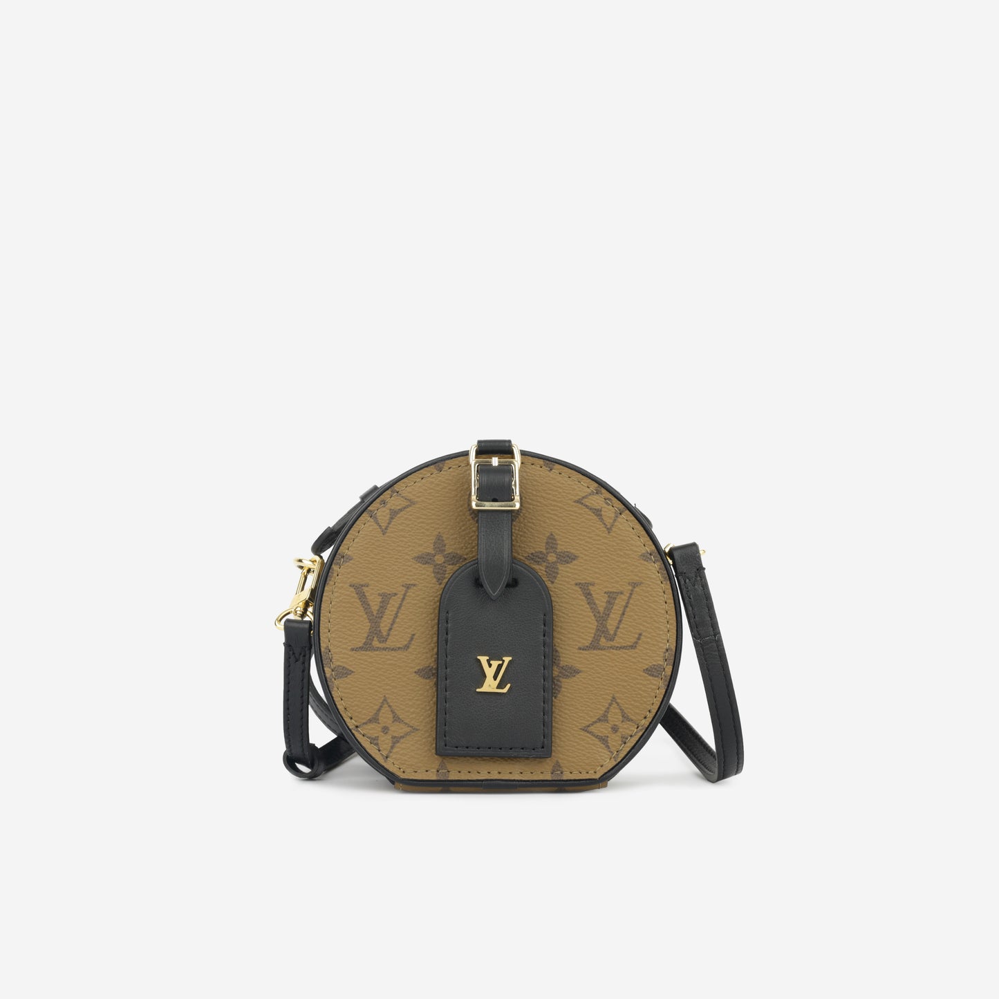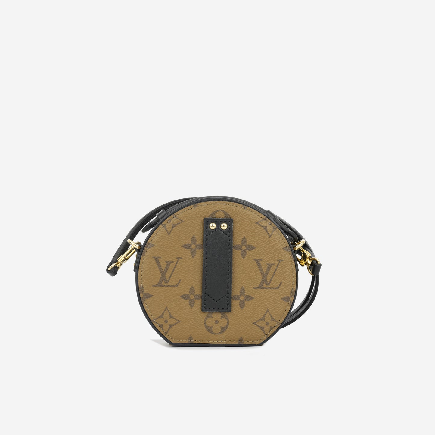 Inspired by Louis Vuitton's travel heritage, the petite boîte chapeau is crafted from reversed monogram canvas and features a non-removable crossbody strap. The black calfskin leather trims and rounded shape exudes casual elegance.