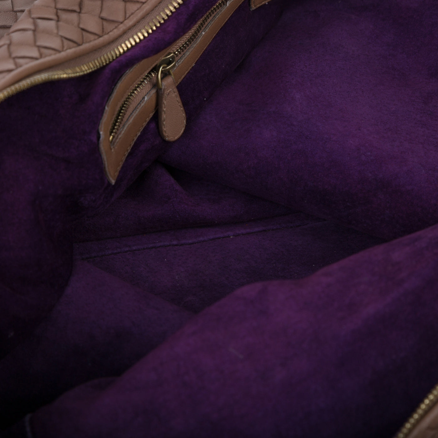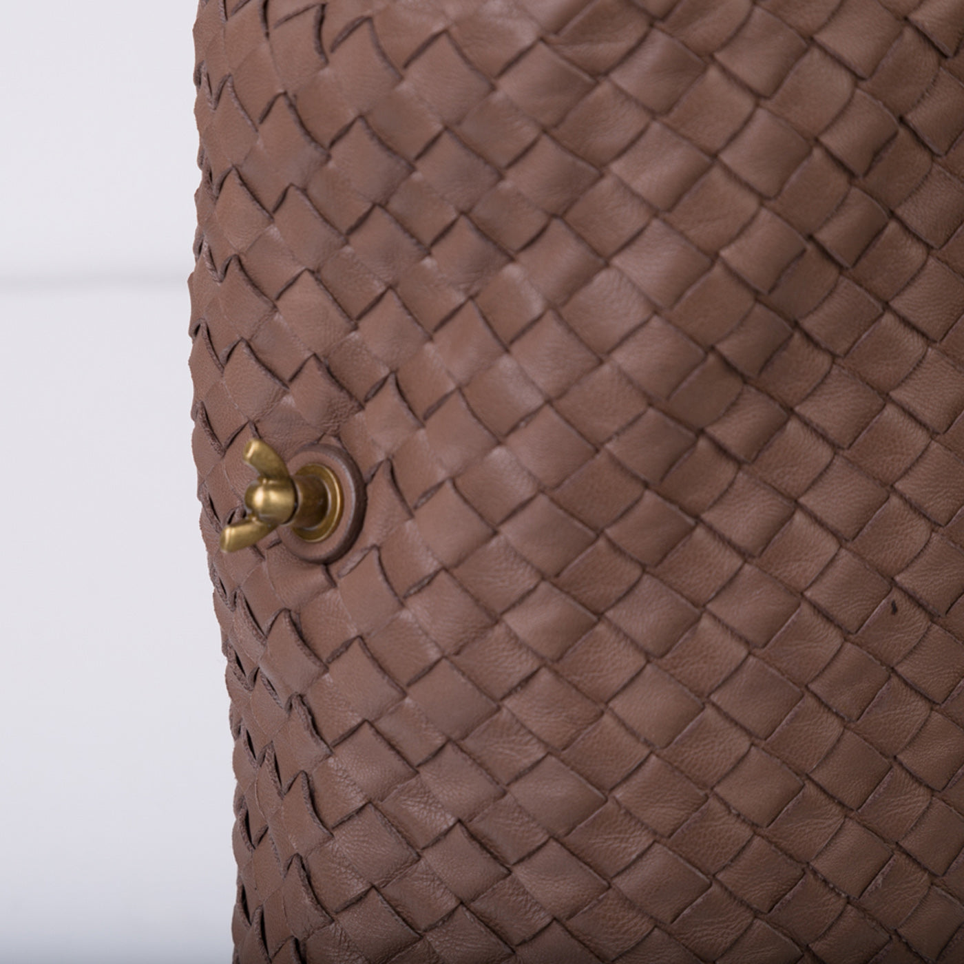 Bottega Veneta presents their large, carryall luggage bag. Carefully crafted from smooth, brown leather with their signature woven, intrecciato design, this bag is the perfect work bag for anyone looking to travel in style. Fit all your short-holiday essentials as well as your work essentials. With two top handles and a removable strap, you can easily carry this briefcase in style. With effortless sophistication and tasteful discreetness, this bag offers the best of both worlds by combining luxury and practicality.