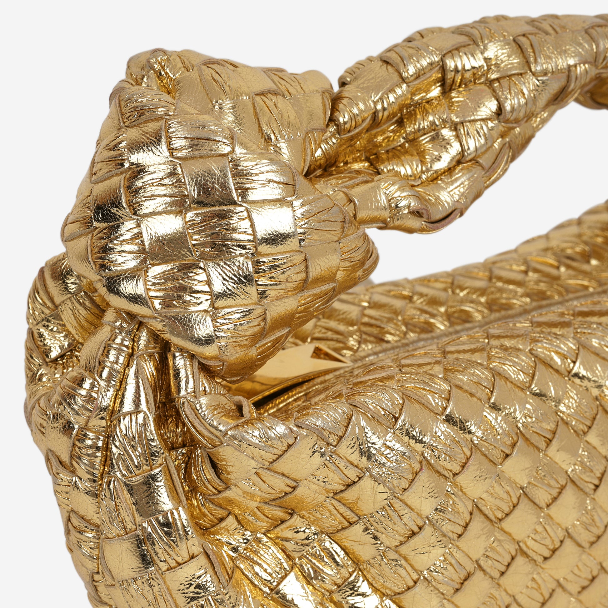 The Bottega Veneta Mini Jodie in gold metallic Intrecciato leather with gold hardware. Features the signature woven construction and knotted top handle.