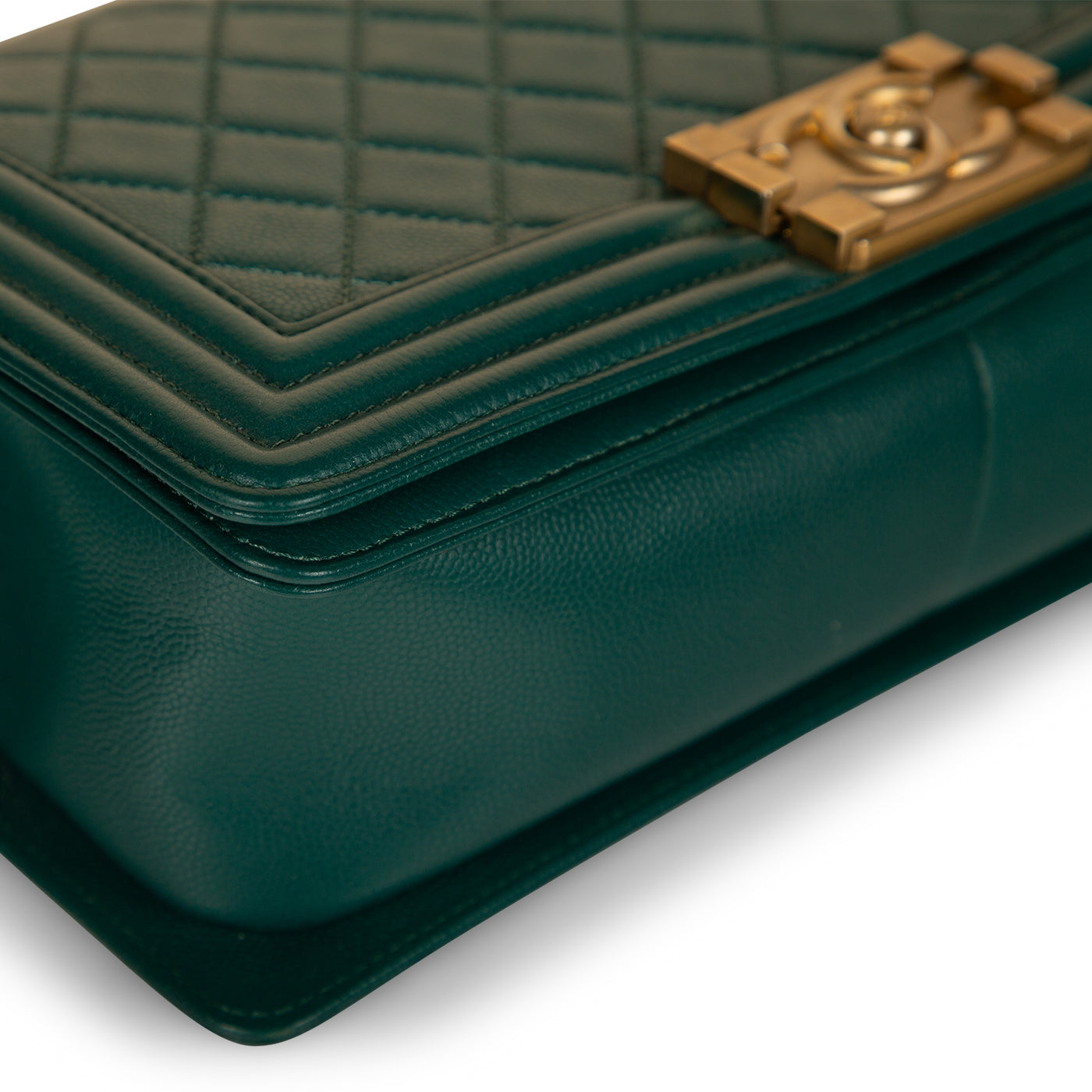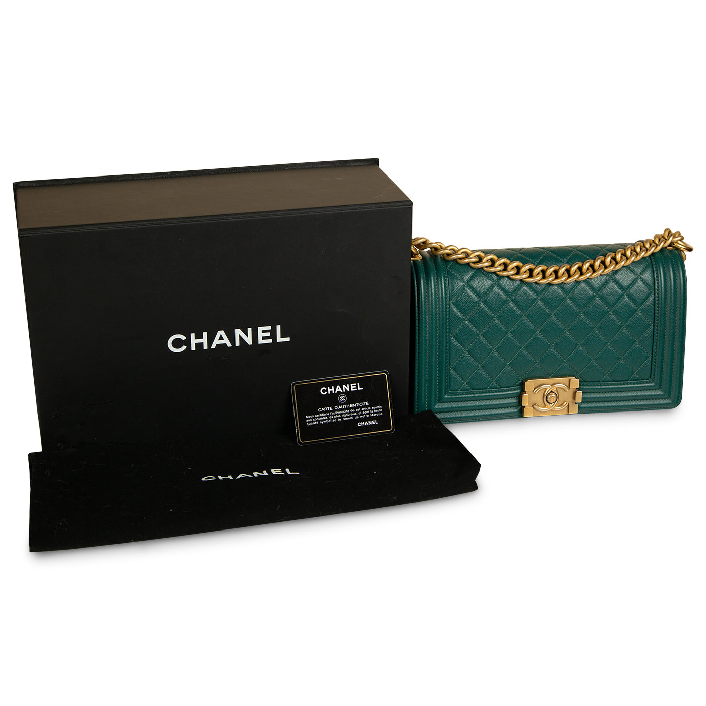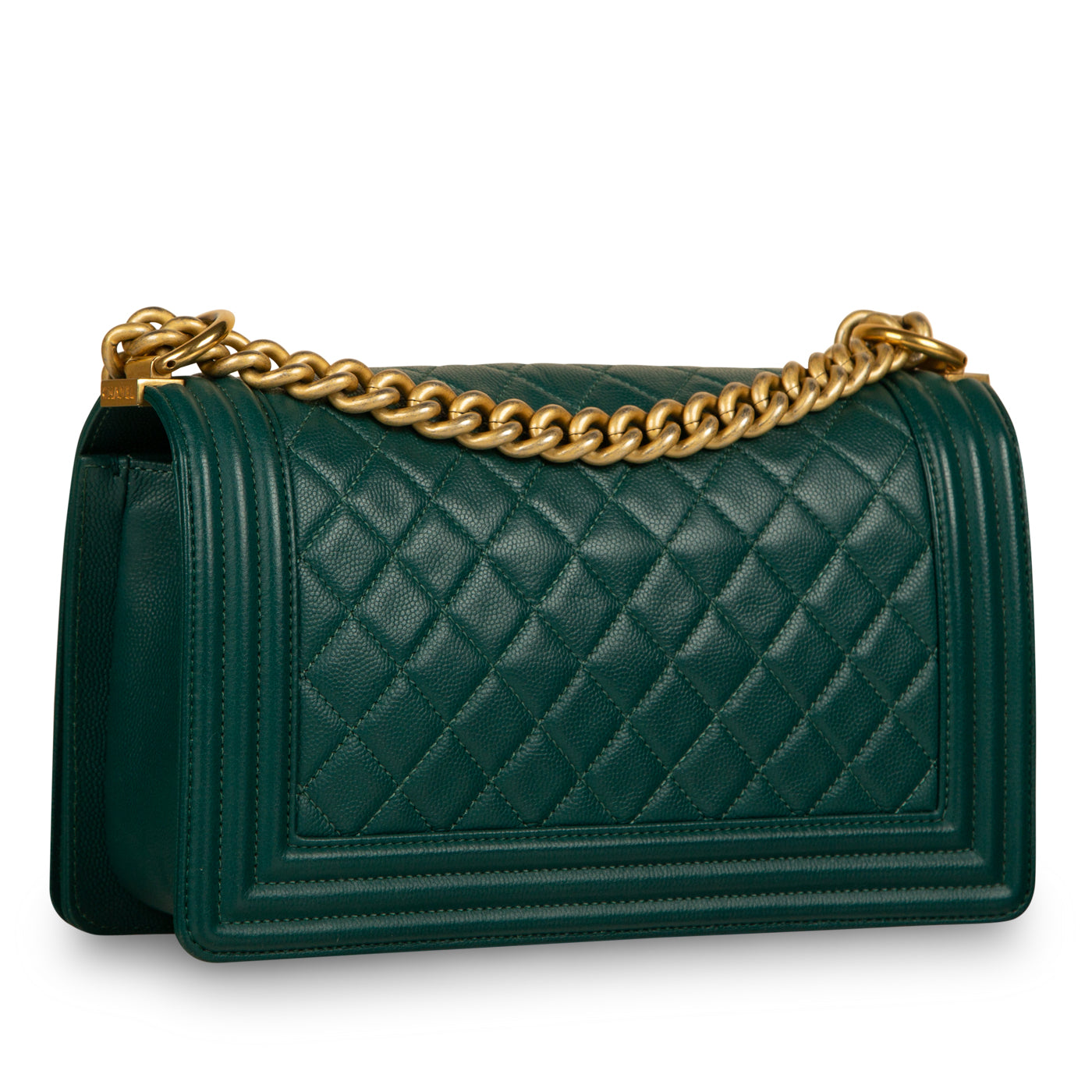 Chanel presents one of its highly-acclaimed and most sought after bags, the Chanel Boy Bag in size Old Medium in the wonderful Emerald Green Caviar Leather and Antique Gold Hardware. As designed by Karl Lagerfeld, the Boy Bag collection was established to embody boyish charm and femininity.