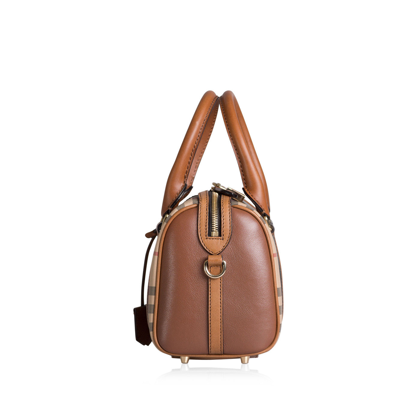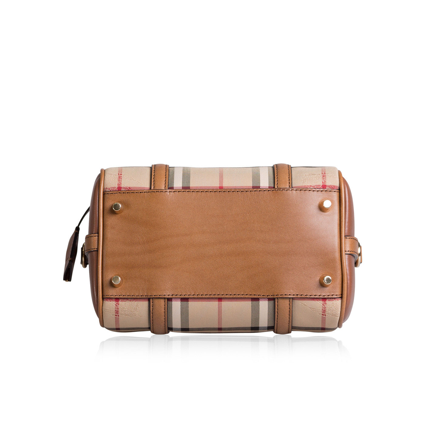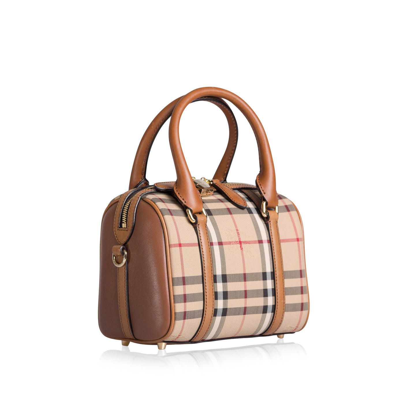 The Alchester mini bowling-bag by Burberry transforms your traditional bowling bag into a classy, all-occasion must-have! The cotton cloth is adorned in the iconic Burberry house check, turning heads almost automatically! This piece features contrasting, tan-coloured rolled leather handles, a top zip closure, detachable shoulder strap and oversized leather pulls.