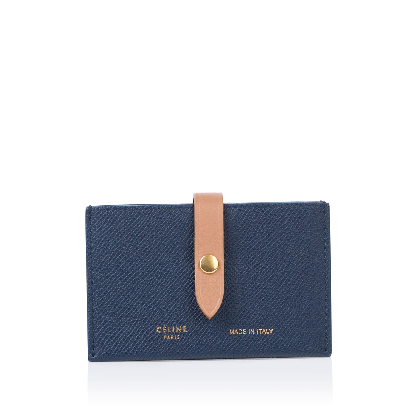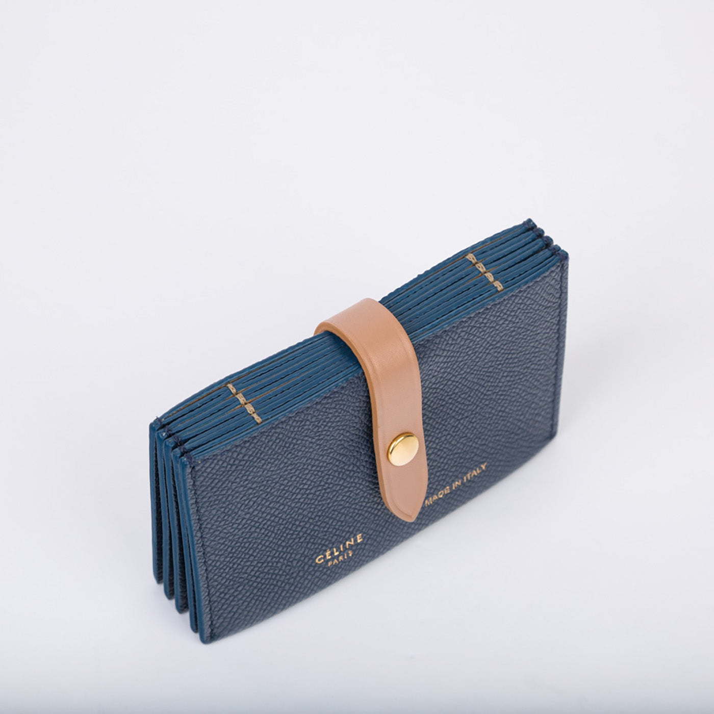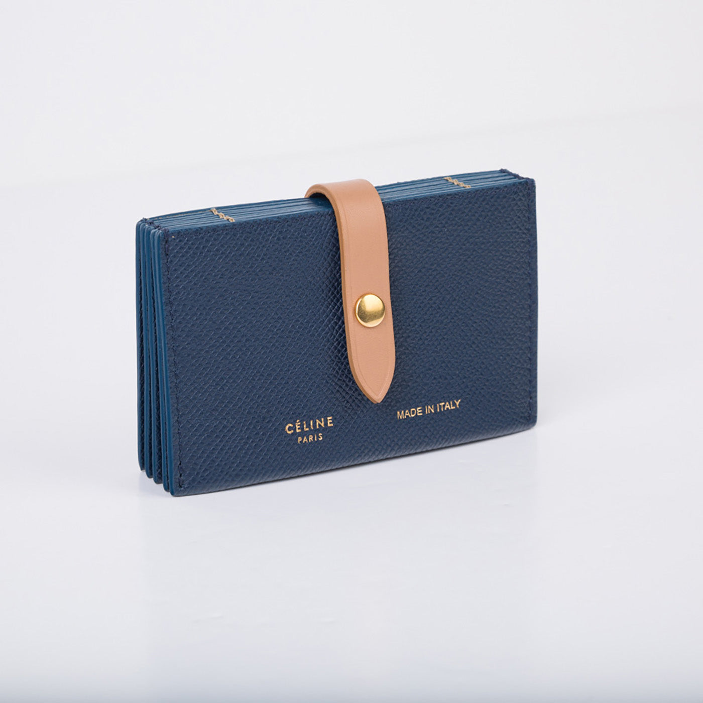 Carefully crafted from navy, grained leather with a delicate beige strap, Céline presents their stunning Accordion cardholder. With space for 5 different cards, this card holder is ideal for any woman who doesn't carry cash or change. Throw this piece into any bag, big or small, and be on your way. Truly a luxurious piece, Céline is known for creating timeless items that will remain elegant and classy forever.