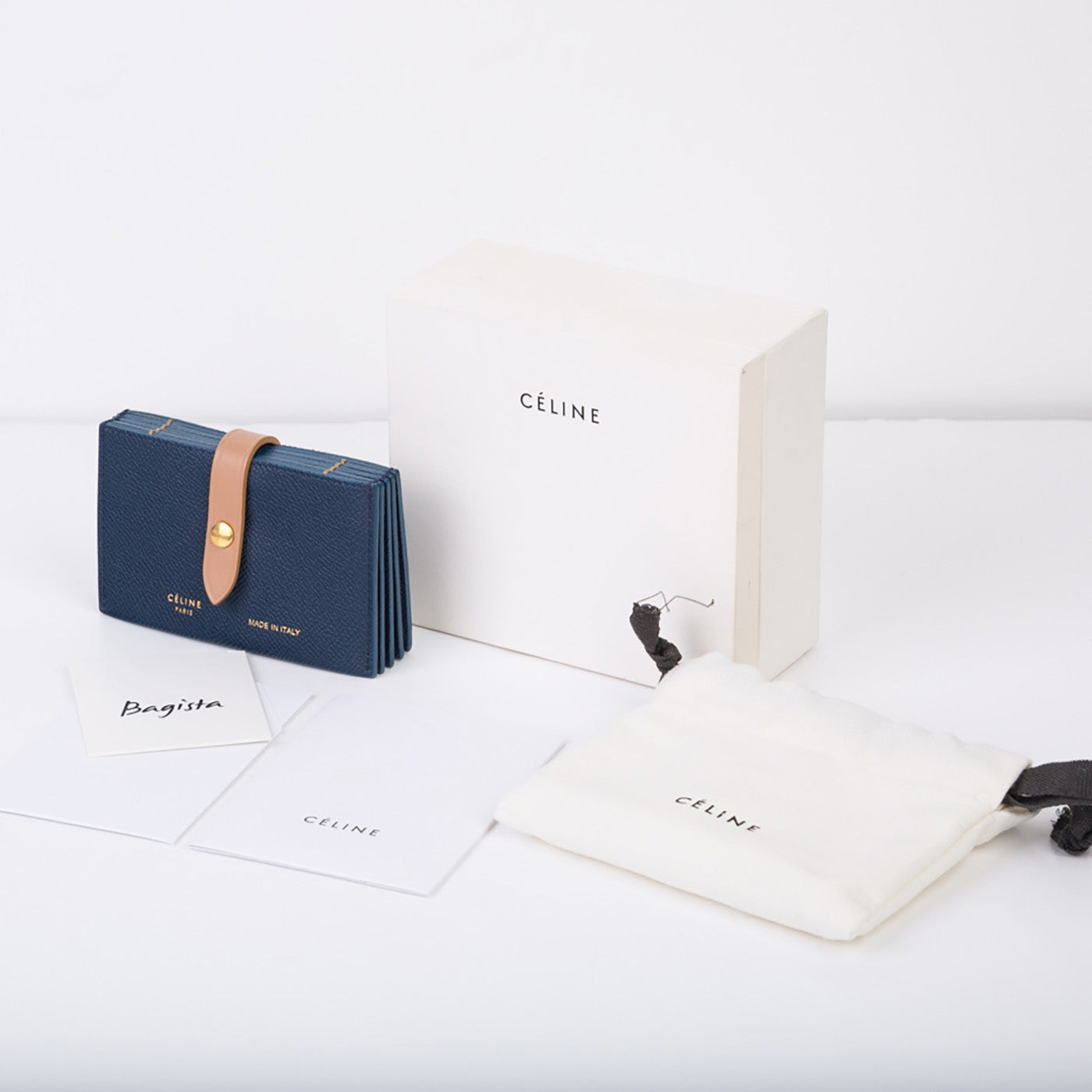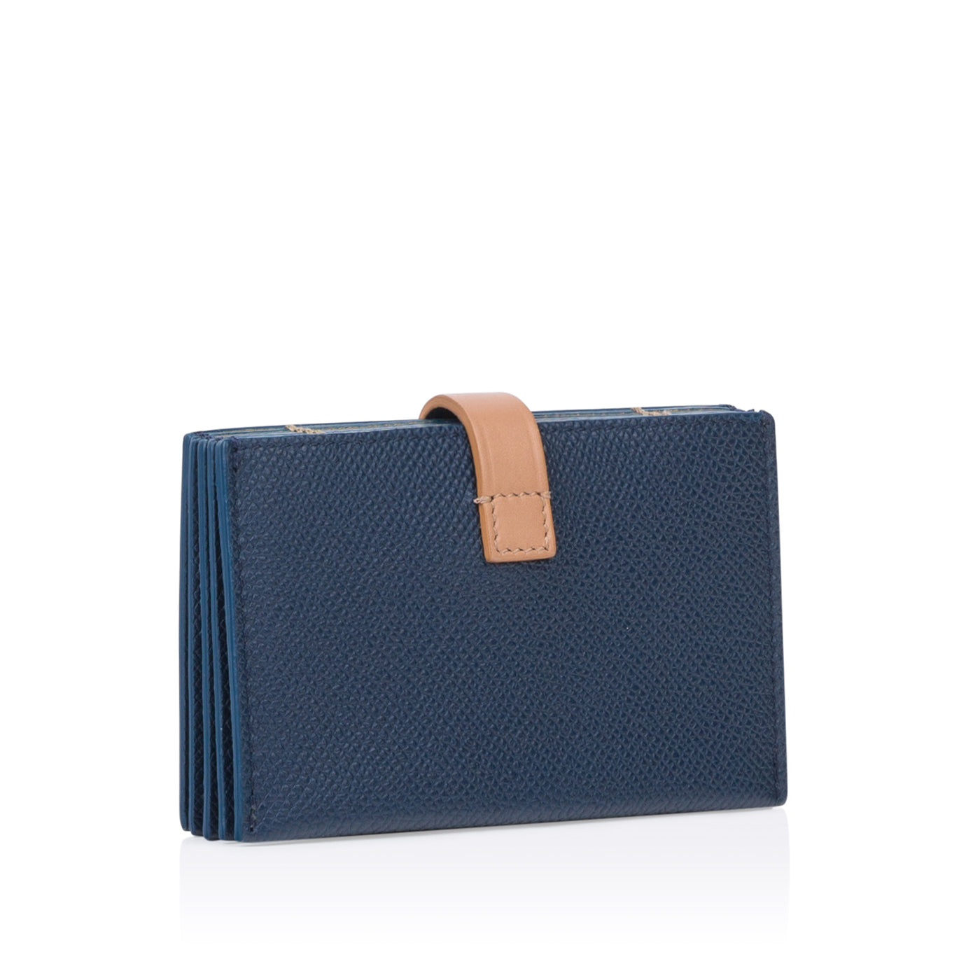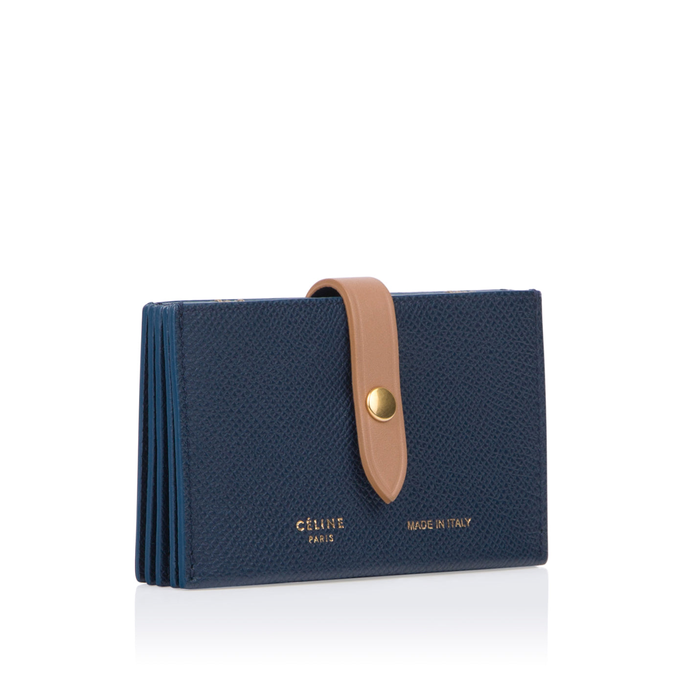 Carefully crafted from navy, grained leather with a delicate beige strap, Céline presents their stunning Accordion cardholder. With space for 5 different cards, this card holder is ideal for any woman who doesn't carry cash or change. Throw this piece into any bag, big or small, and be on your way. Truly a luxurious piece, Céline is known for creating timeless items that will remain elegant and classy forever.