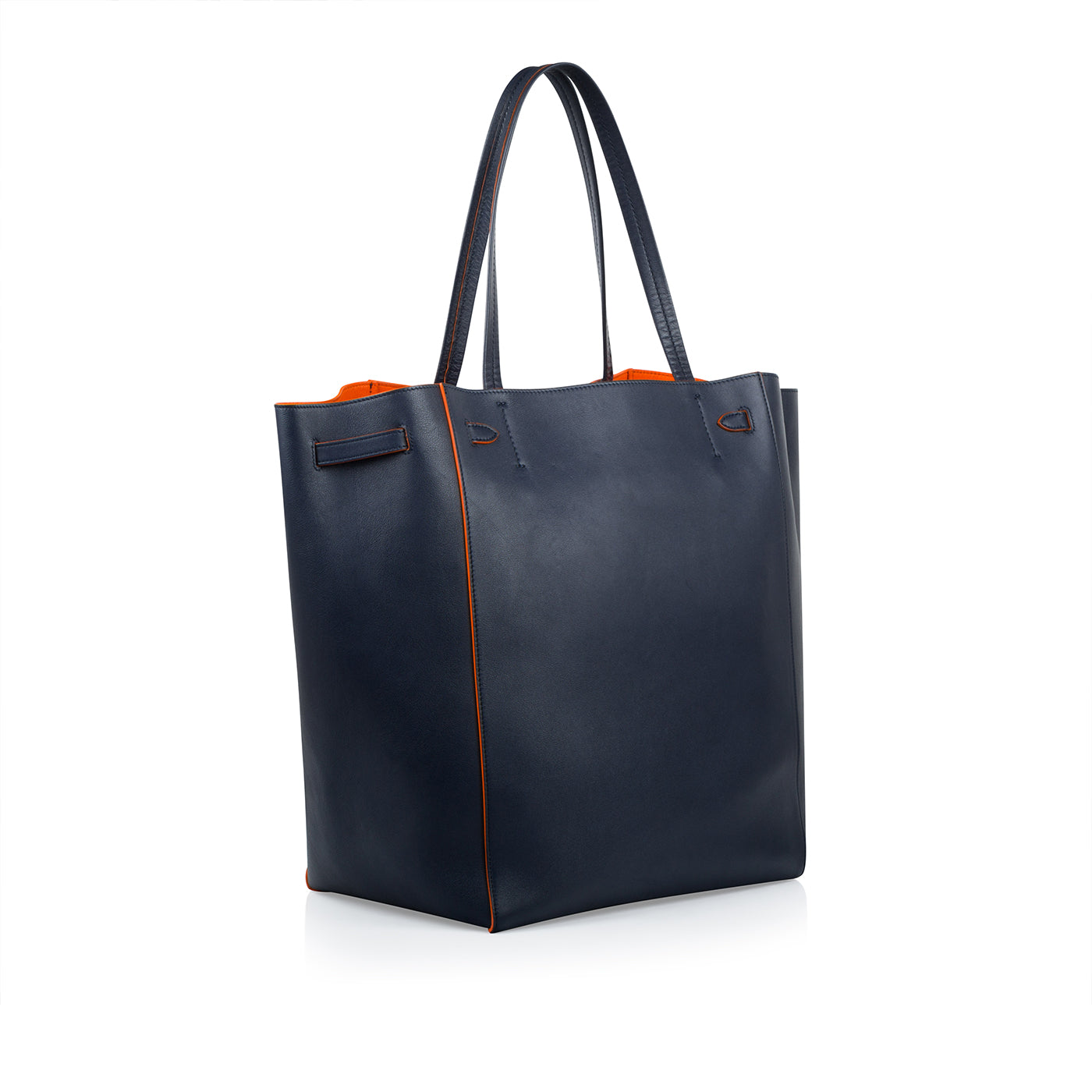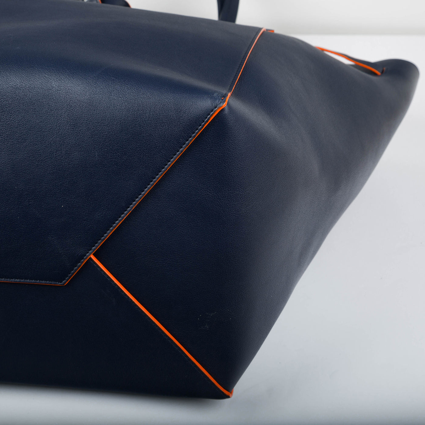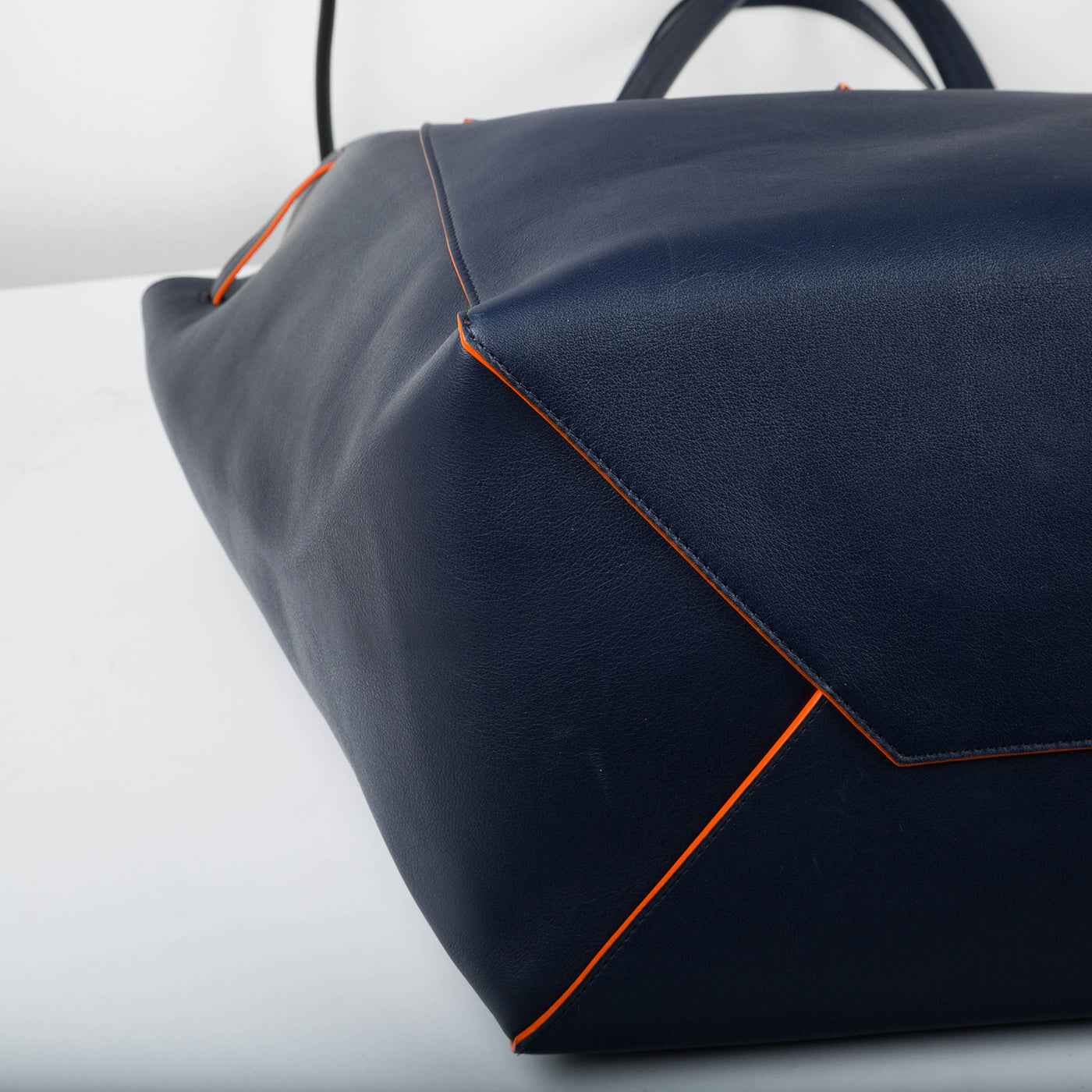 From the brand's Spring 2015 collection, Céline presents their stunning Phantom Cabas tote. Carefully crafted in smooth navy calfskin with orange trimming, this bag is the ultimate accessory for any woman with a love for luxury and a lot to carry. Céline is acclaimed for their low-key vibes while balancing their reputation for creating the most luxurious pieces - and this bag is no exception. Exuding a true "if you know, you know" aesthetic, this understated handbag is for a chic woman with a simple sense of style. Though it might not be the definition of glamorous, it is the definition of luxurious with its quality craftsmanship and durable leather that can easily hold your entire world inside. Elegant and timeless, the Phantom cabs is a well-worthy addition to any luxury handbag collection.
