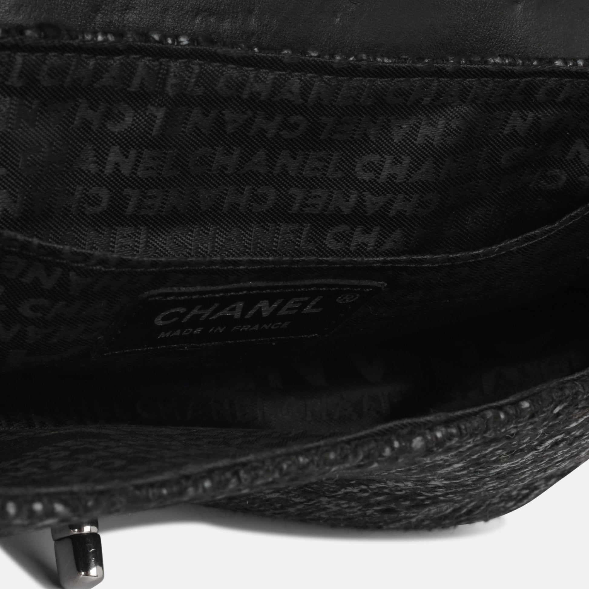 Crafted from iridescent black wool tweed, this Chanel flap is embellished with a Swarovski Strass crystal and fringe centre, featuring the signature CC twist-lock. Coming from the 2006 collection makes this a true vintage collector's piece.
