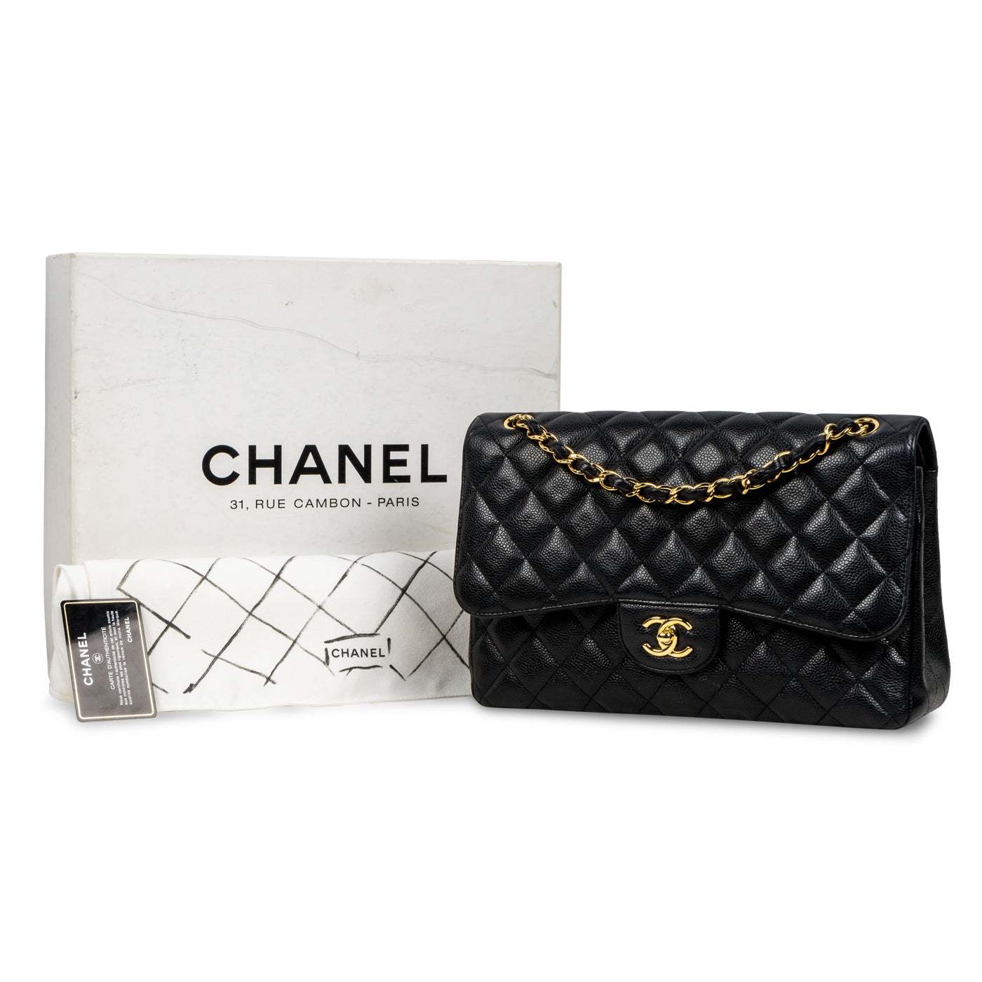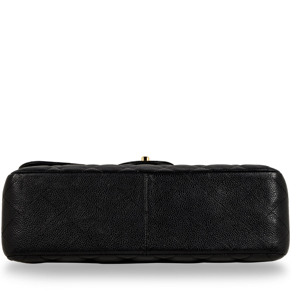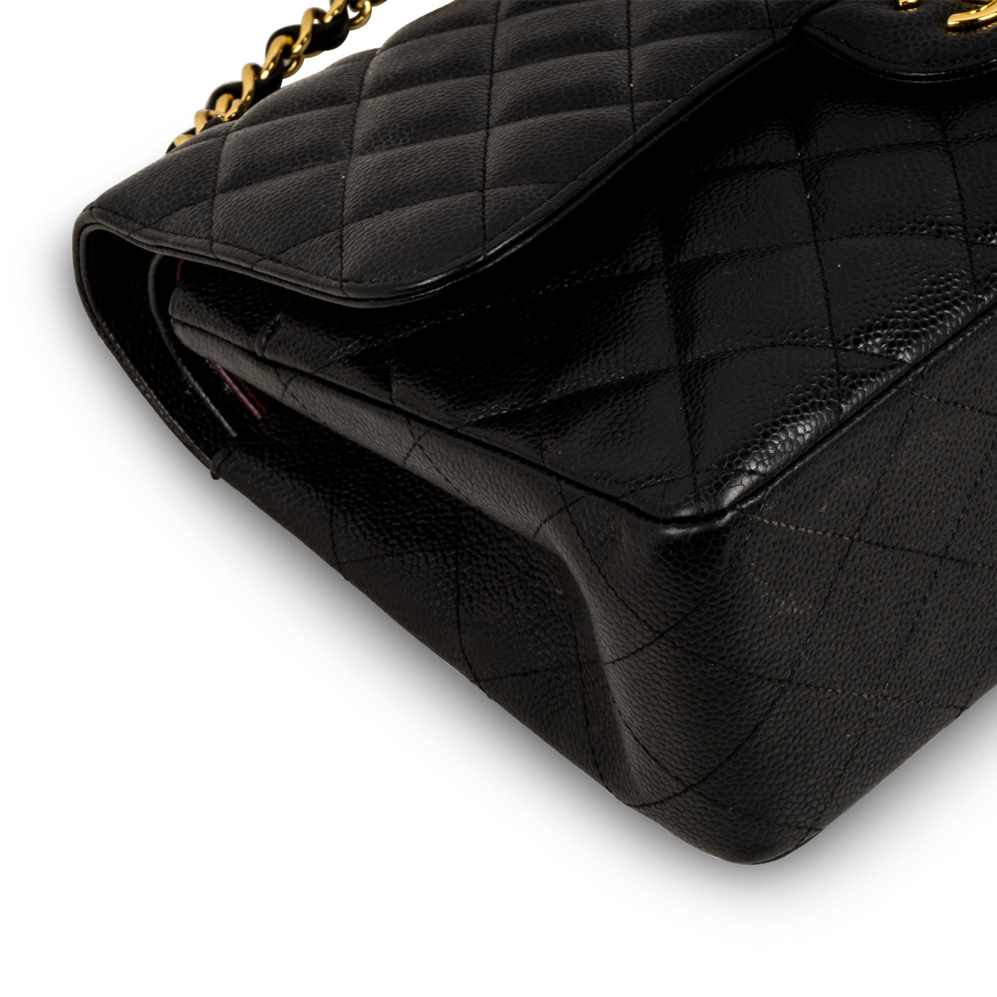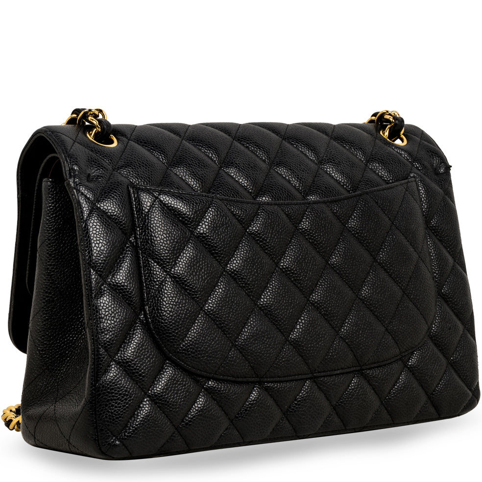 Chanel continues to present its signature line of Classic Flap bags. Under the creative direction of Karl Lagerfeld, the Classic Flap is perhaps the most acclaimed bag in all of fashion history. Timeless, elegant and sophisticated, it's no wonder the Classic Flap is, well, a classic. Featuring its infamous quilted caviar leather and interwoven chain / leather strap, the Jumbo is an absolute must-have in any luxury handbag collection. Not only is this highly coveted, this stunning black bag the perfect compliment to pretty much anything you may own in your wardrobe, but it's also an investment piece that will never lose its value. Embodying elegance and traditional femininity to a T, a Chanel bag is a purchase you won't ever regret.