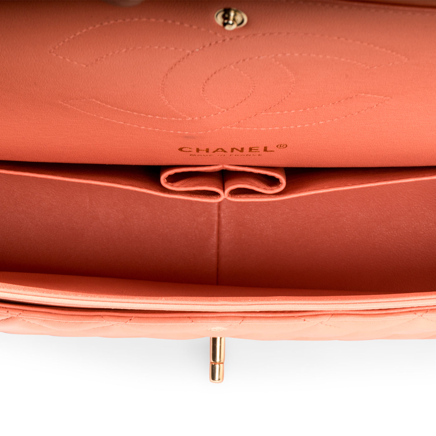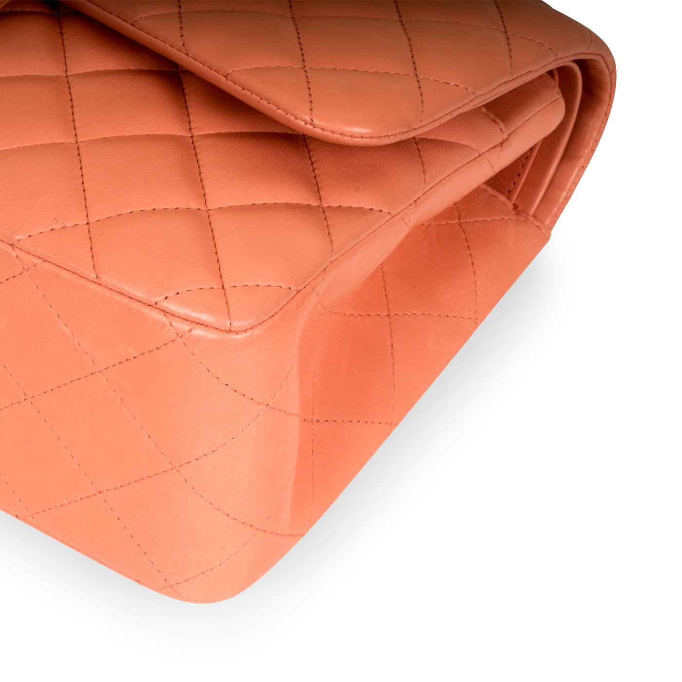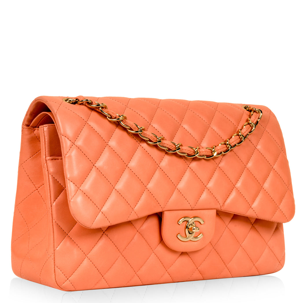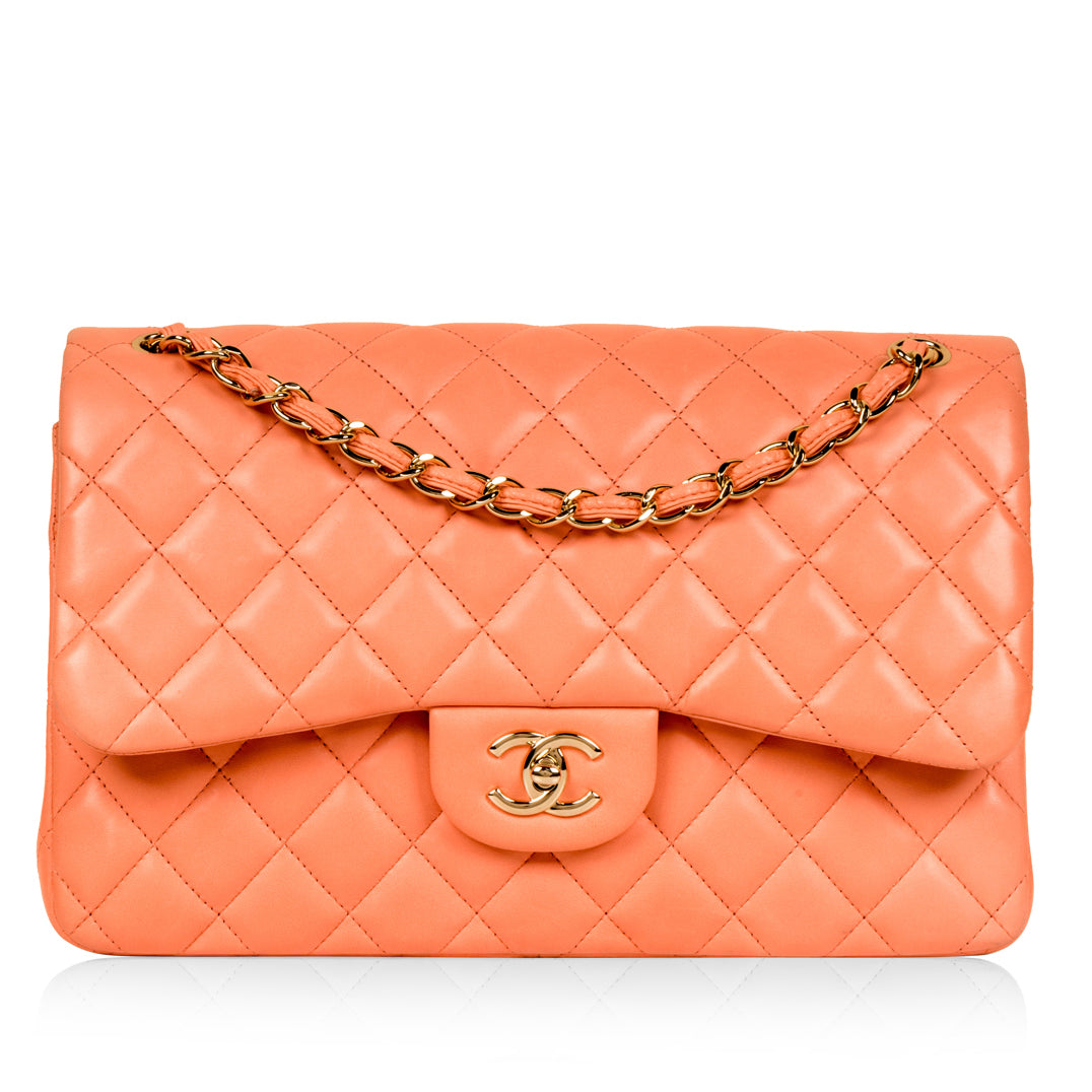 Under Karl Lagerfeld’s creative direction, Chanel continues to release its line of Classic Flap bags. Characterised by its magnificent peach quilted exterior, Chanel presents the Chanel Peach Jumbo. Much like the rest of Chanel’s classic flap bags, the Peach Jumbo is crafted from their magnificent lambskin leather and decorated with their gold toned hardware, creating a dazzling air of opulence. The bag bears the fashion house’s iconic CC turn lock closure and the highly-acclaimed interwoven chain. The bag’s interior features a ravishing peach leather lining, much like its exterior, alongside a oversized CC embossing, not to mention the iconic double flap. With its unique colour and magnificent silhouette, Chanel’s Peach Jumbo is most definitely a very rare piece.