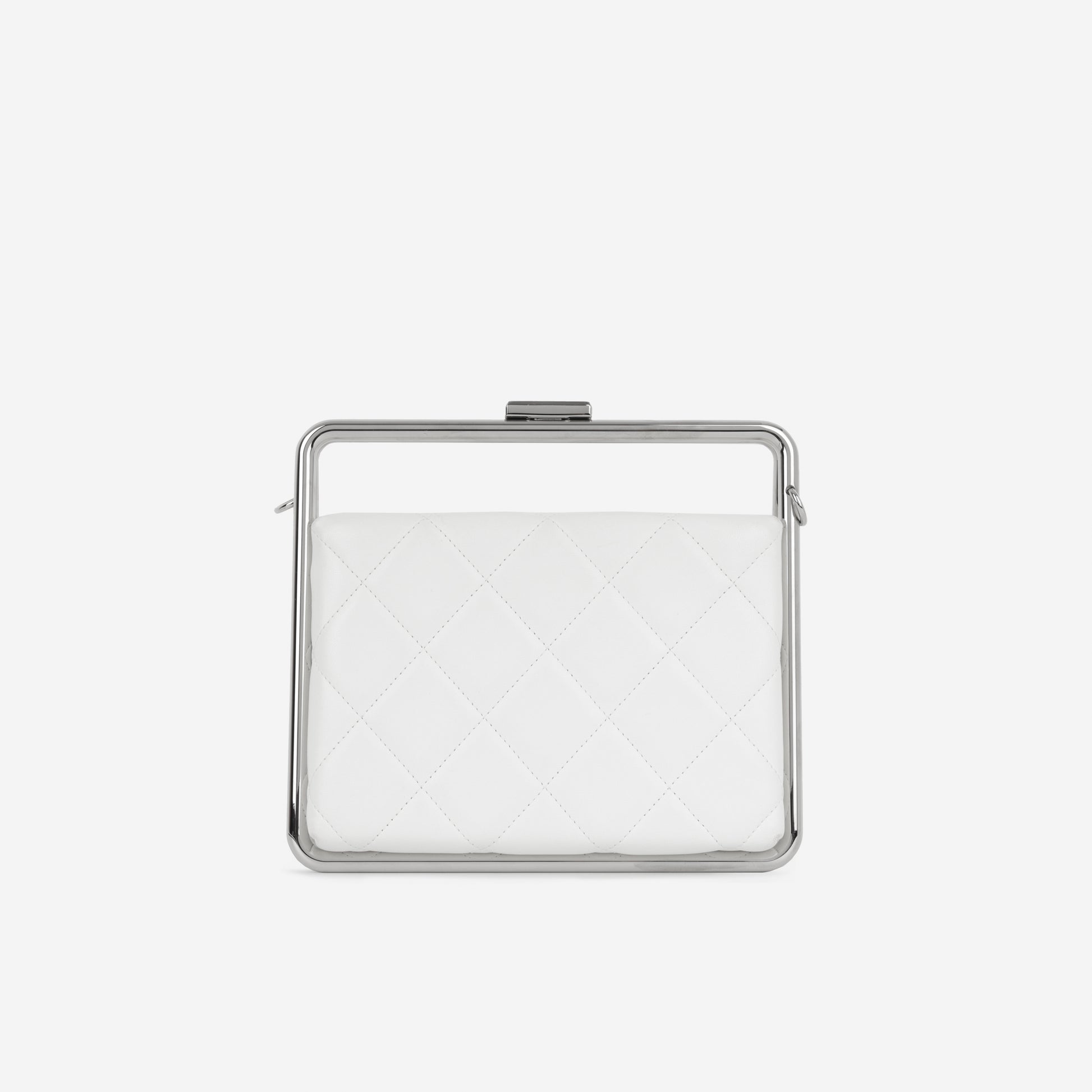 Its versatile design allows it to be styled as a clutch for formal occasions or worn as a satchel with the optional strap for a more relaxed, fashion-forward look. The crisp white leather contrasts beautifully with the cool silver hardware, making it an effortlessly chic choice year-round.