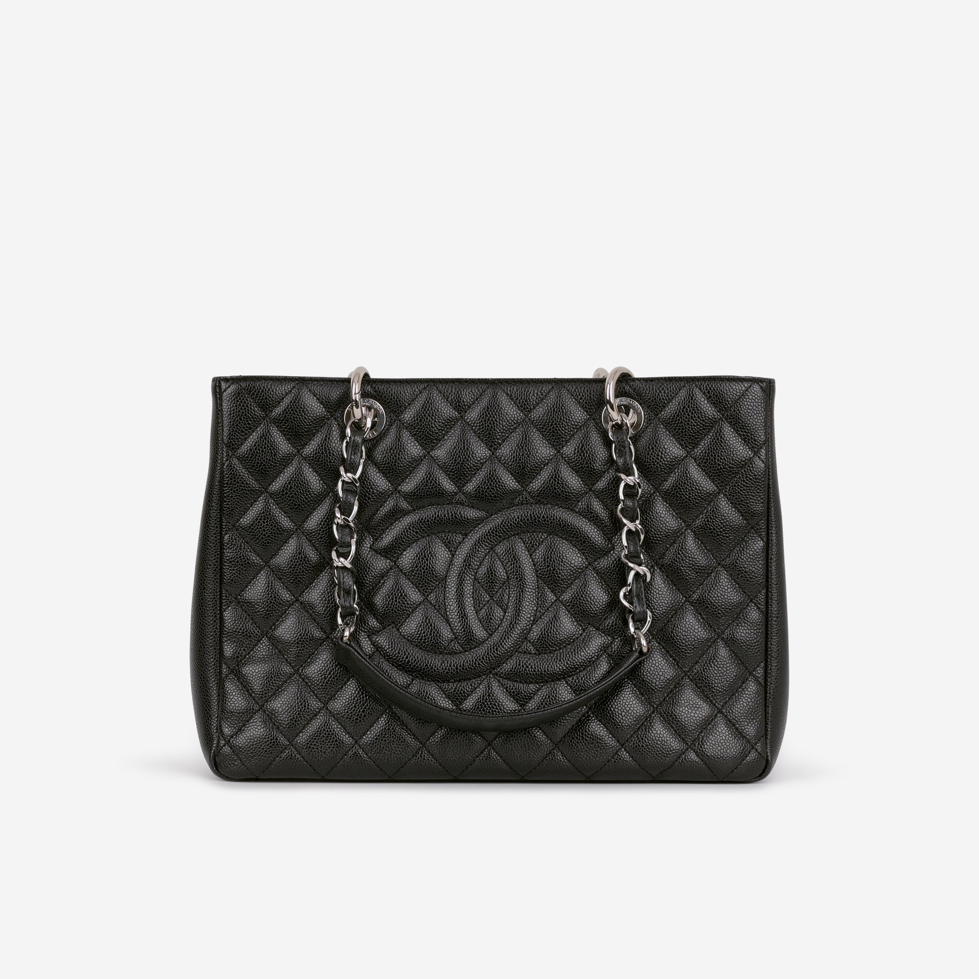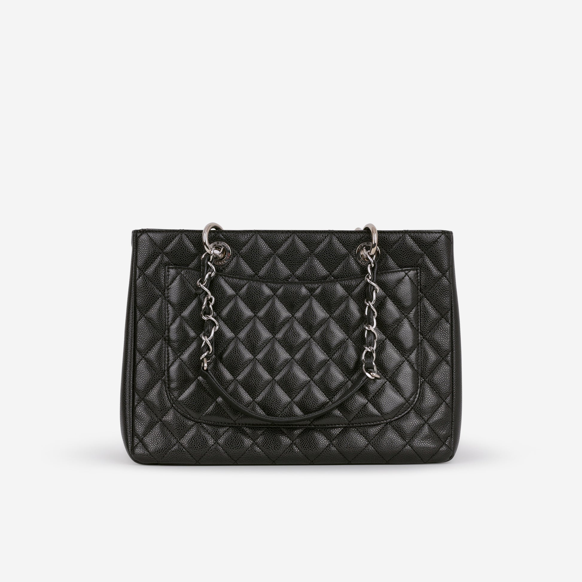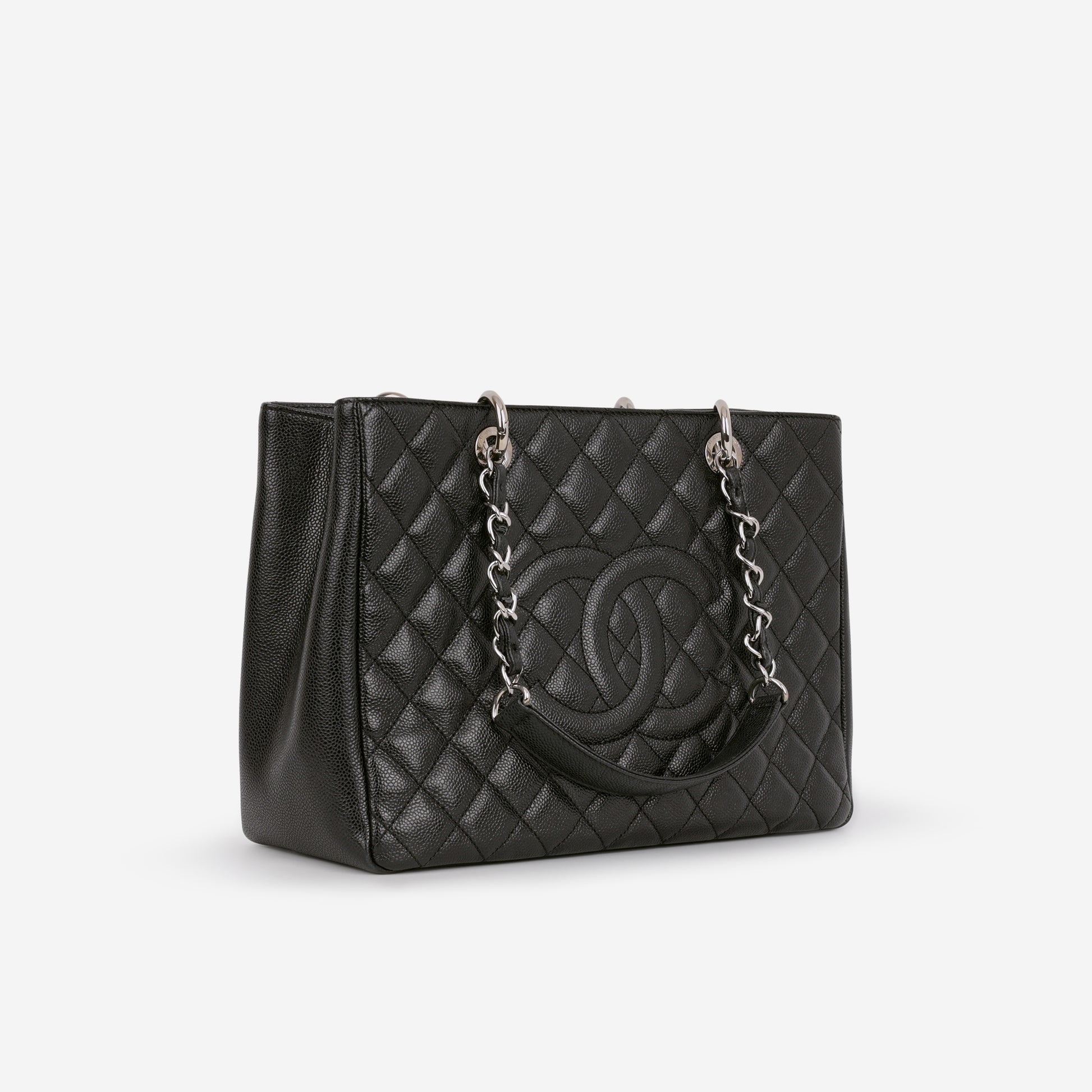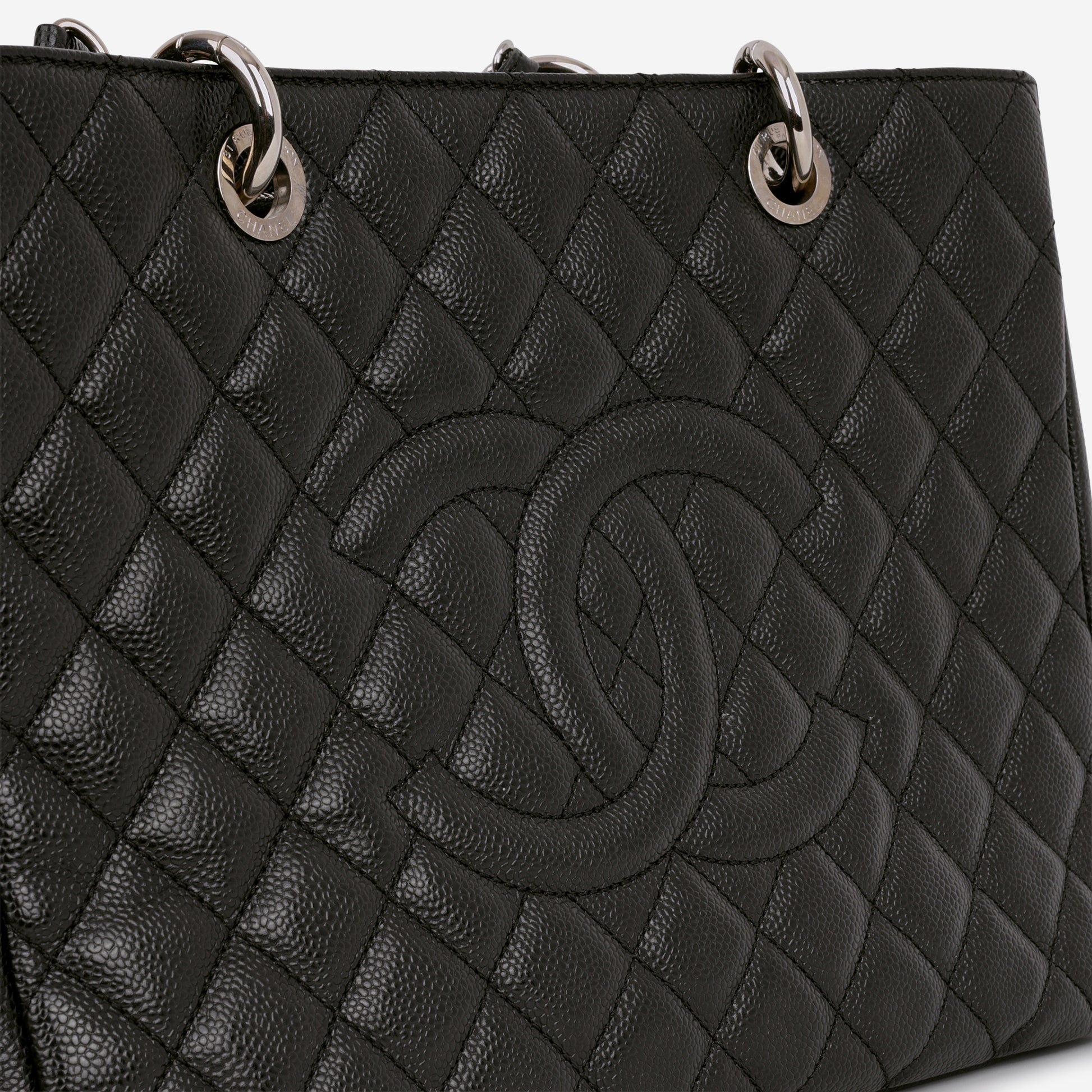 The Chanel GST (Grand Shopping Tote) in black caviar leather with silver hardware from the 2014 production. A classic tote silhouette featuring dual shoulder straps and CC logo detailing.