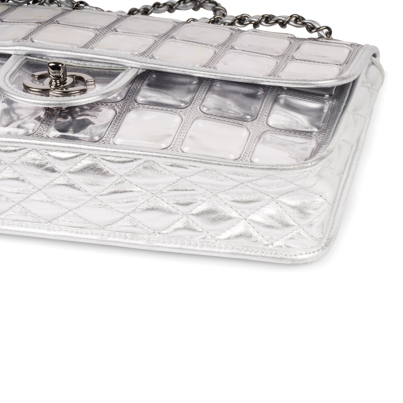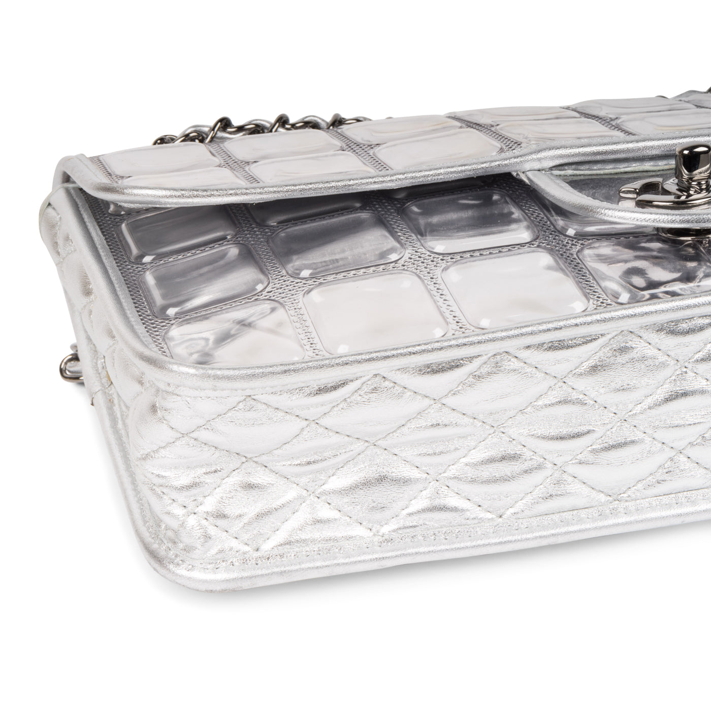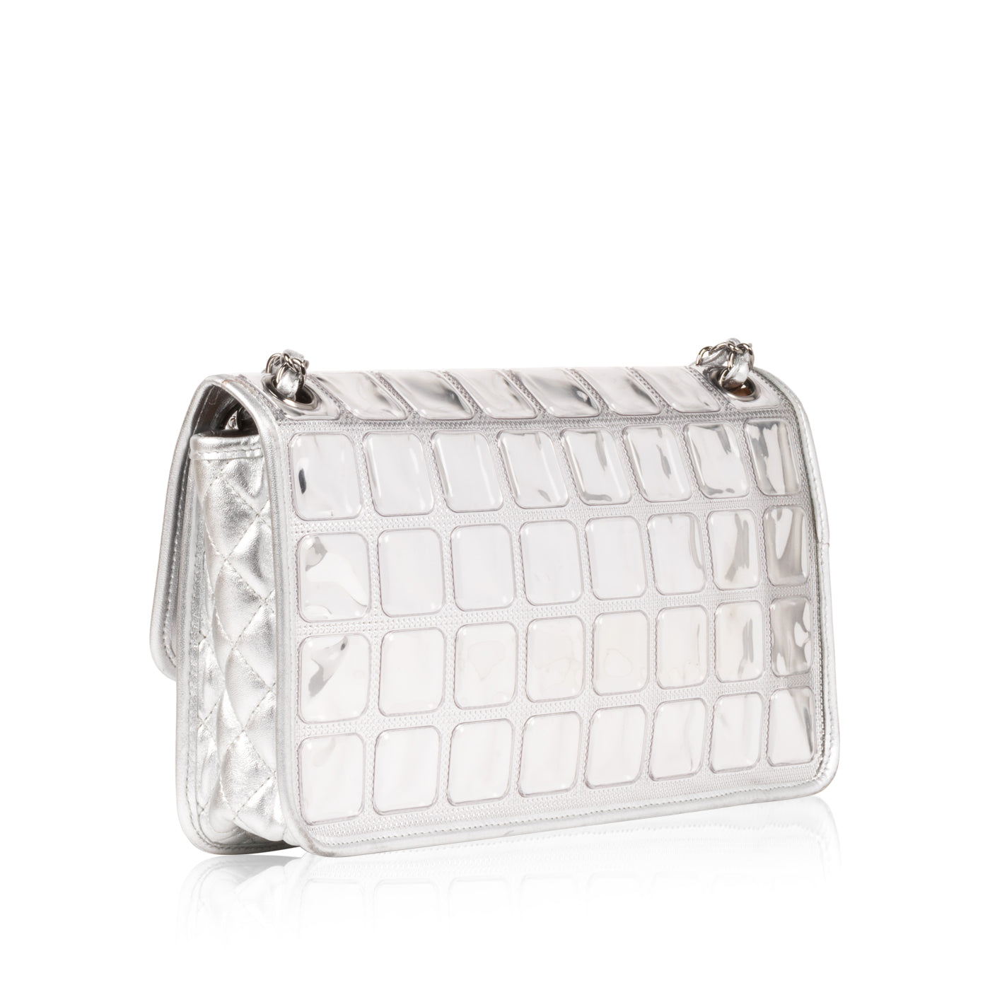 Attention all cool-girls with a love for luxury statement pieces, this is not your mum's Chanel. This metallic classic flap is definitely not your average every day bag, but there's no reason why it can't be. Featuring mirror-like squares emblemed throughout with quilted, silver leather sides, this iconic flap bag perfectly balances the classic and the contemporary. For the modern young women with an edgy sense of style, this classic flap is an absolute must-have. The ideal companion to accompany you on any occasion, dress this gem up with a sleek LBD or down with a pair of black jeans and chunky Chanel sneakers. A bag that will remain timeless, regardless of style or appearance, a classic will stay a classic. Stylish and effortlessly cool, this bag is a well-worthy investment and addition to any luxury handbag collection.