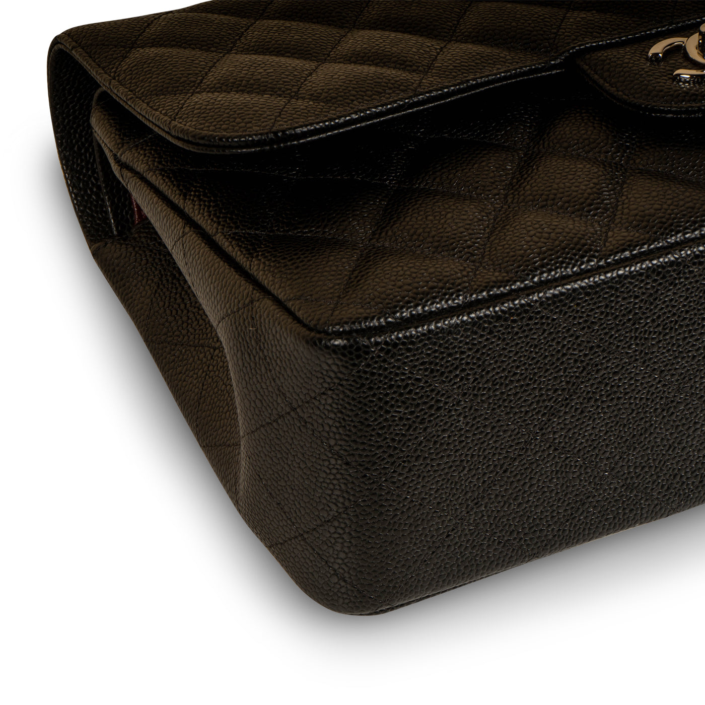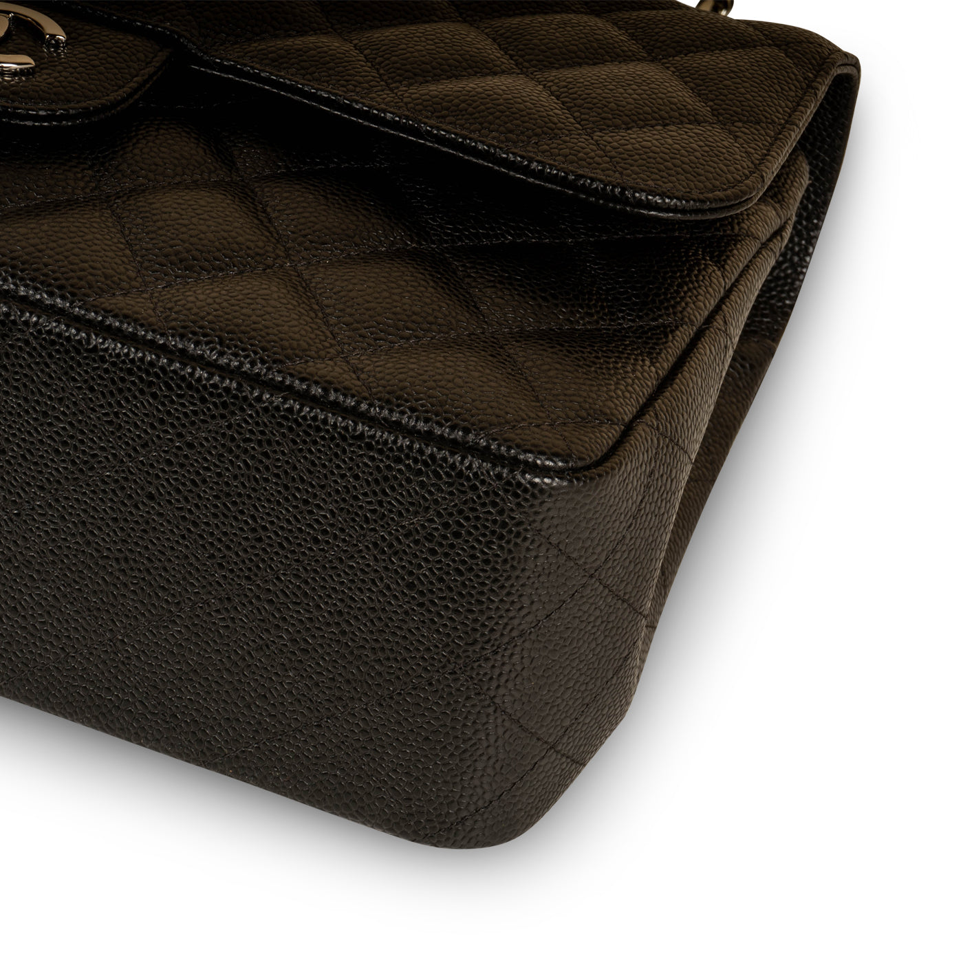 Chanel continues to present its signature line of Classic Flap bags. Under the creative direction of Karl Lagerfeld, the Classic Flap is perhaps the most acclaimed bag in all of fashion history. Timeless, elegant and sophisticated, it's no wonder the Classic Flap is, well, a classic. Featuring its infamous quilted caviar leather and interwoven chain / leather strap, the Jumbo is an absolute must-have in any luxury handbag collection. Not only is this highly coveted, stunning black bag the perfect compliment to pretty much anything you have in your wardrobe, but it's also an investment piece that will never lose its value. Embodying elegance and traditional femininity to a T, a Chanel bag is a purchase you won't ever regret.