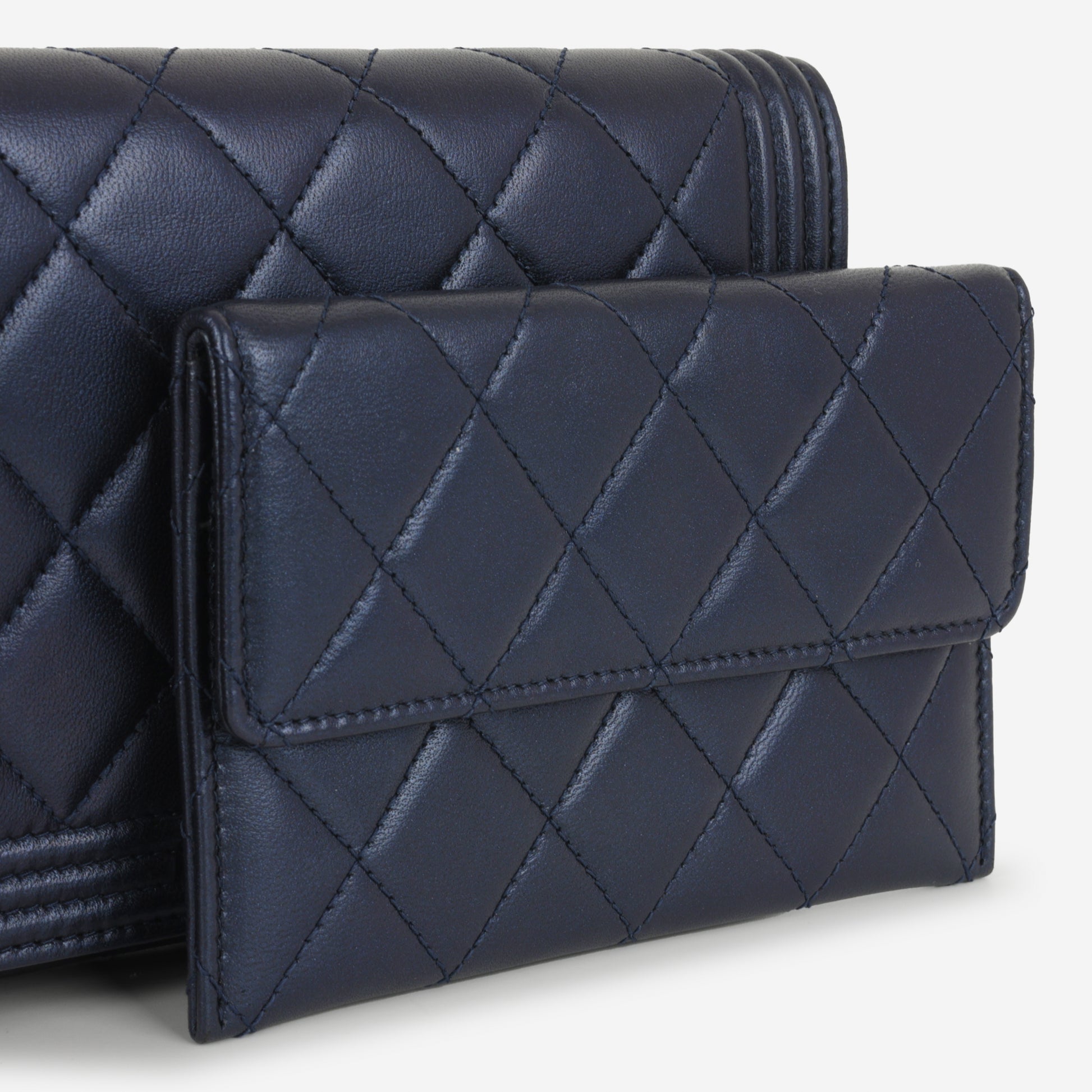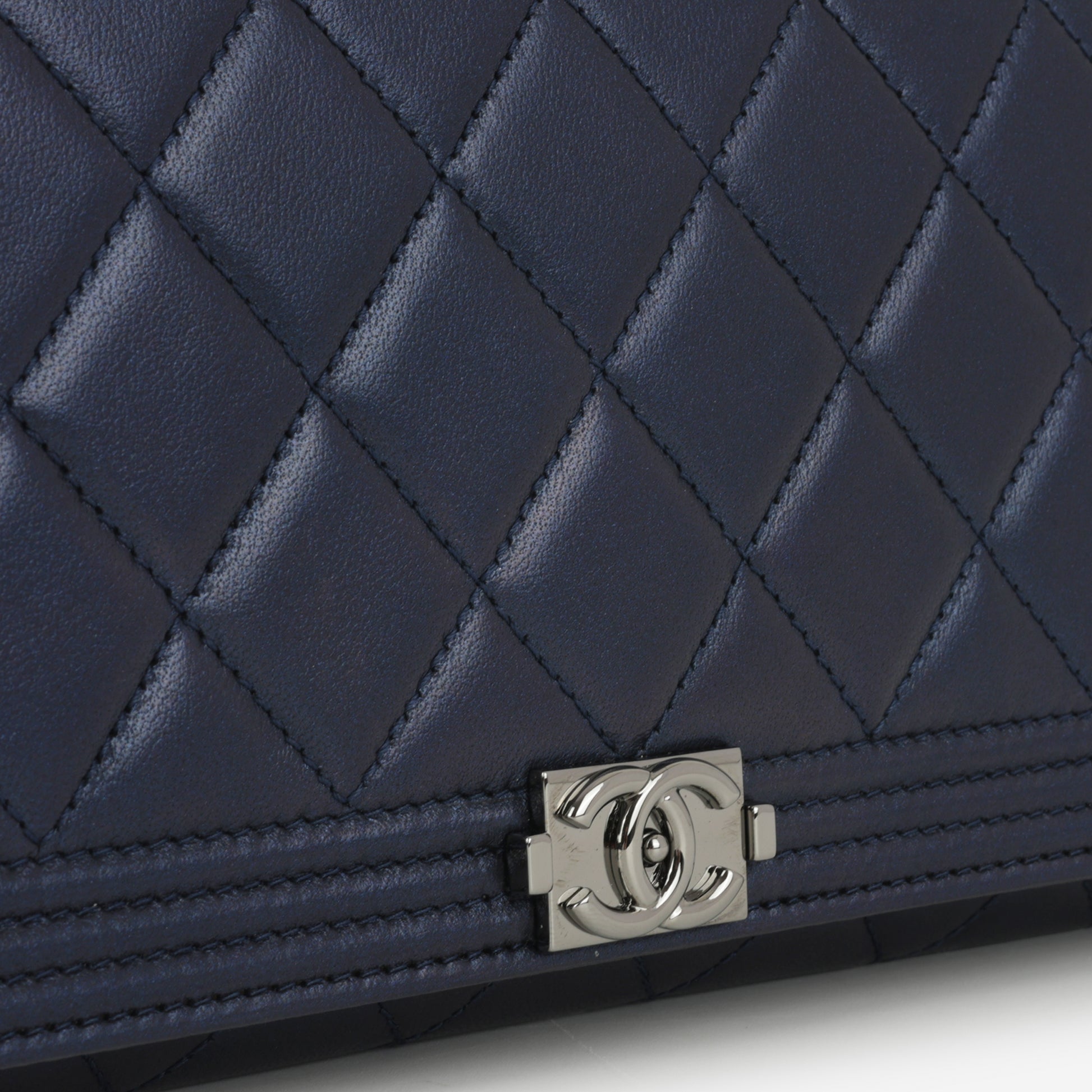 The Chanel Boy Wallet on Chain (WOC) is a sleek, stylish mini version of the iconic Boy bag. Crafted in iridescent navy leather with ruthenium hardware, this shoulder chain WOC combines edgy sophistication with compact practicality. Perfect for day-to-night wear, it holds all your essentials while adding a bold statement to any outfit. A timeless, highly sought-after Chanel accessory and must-have for collectors. Authentic and available now from a trusted reseller.