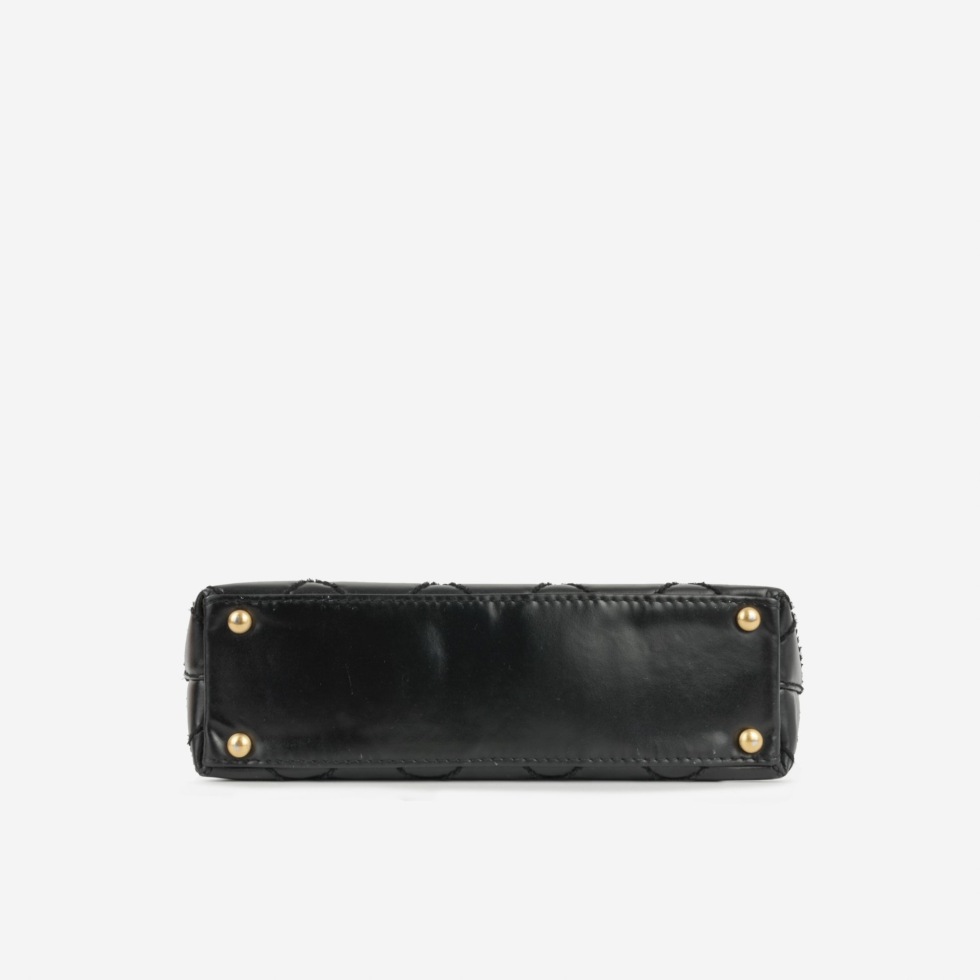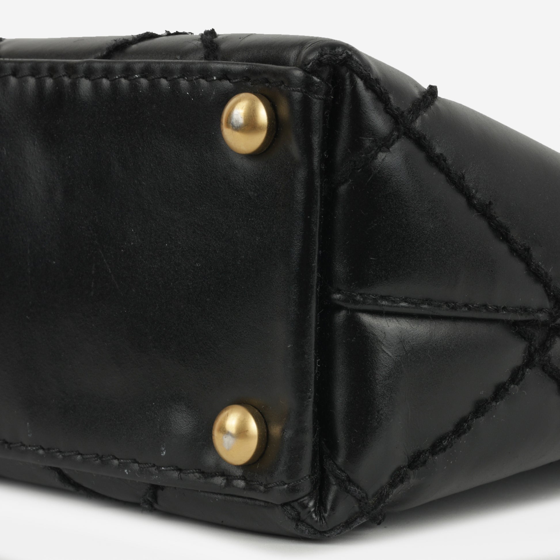 The Chanel Small Surpique Stitch Tote in black calfskin combines classic elegance with modern design. Crafted from smooth leather with signature topstitch detailing, this compact tote features a structured silhouette and antique gold hardware, making it a versatile accessory for day-to-night wear.